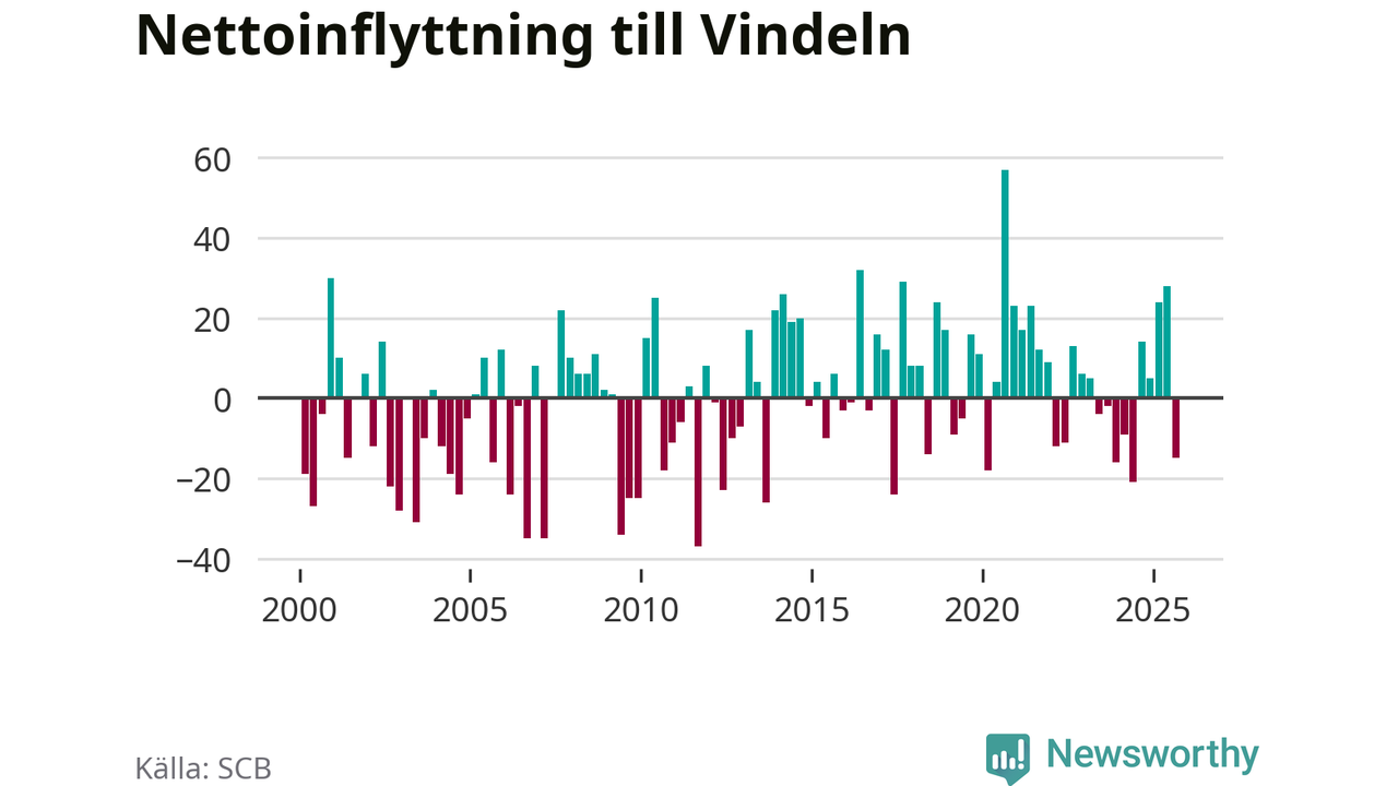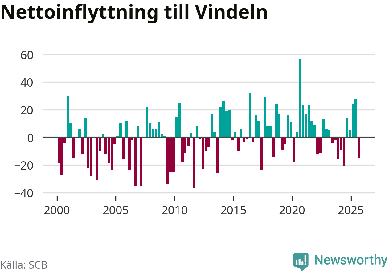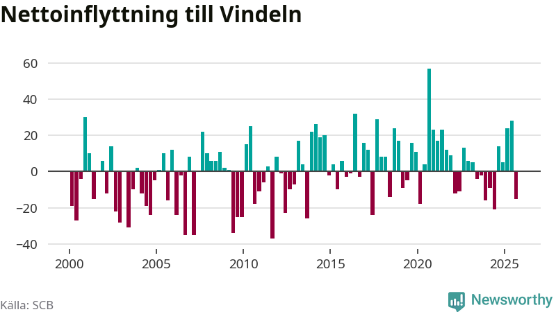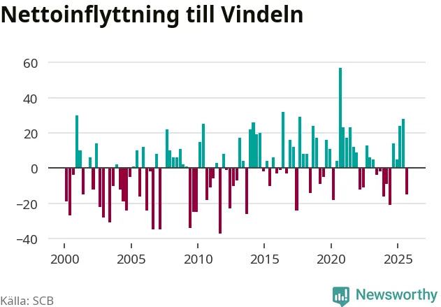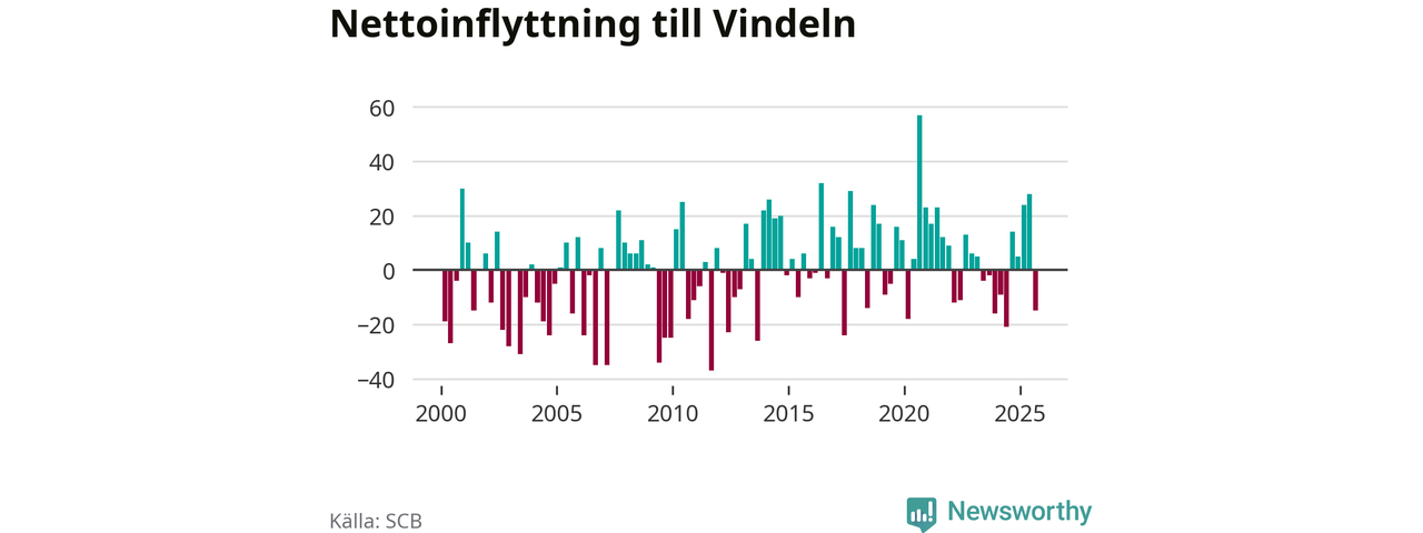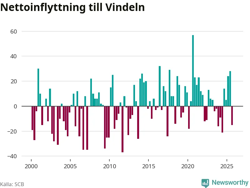 Under tredje kvartalet 2025 flyttade 82 personer till kommunen medan 97 personer flyttade därifrån. Det är historiskt sett en stor utflyttning under ett kvartal. Sedan seklets början har Vindeln oftast haft ett positivt flyttnetto.