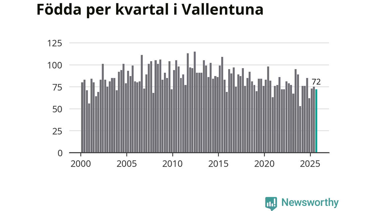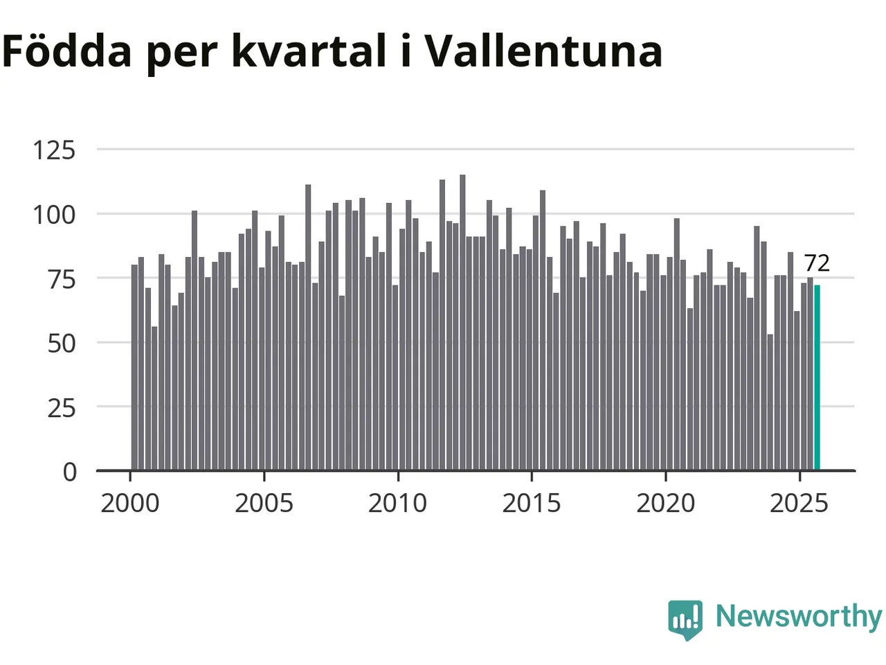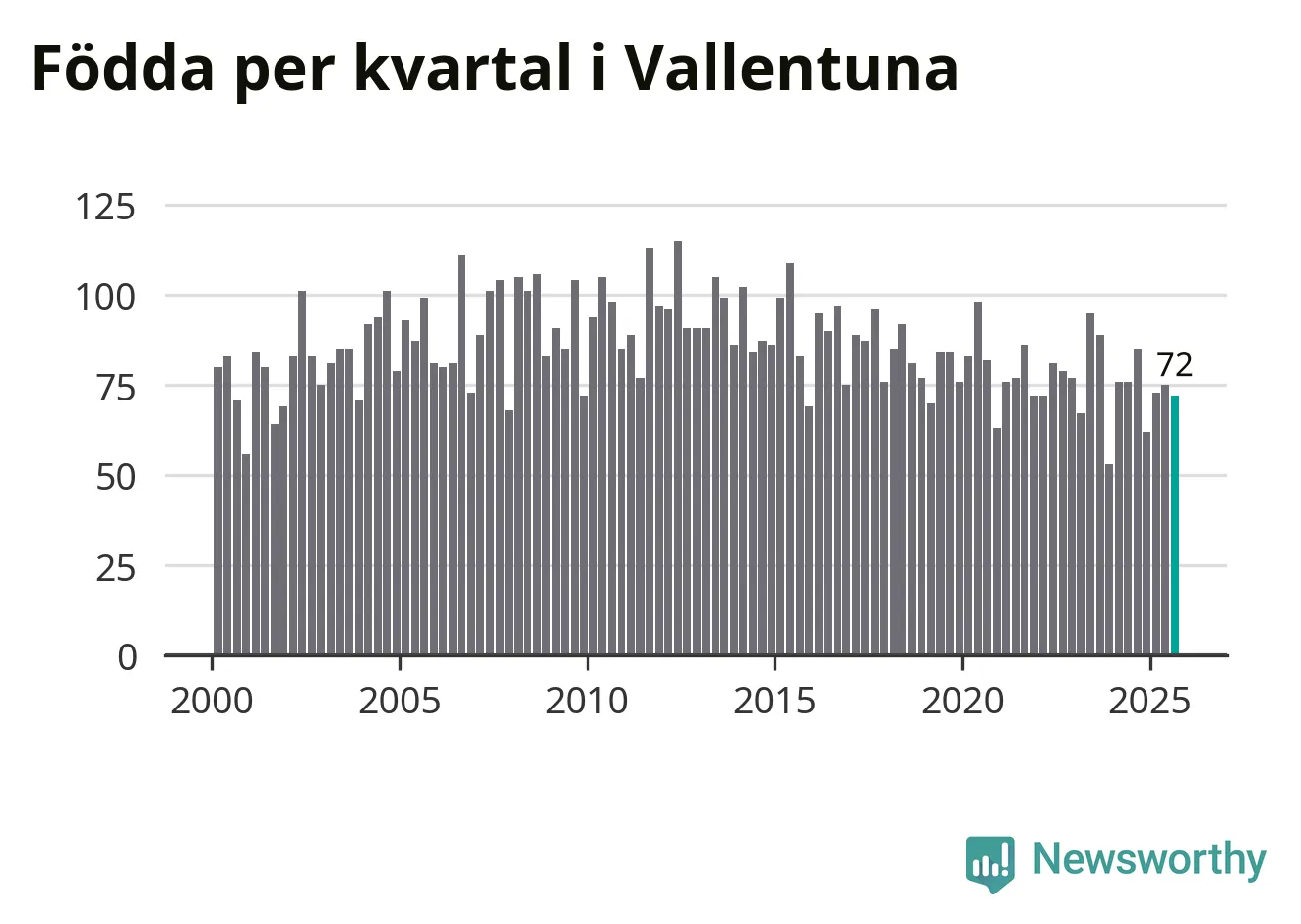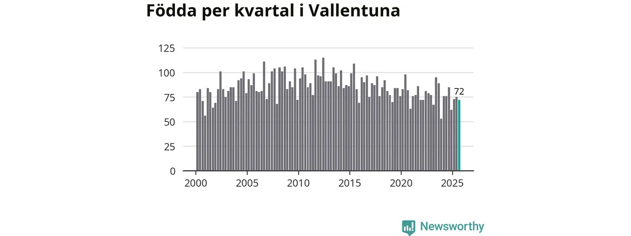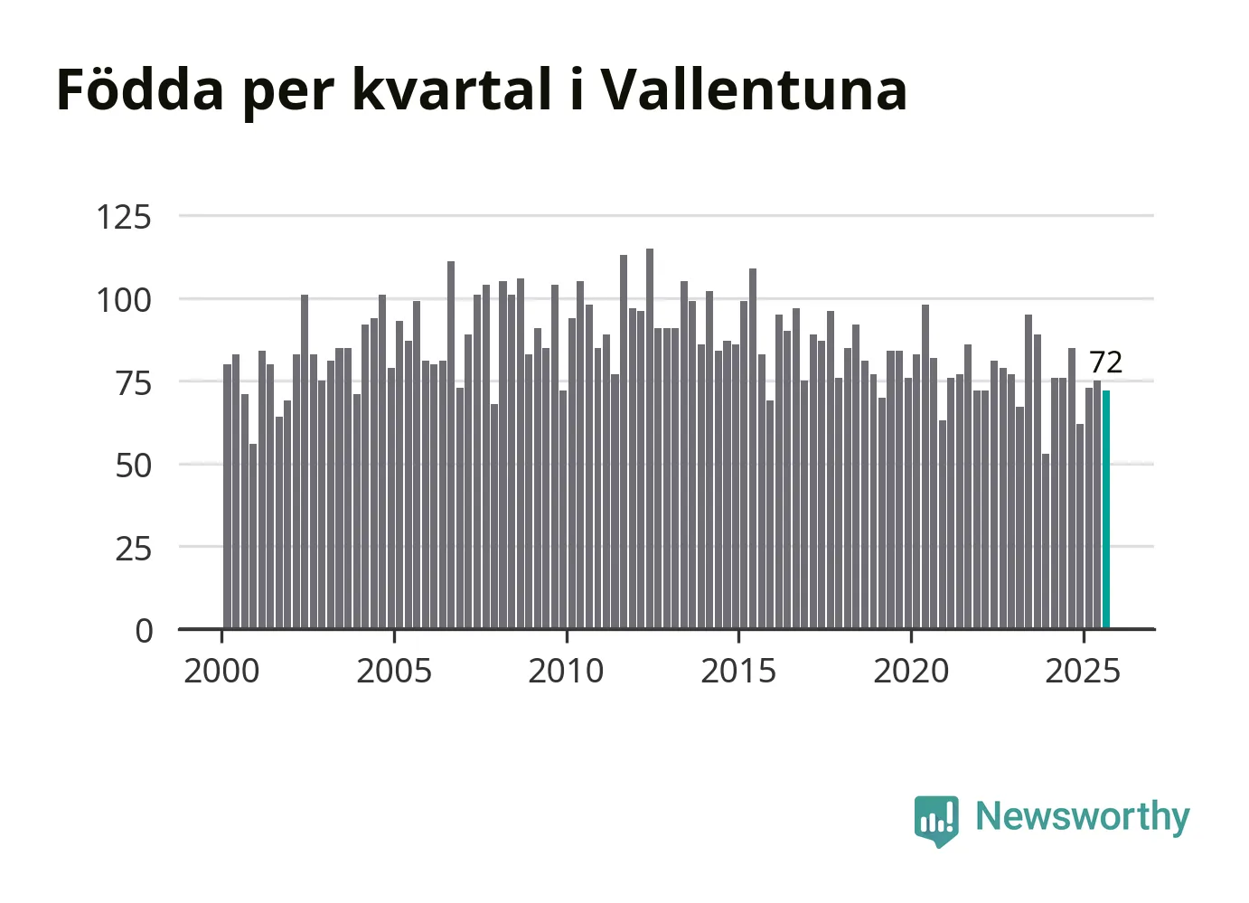 Enligt SCB:s siffror föddes 72 barn i Vallentuna under det senaste kvartalet. Samtidigt avled relativt få – 31 personer. Vallentuna hade alltså ett positivt födelsenetto, vilket kommunen historiskt sett nästan alltid har haft.