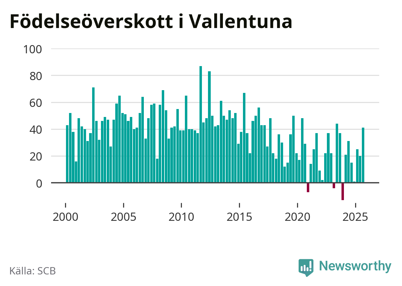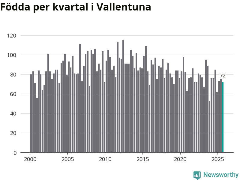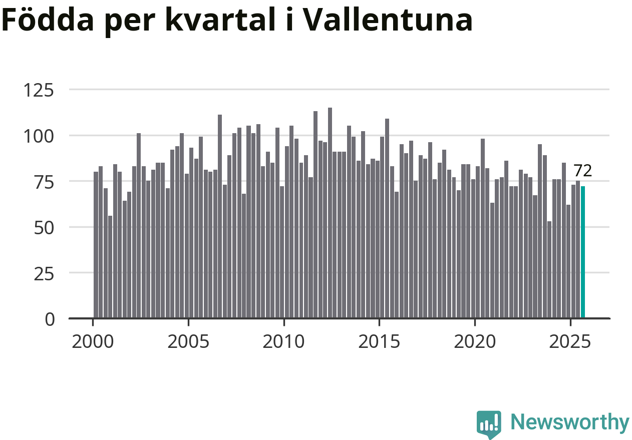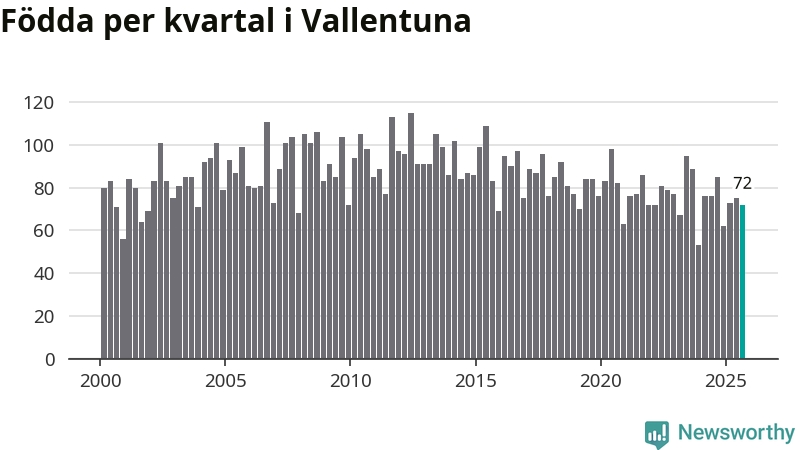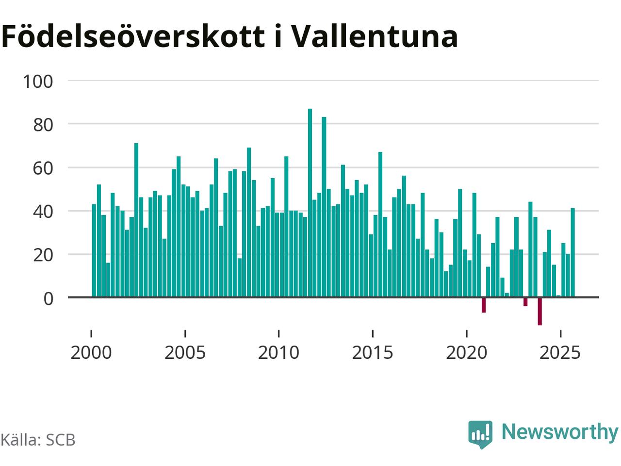 Enligt SCB:s siffror föddes 72 barn i Vallentuna under det senaste kvartalet. Samtidigt avled relativt få – 31 personer. Vallentuna hade alltså ett positivt födelsenetto, vilket kommunen historiskt sett nästan alltid har haft.