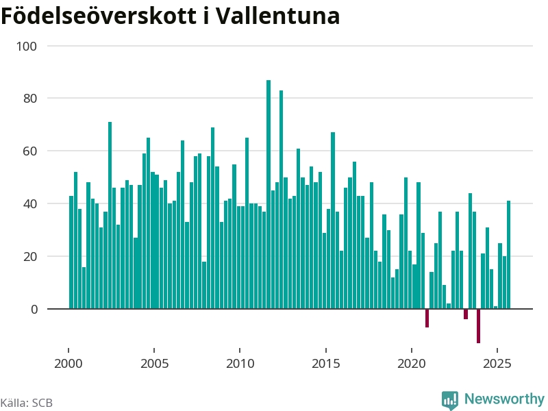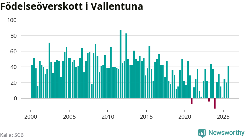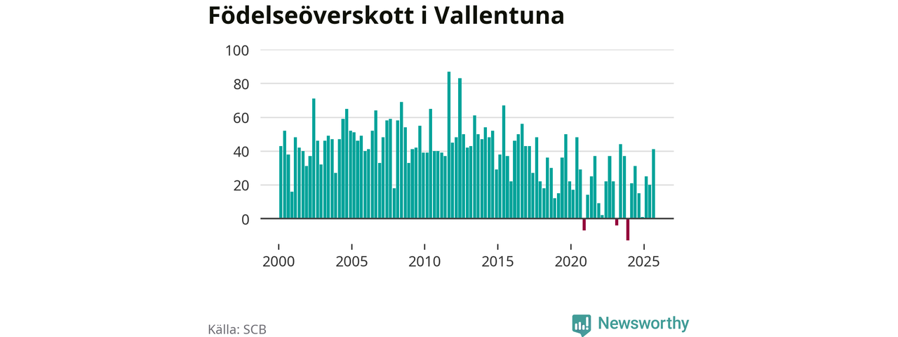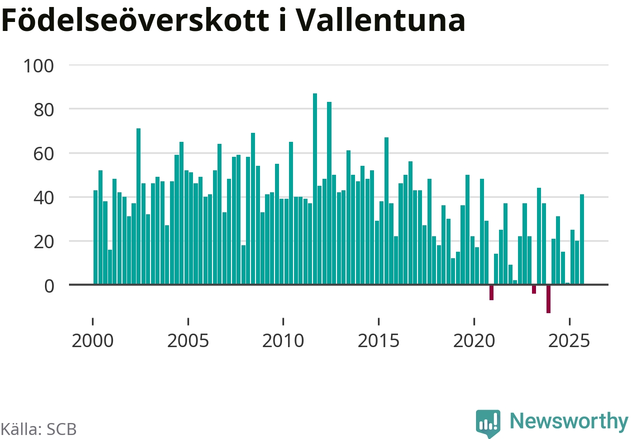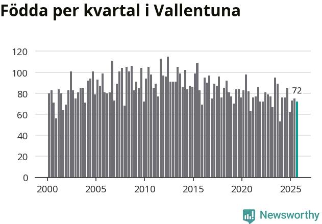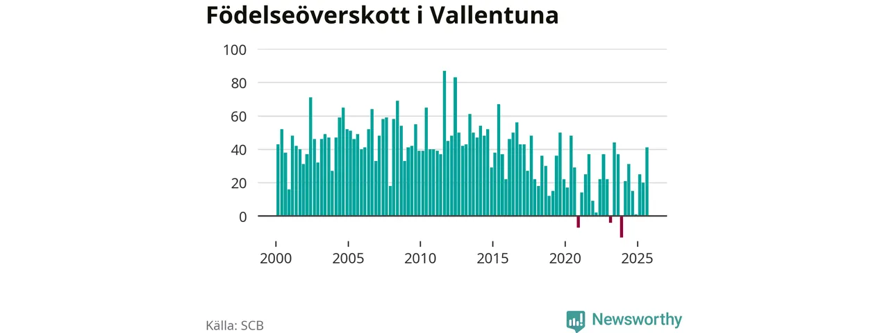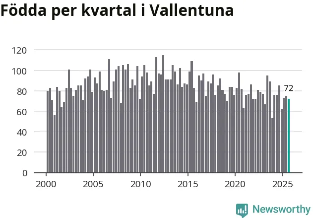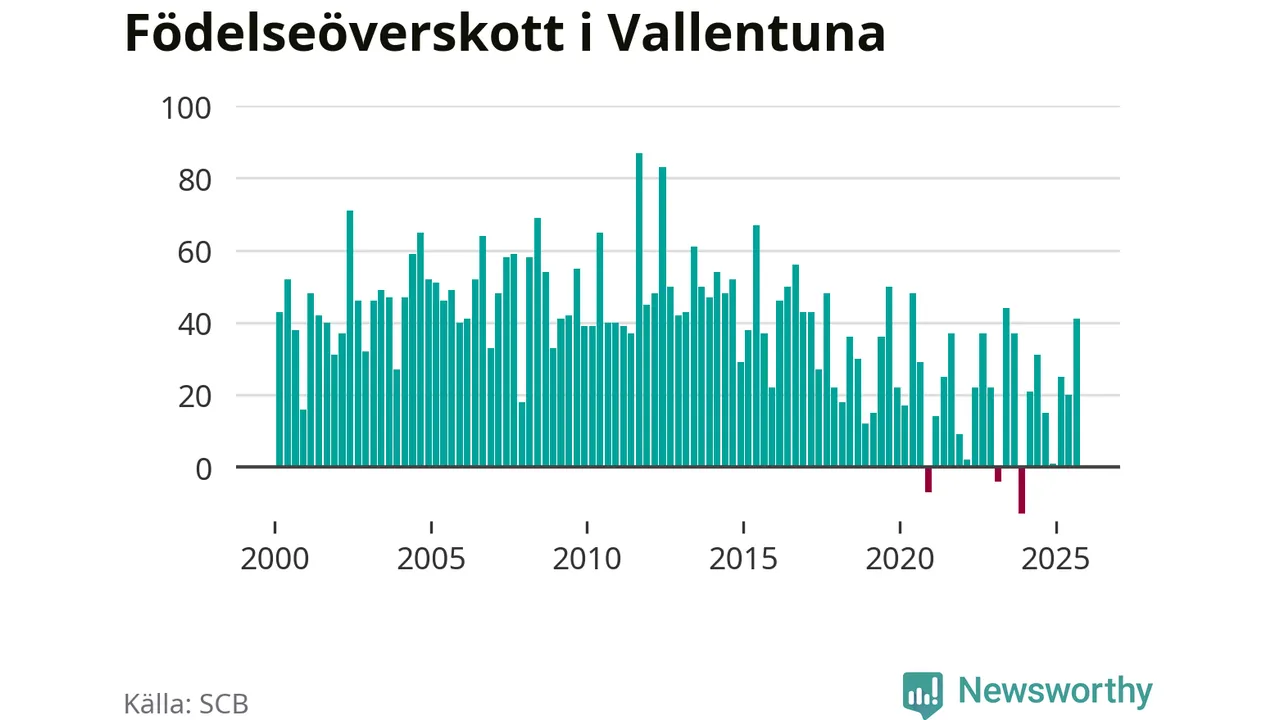 Enligt SCB:s siffror föddes 72 barn i Vallentuna under det senaste kvartalet. Samtidigt avled relativt få – 31 personer. Vallentuna hade alltså ett positivt födelsenetto, vilket kommunen historiskt sett nästan alltid har haft.
