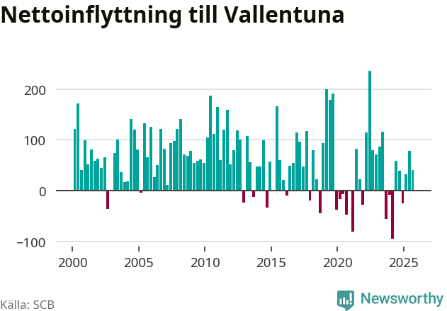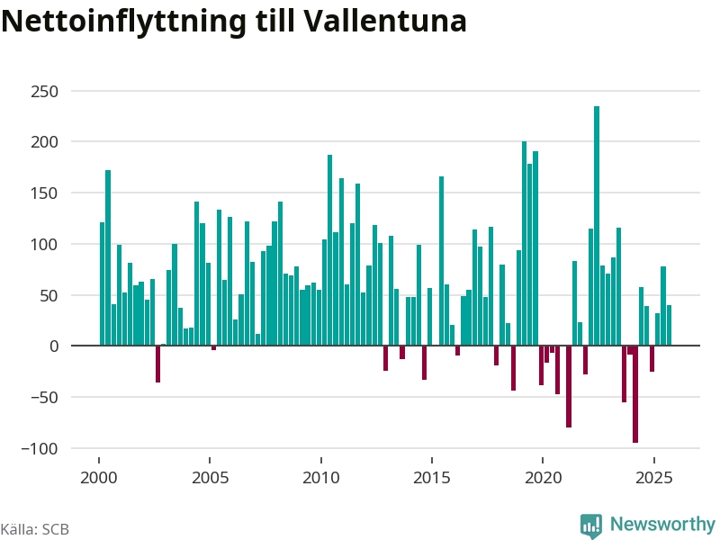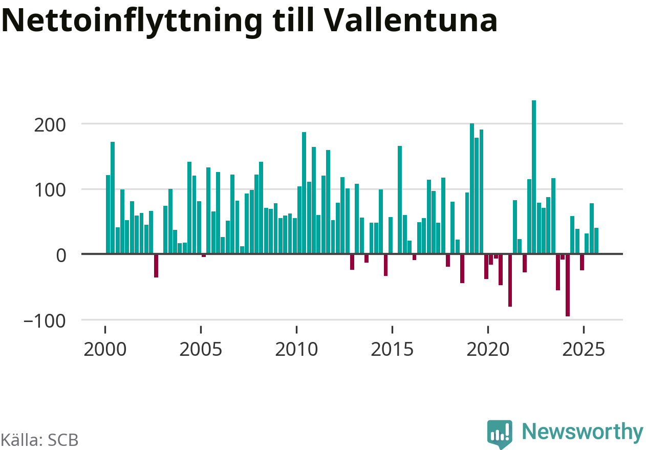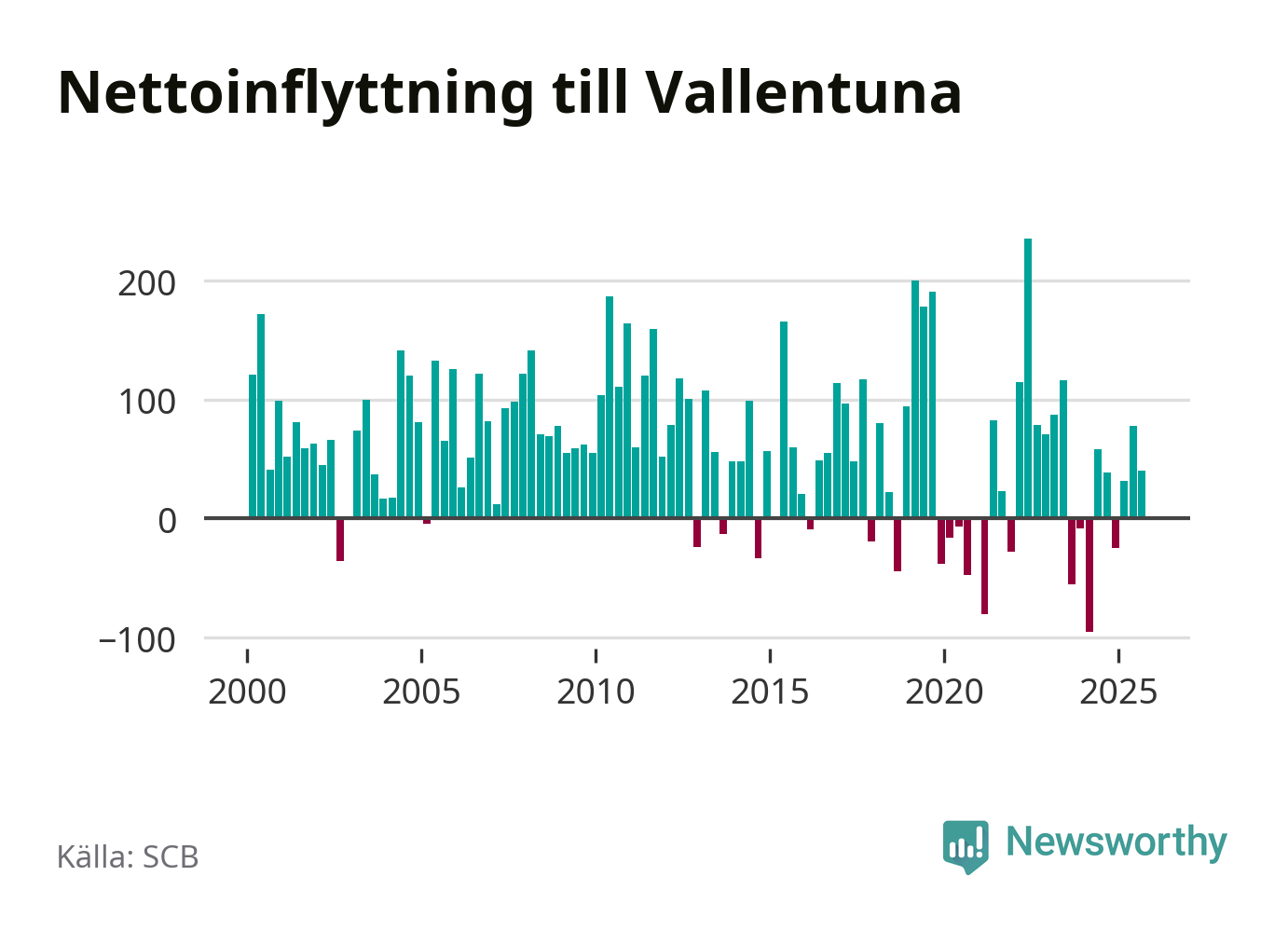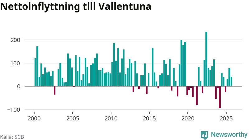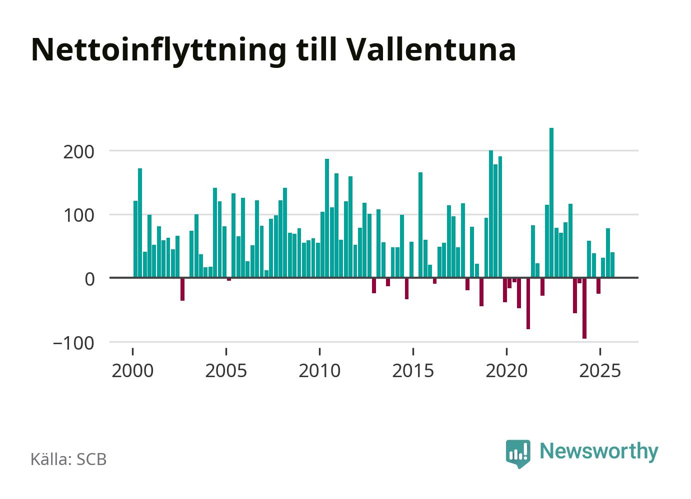 Under tredje kvartalet 2025 flyttade 681 personer till kommunen medan 641 personer flyttade därifrån. Det är historiskt sett en stor inflyttning under ett kvartal – men samtidigt var utflyttningen relativt stor. Sedan seklets början har Vallentuna oftast haft ett positivt flyttnetto, inklusive det senaste kvartalet.