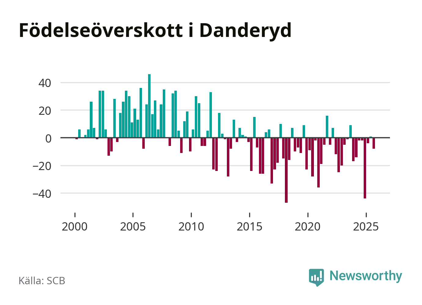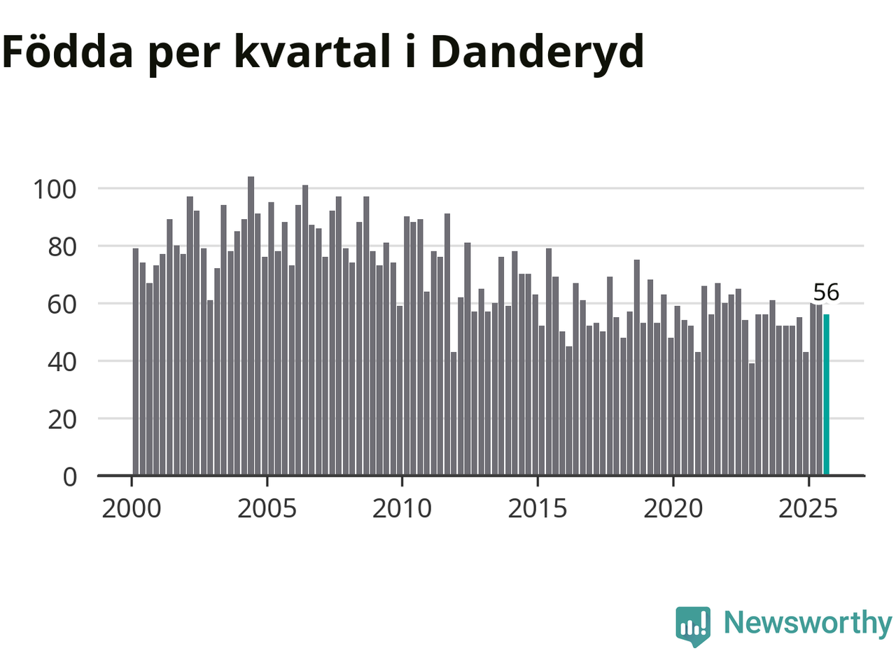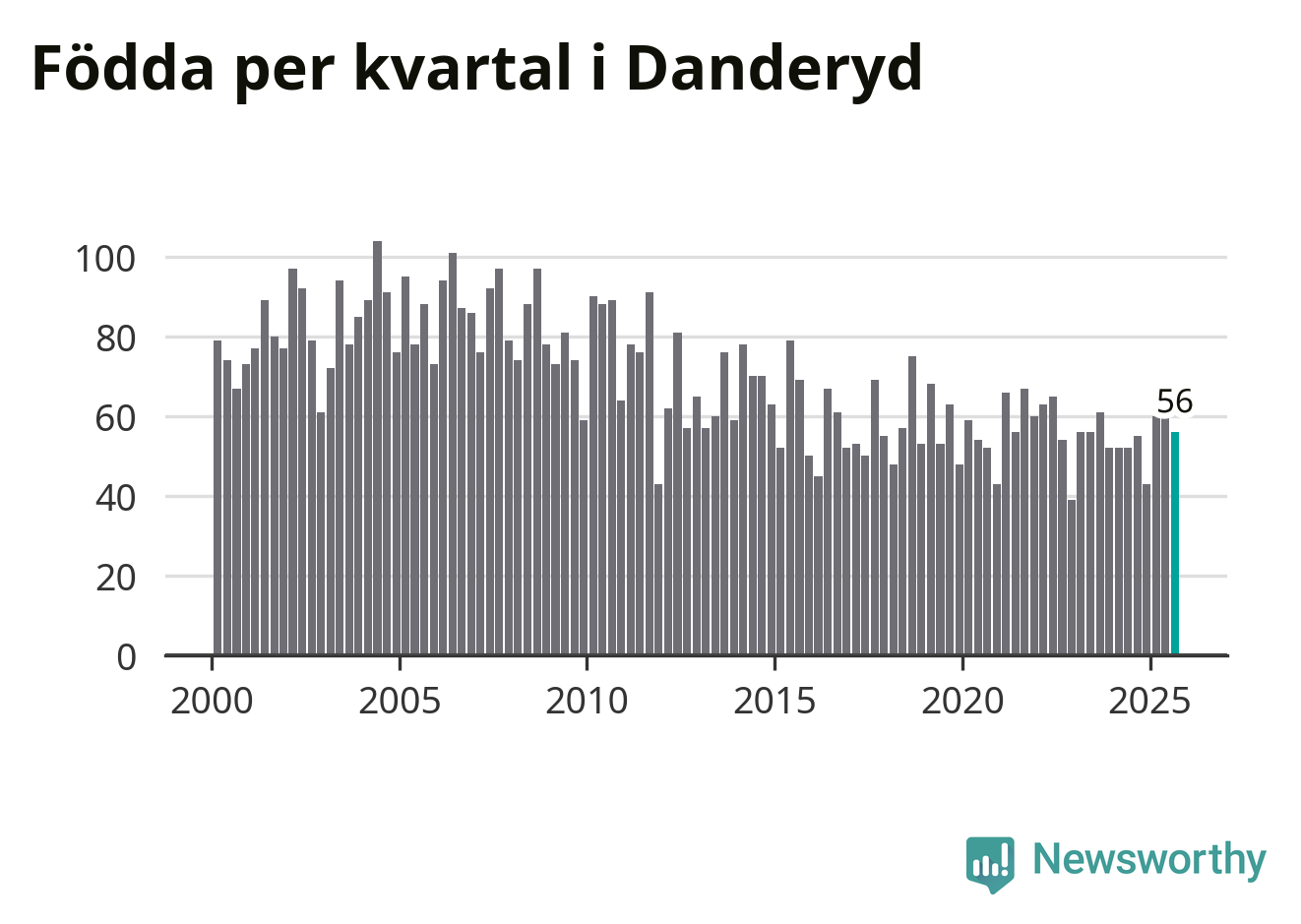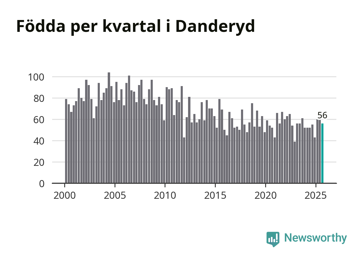 Enligt SCB:s siffror föddes 56 barn i Danderyd under det senaste kvartalet. Samtidigt avled 64 personer. Skillnaden mellan antal födda och döda är så liten att det inte går att säga om det beror på något annat än SCB:s röjandeskydd. Kommunen har oftast haft negativt födelsenetto tidigare.