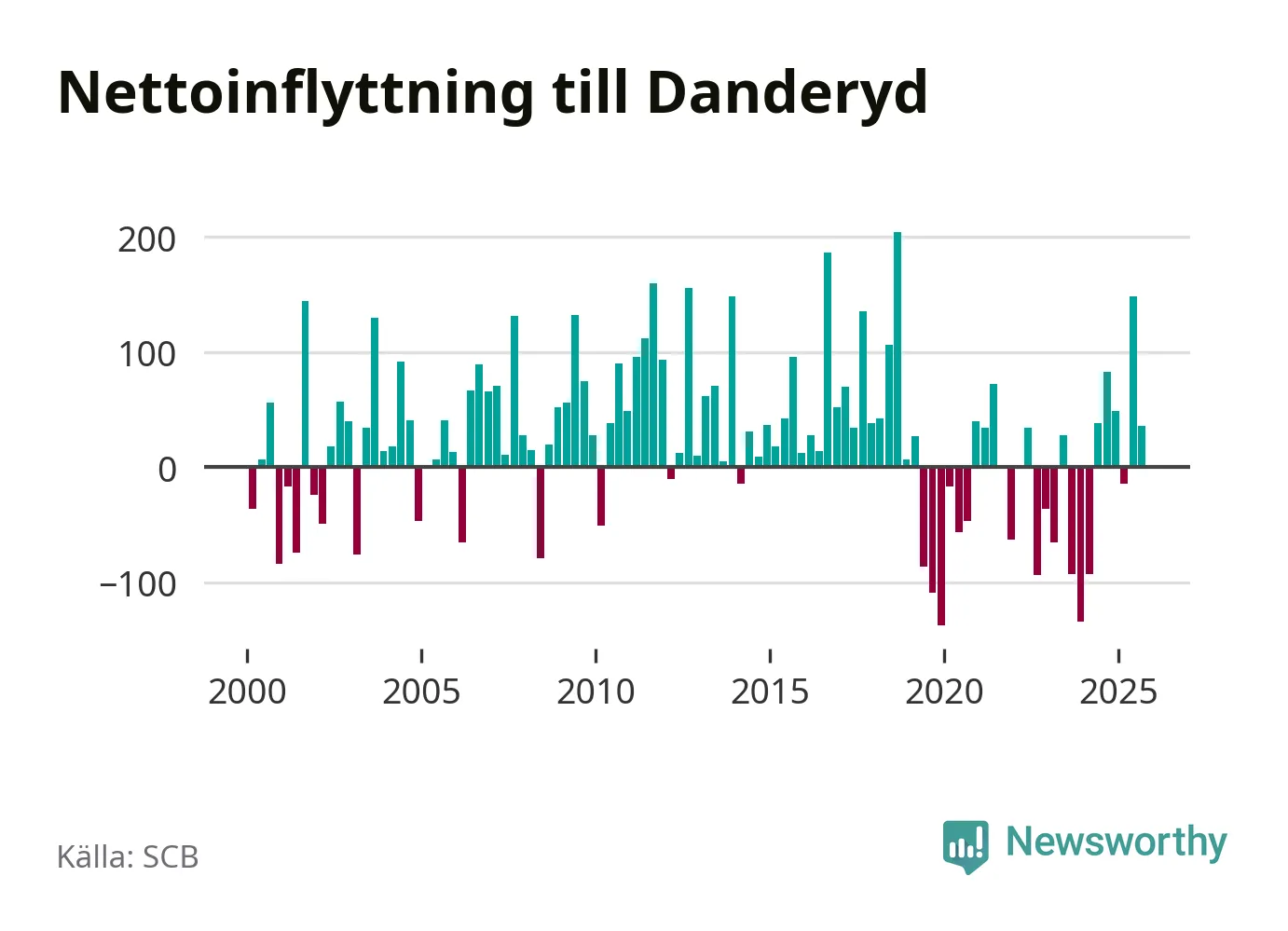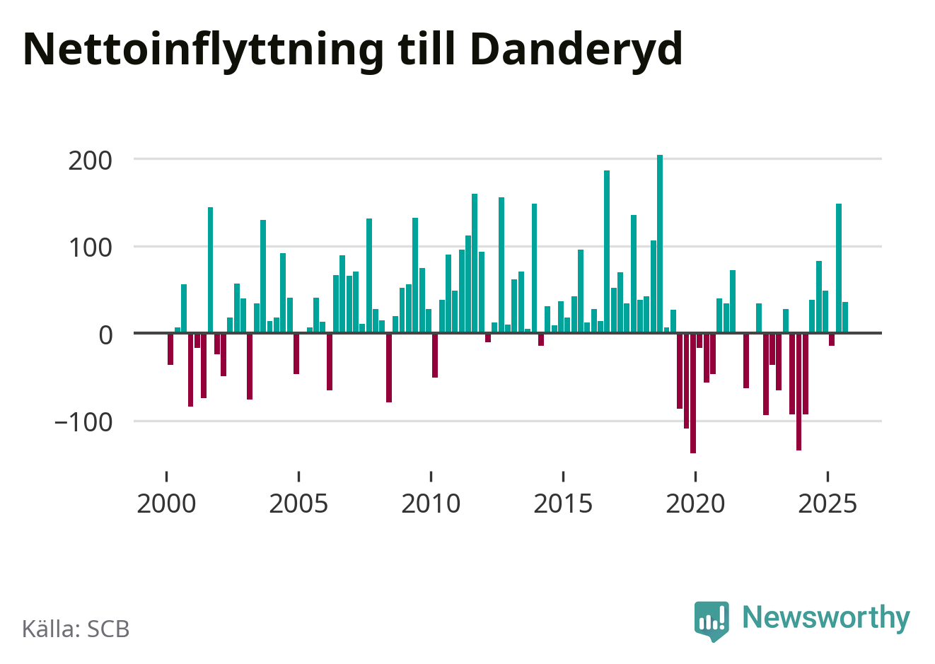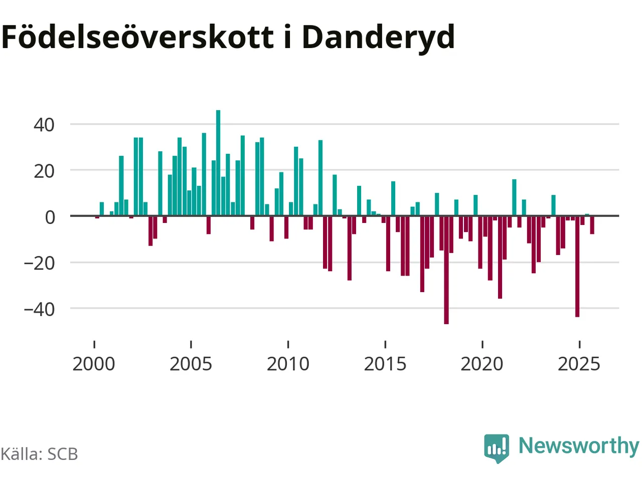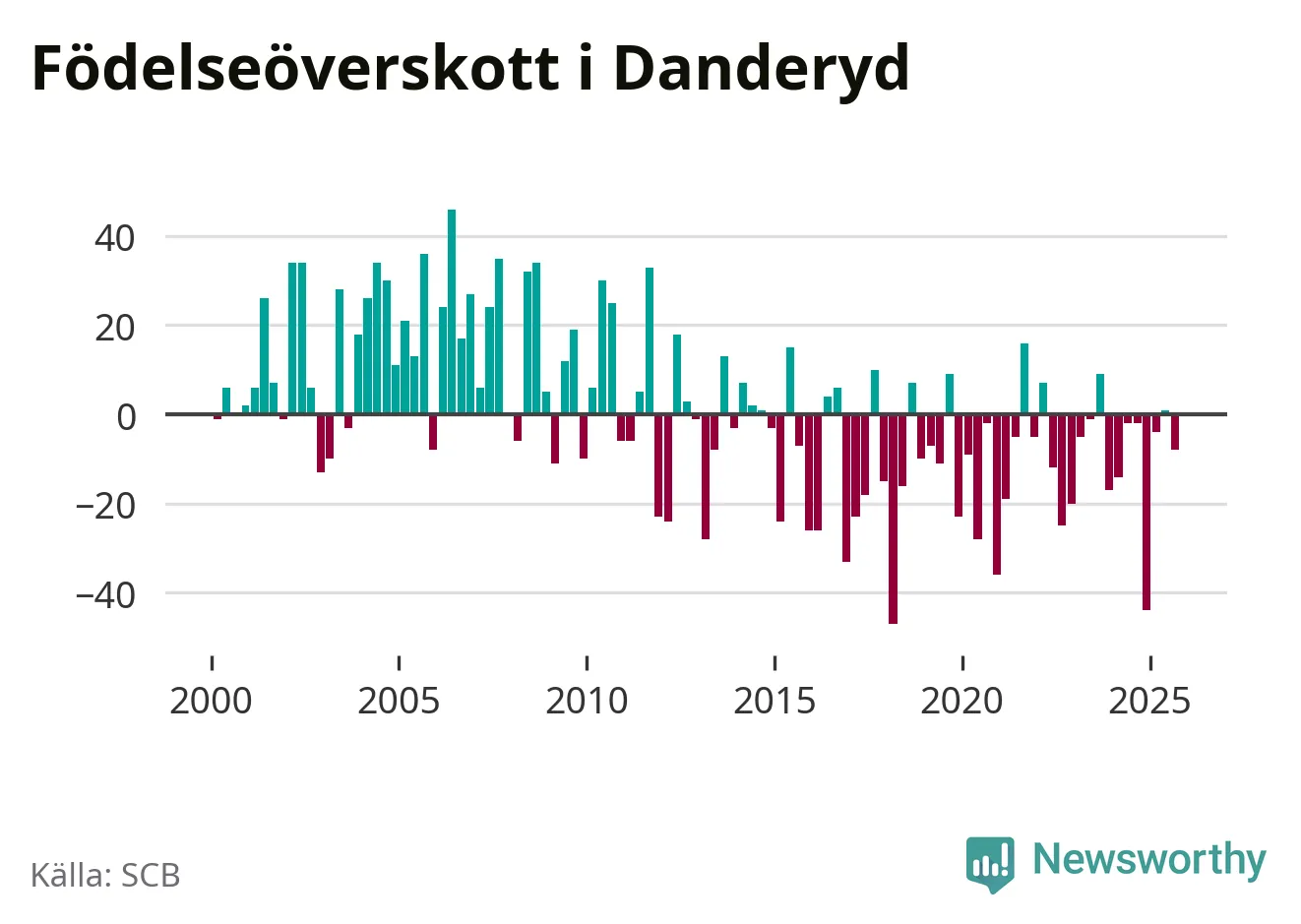 Enligt SCB:s siffror föddes 56 barn i Danderyd under det senaste kvartalet. Samtidigt avled 64 personer. Skillnaden mellan antal födda och döda är så liten att det inte går att säga om det beror på något annat än SCB:s röjandeskydd. Kommunen har oftast haft negativt födelsenetto tidigare.