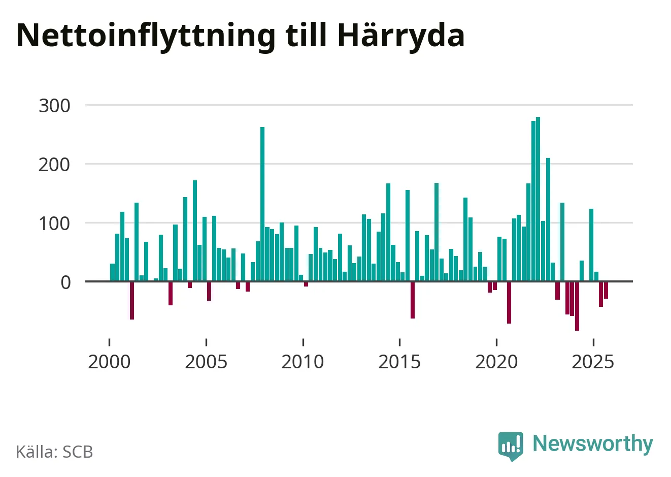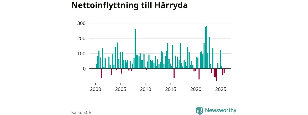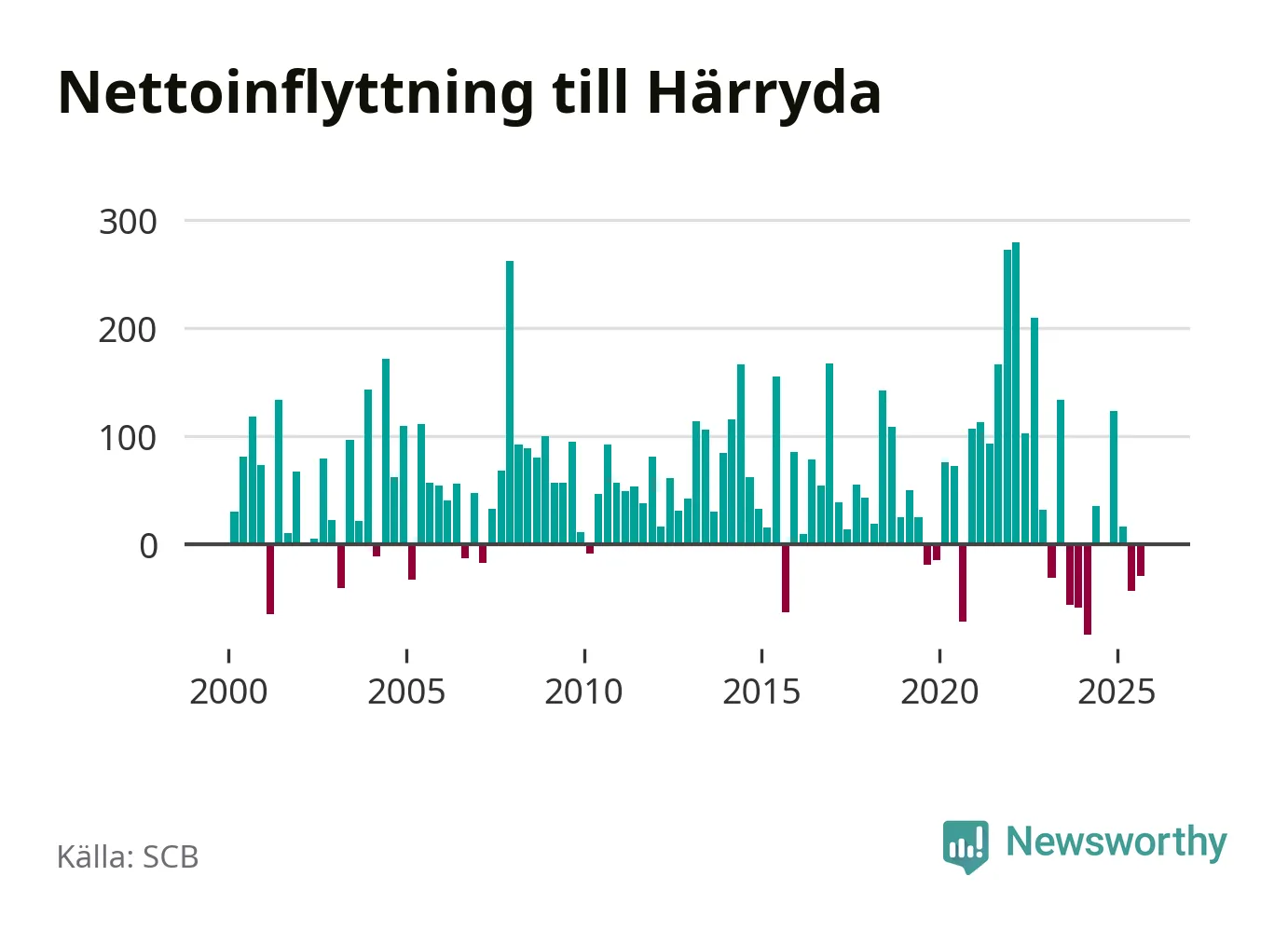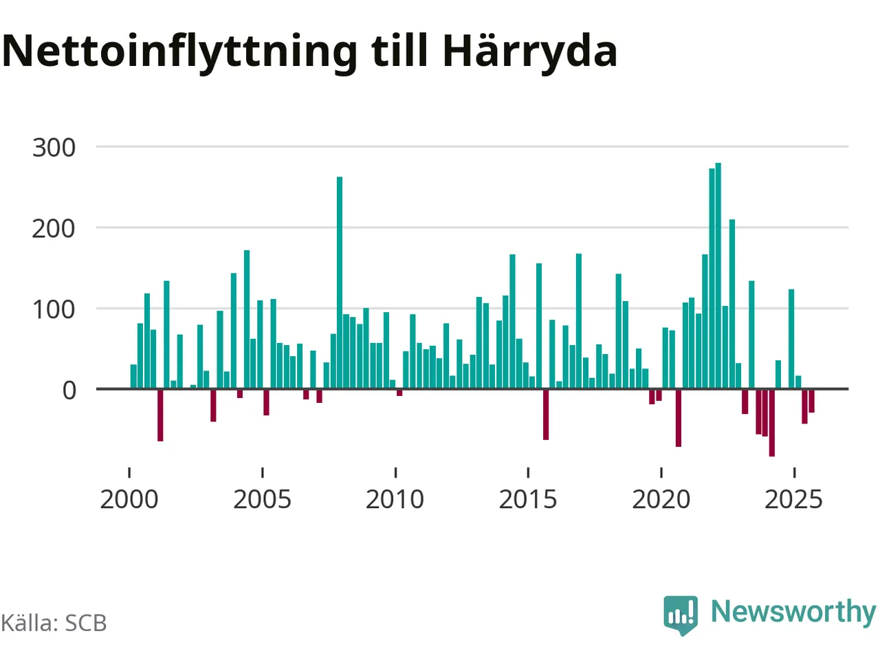 Under tredje kvartalet 2025 flyttade 615 personer till kommunen medan 644 personer flyttade därifrån. Det är historiskt sett en stor utflyttning under ett kvartal. Sedan seklets början har Härryda oftast haft ett positivt flyttnetto.