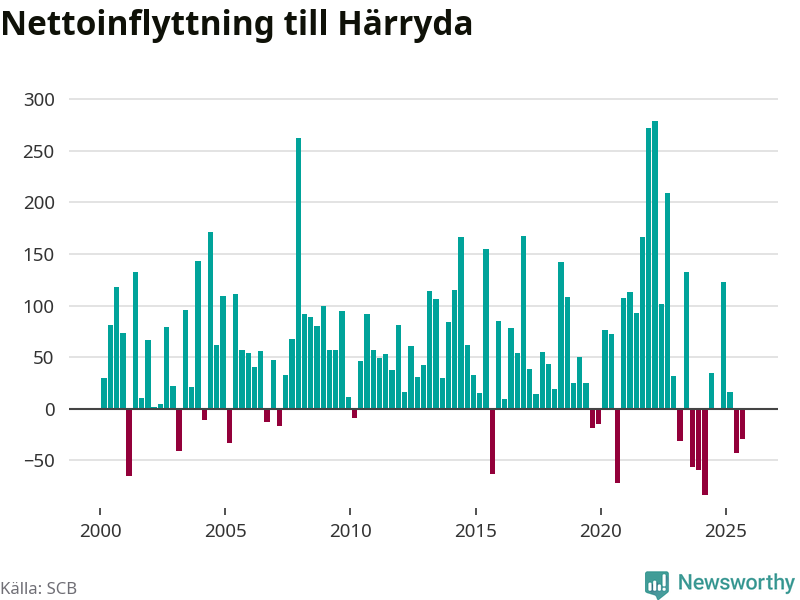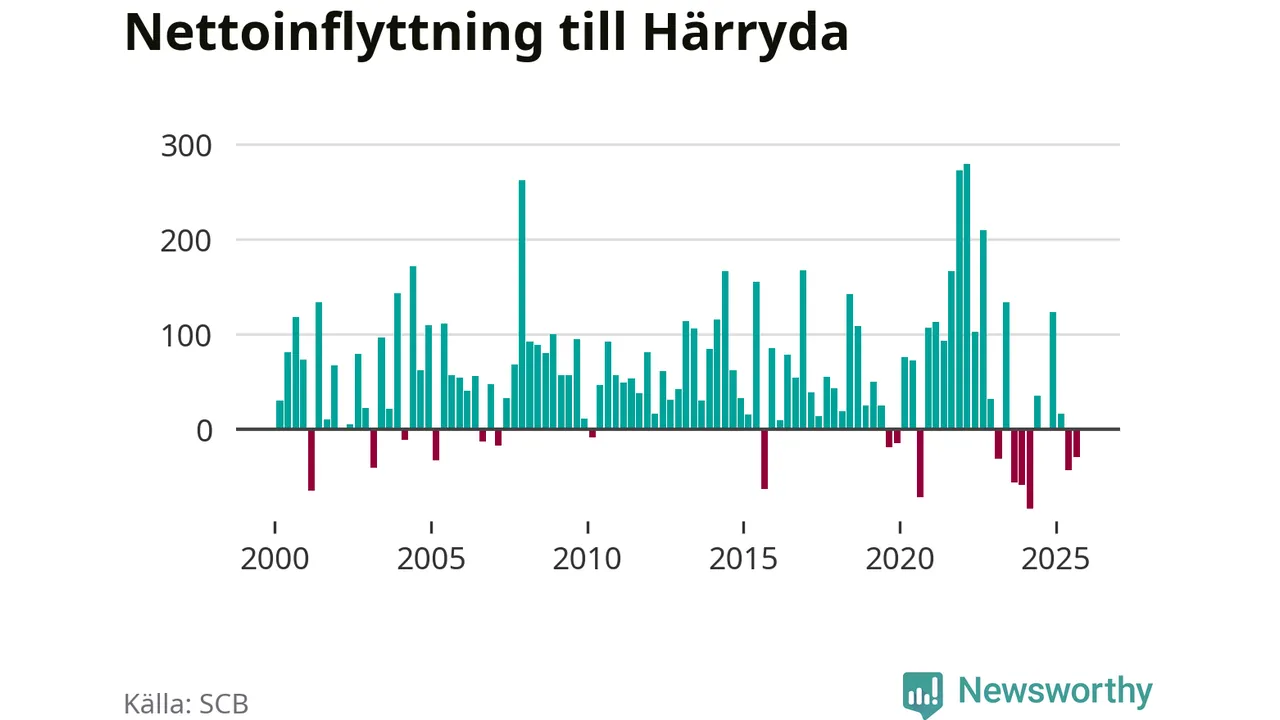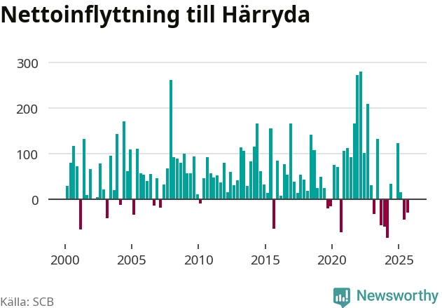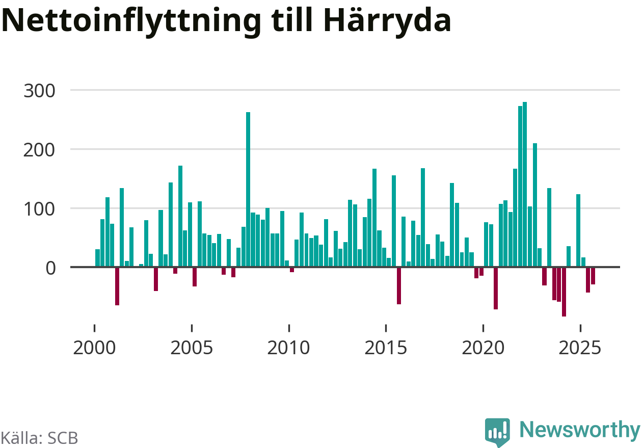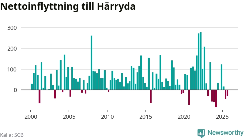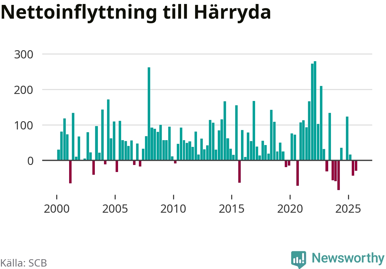 Under tredje kvartalet 2025 flyttade 615 personer till kommunen medan 644 personer flyttade därifrån. Det är historiskt sett en stor utflyttning under ett kvartal. Sedan seklets början har Härryda oftast haft ett positivt flyttnetto.
