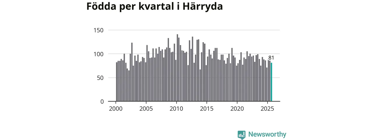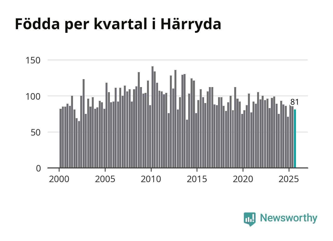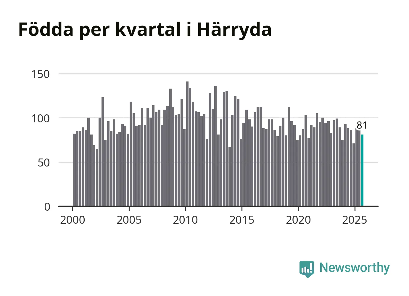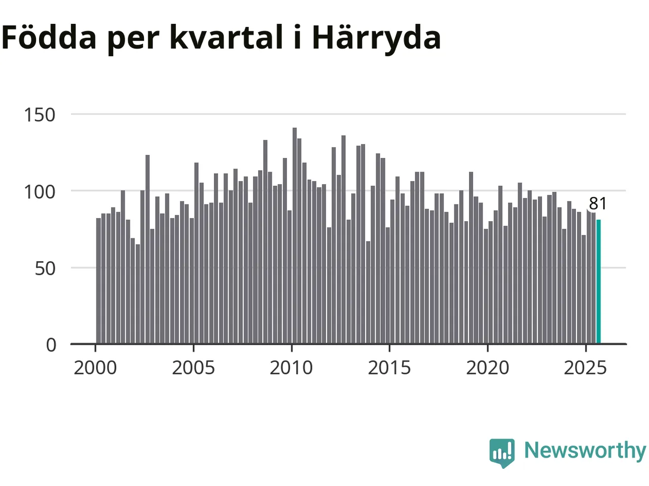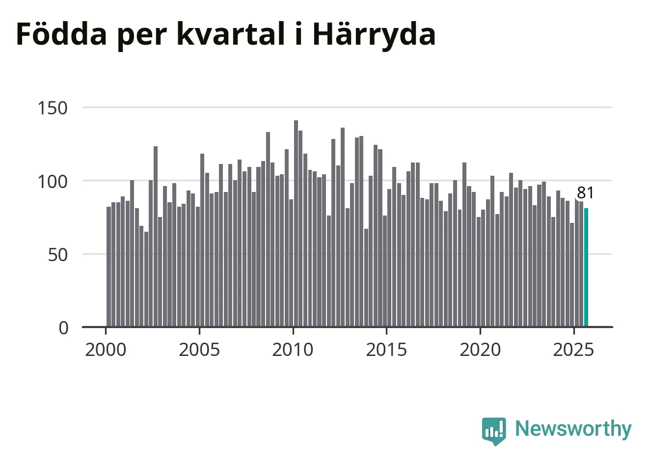 Enligt SCB:s siffror föddes 81 barn i Härryda under det senaste kvartalet. Samtidigt avled 60 personer. Härryda hade alltså ett positivt födelsenetto, vilket kommunen historiskt sett nästan alltid har haft.