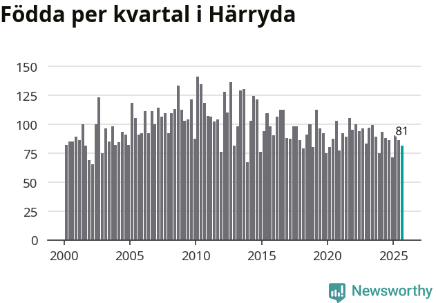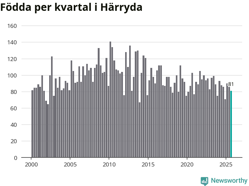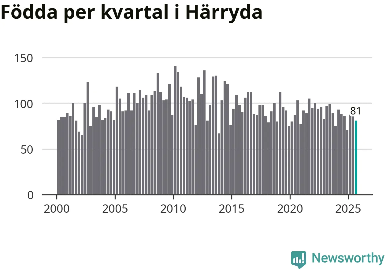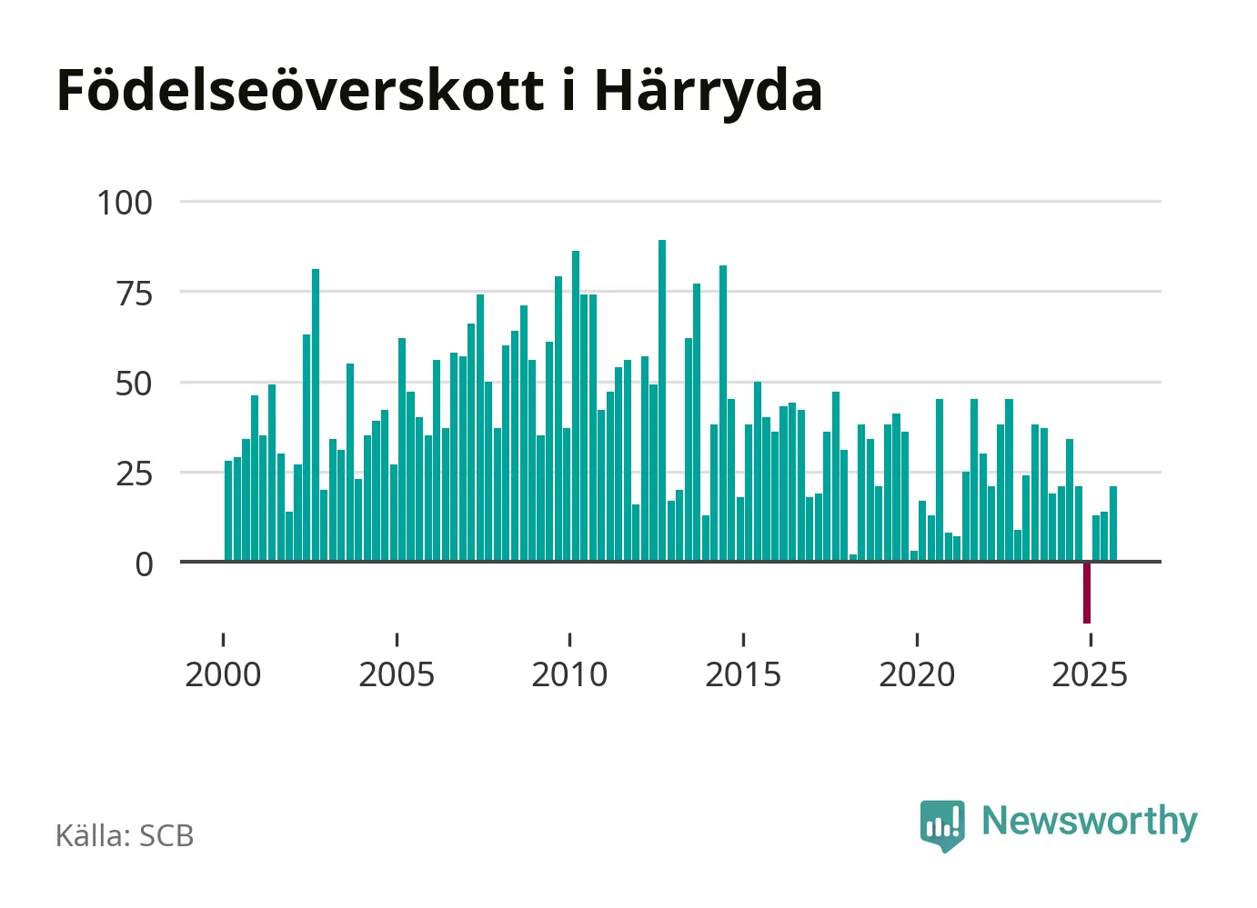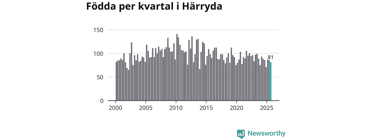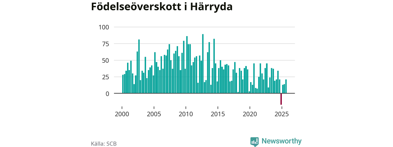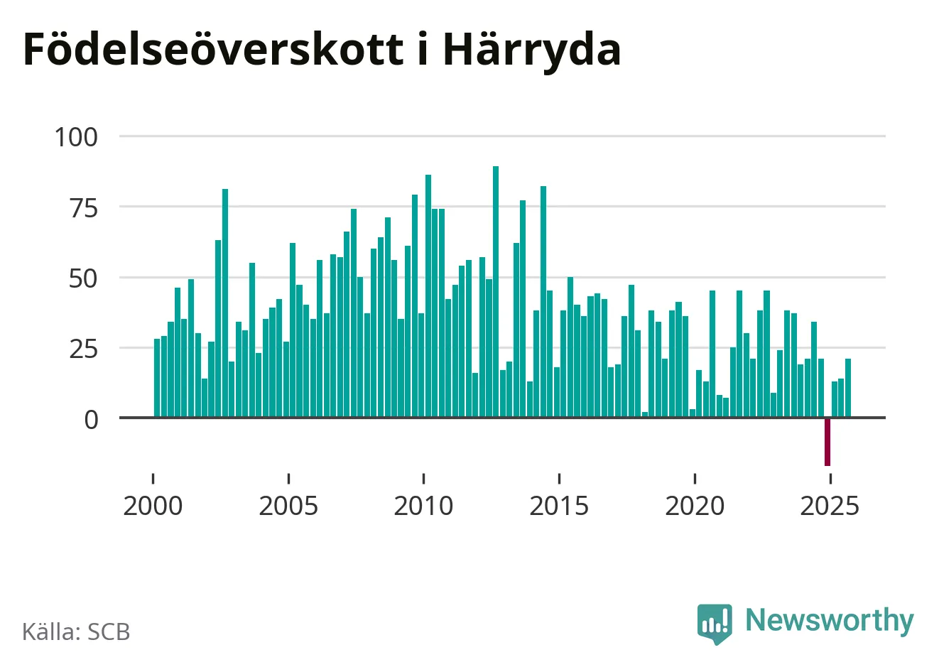 Enligt SCB:s siffror föddes 81 barn i Härryda under det senaste kvartalet. Samtidigt avled 60 personer. Härryda hade alltså ett positivt födelsenetto, vilket kommunen historiskt sett nästan alltid har haft.
