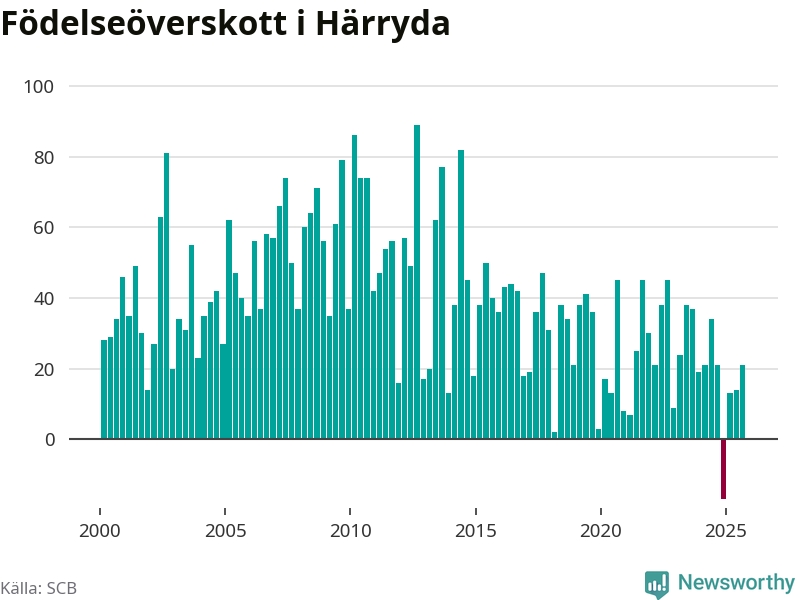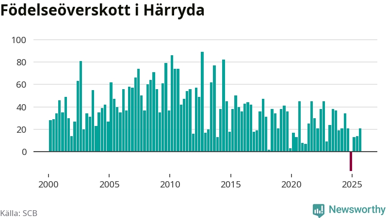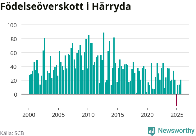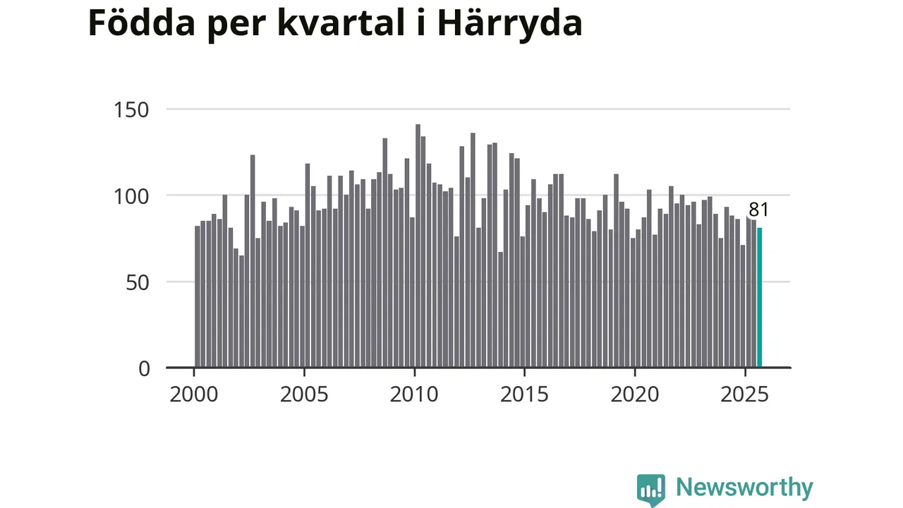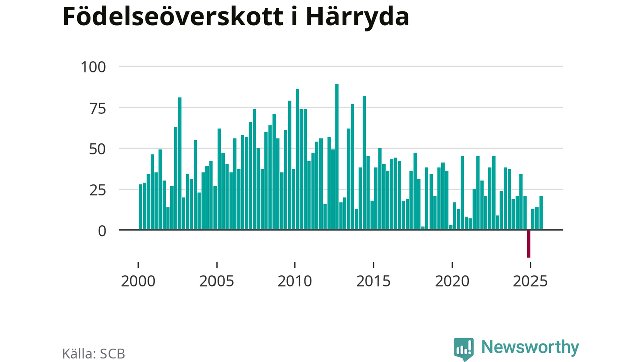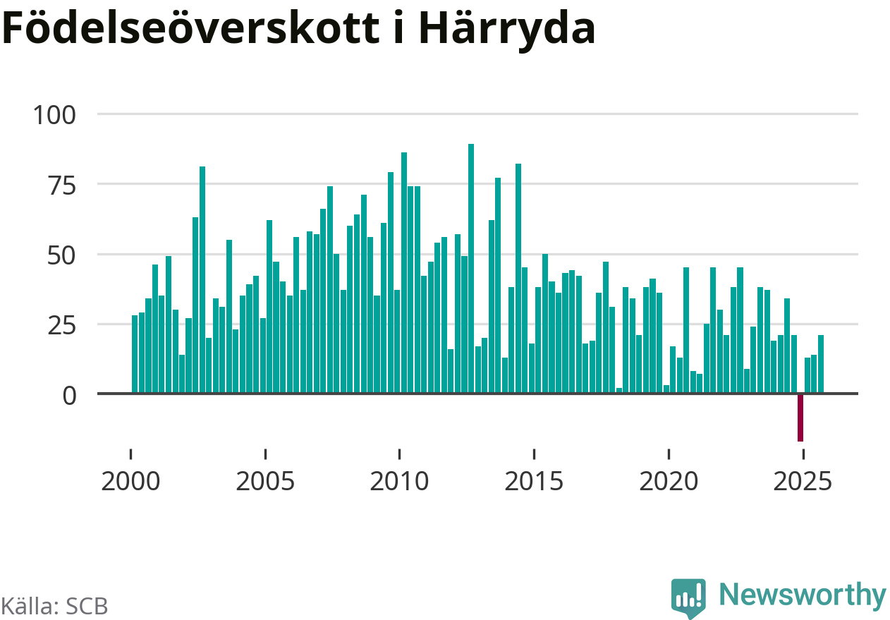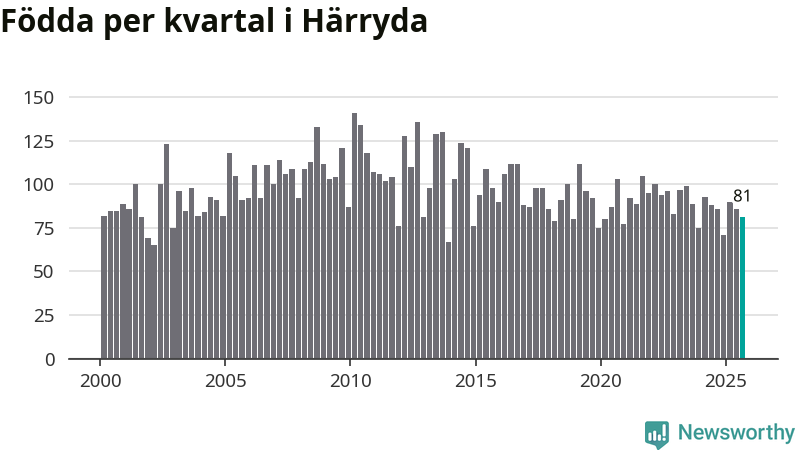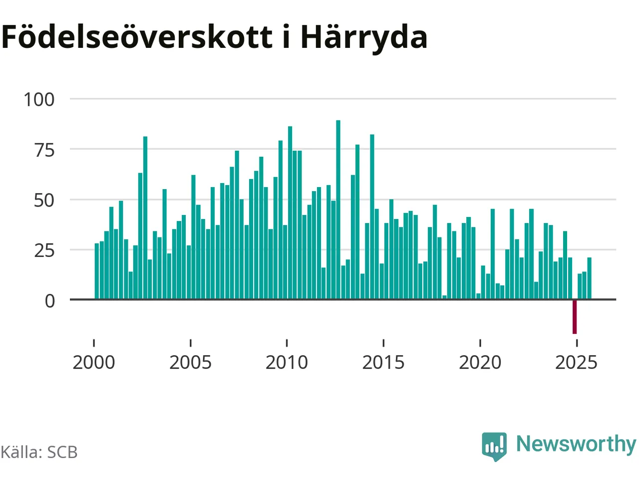 Enligt SCB:s siffror föddes 81 barn i Härryda under det senaste kvartalet. Samtidigt avled 60 personer. Härryda hade alltså ett positivt födelsenetto, vilket kommunen historiskt sett nästan alltid har haft.