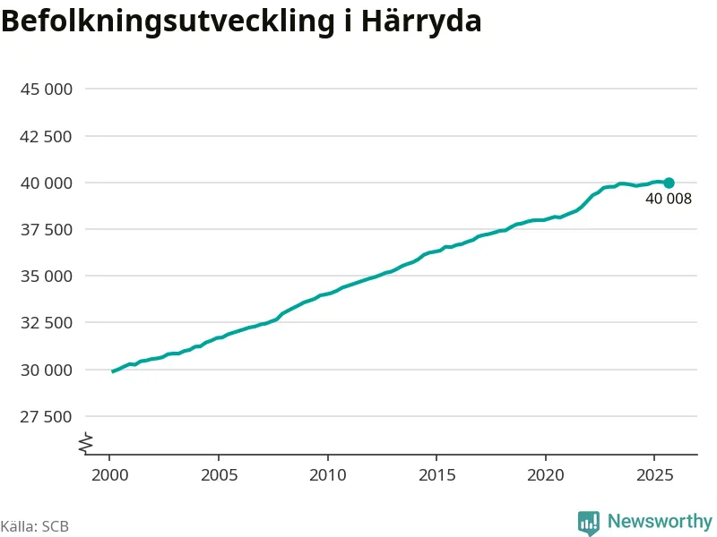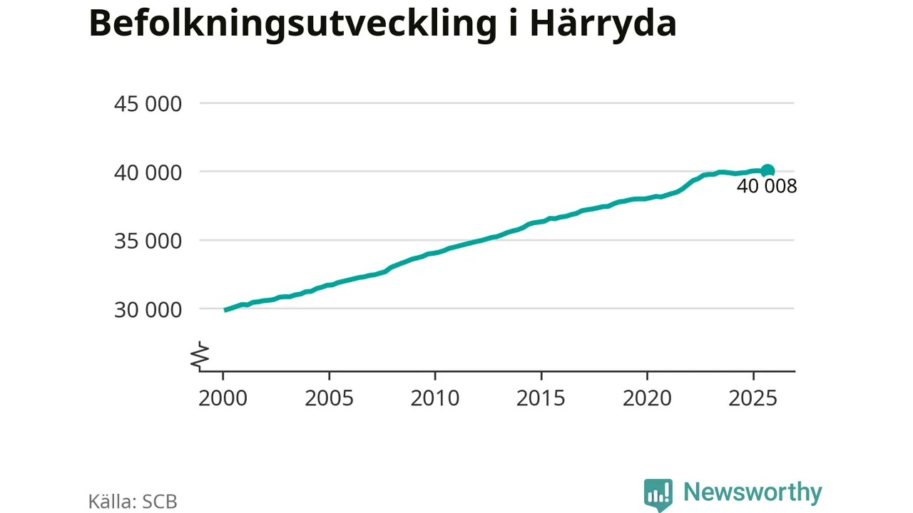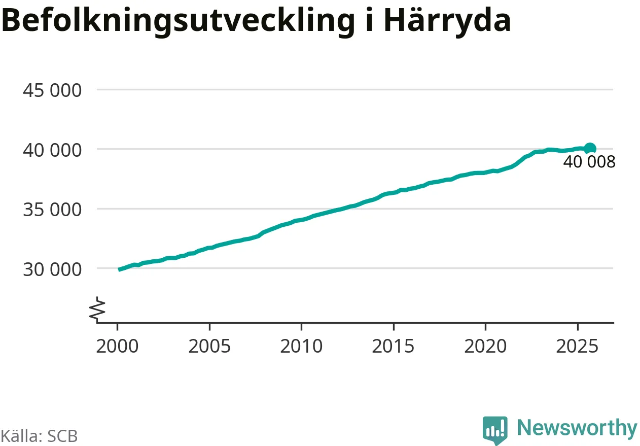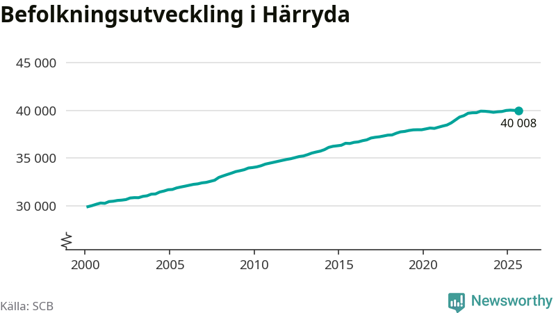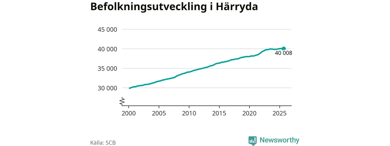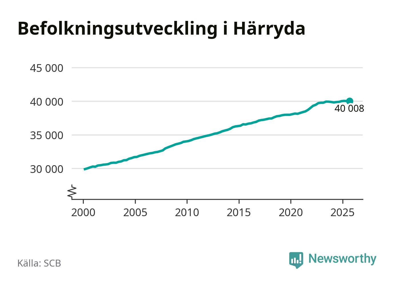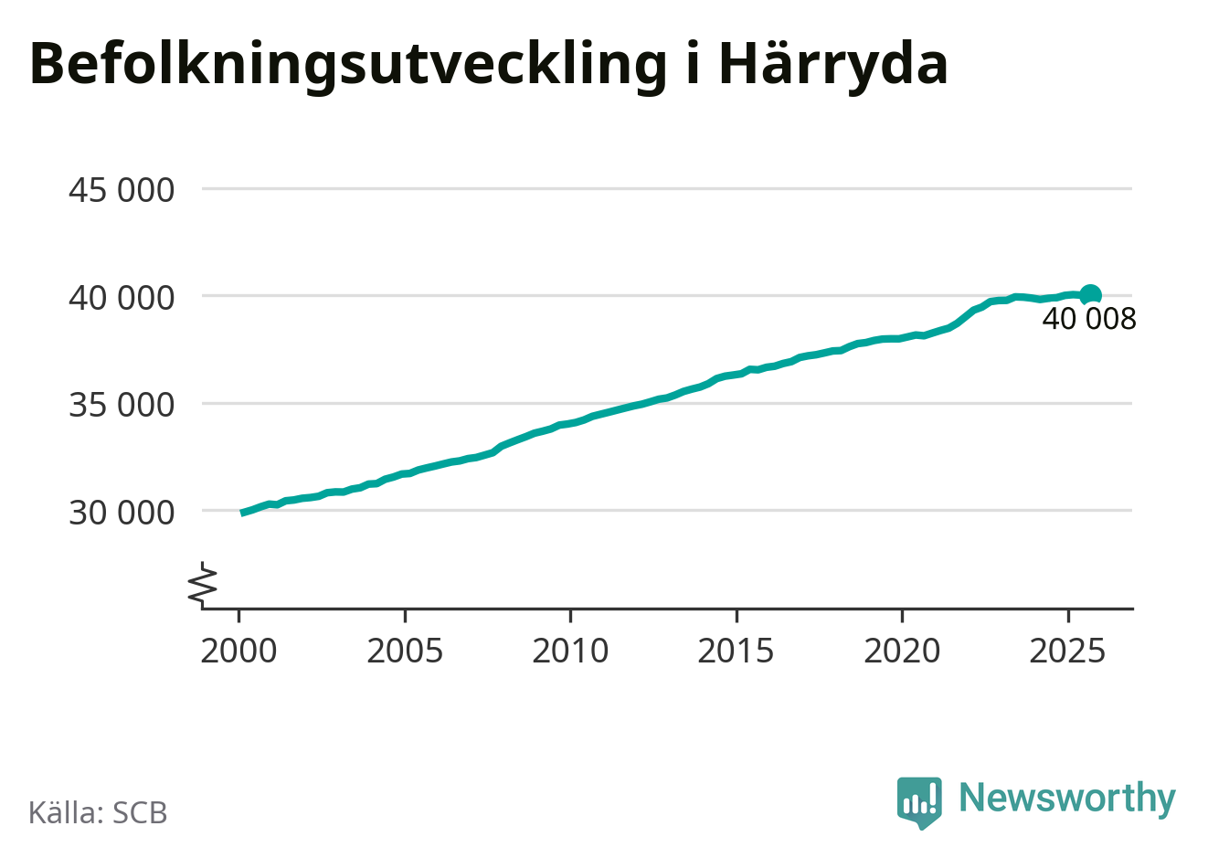 Den 30 september bodde 40 008 personer i Härryda kommun, enligt SCB:s senaste siffror. Det är något färre än i slutet av andra kvartalet, men skillnaden är så liten att den lika gärna kan bero på den lilla justering som SCB gör av siffrorna för att skydda enskilda individers identitet.
