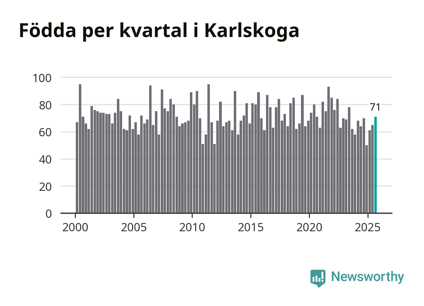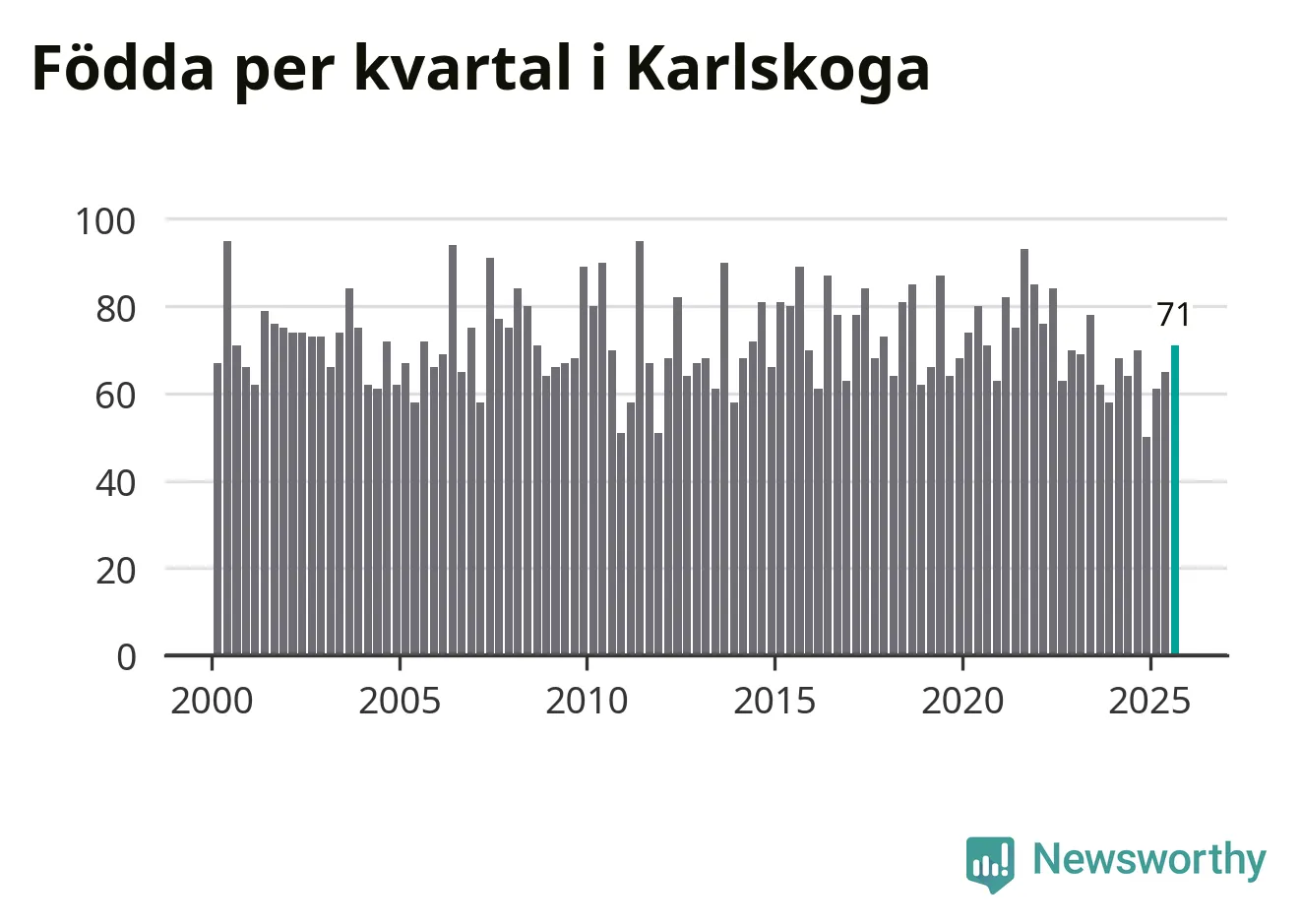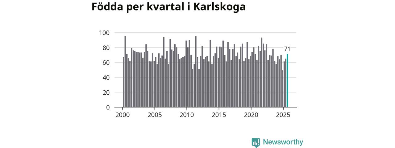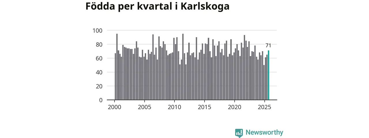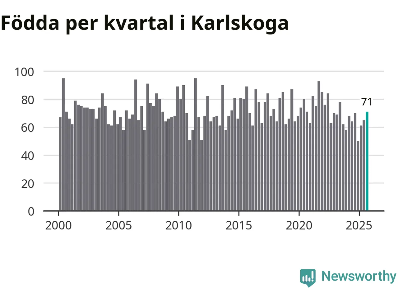 Enligt SCB:s siffror föddes 71 barn i Karlskoga under det senaste kvartalet. Samtidigt avled 88 personer. Karlskoga hade alltså ett negativt födelsenetto, vilket kommunen historiskt sett nästan alltid har haft.