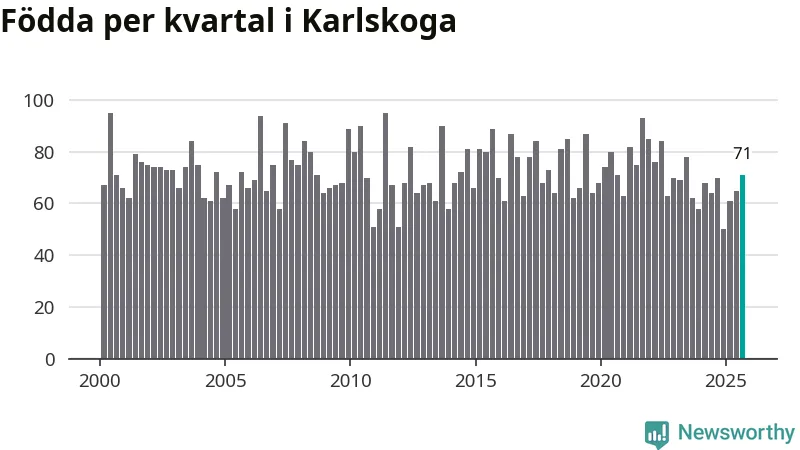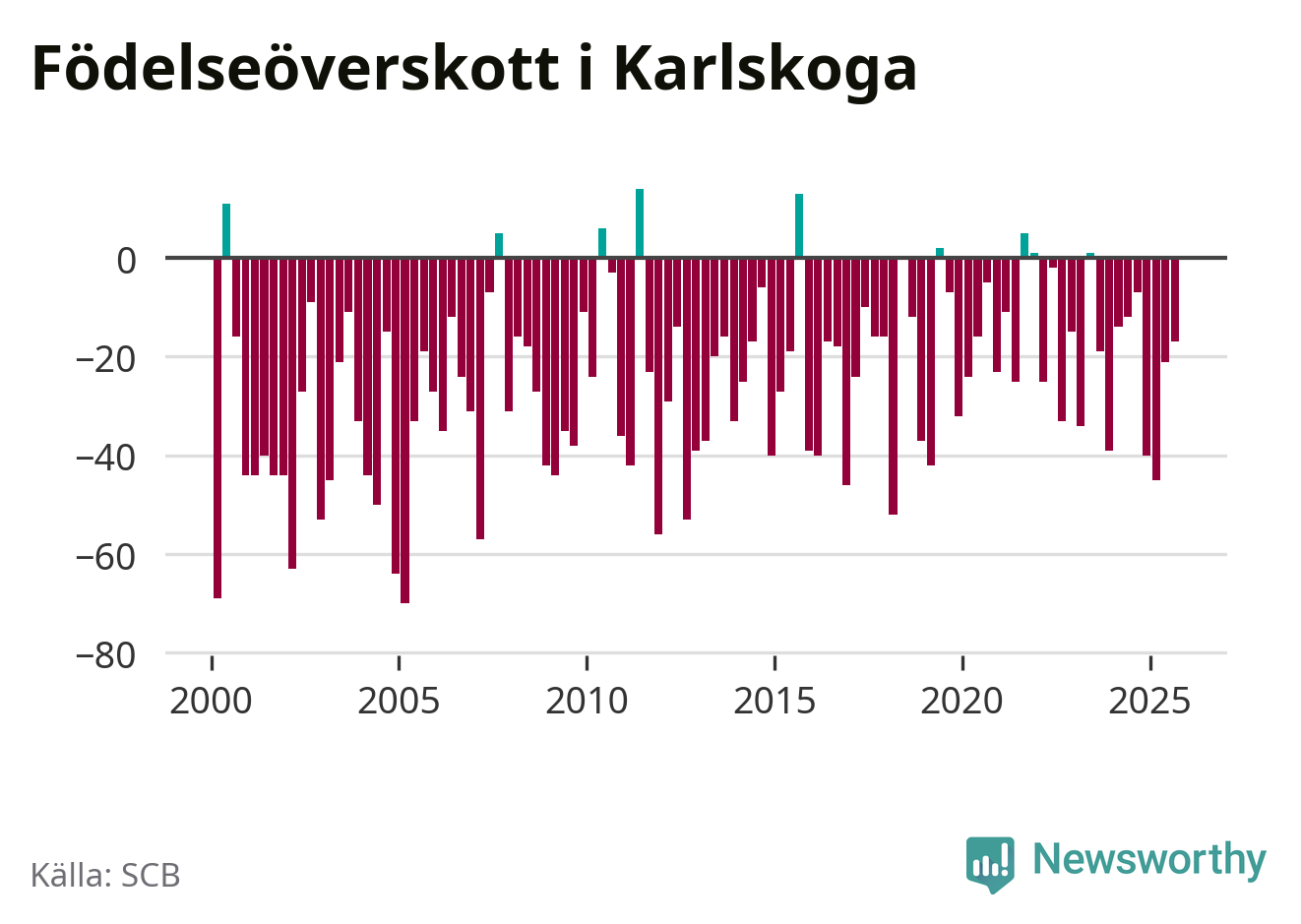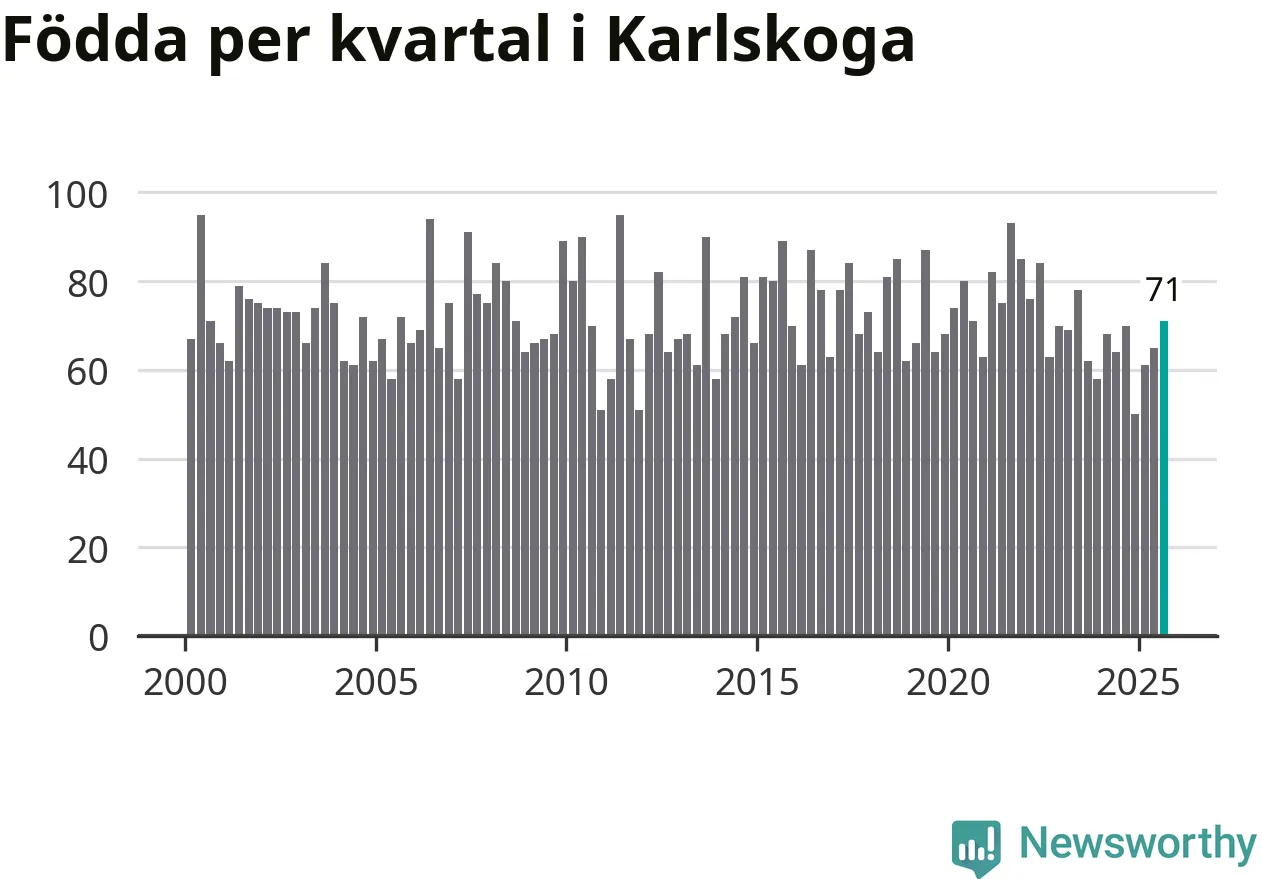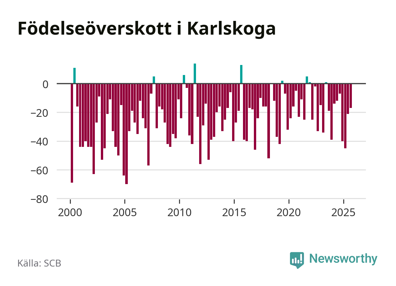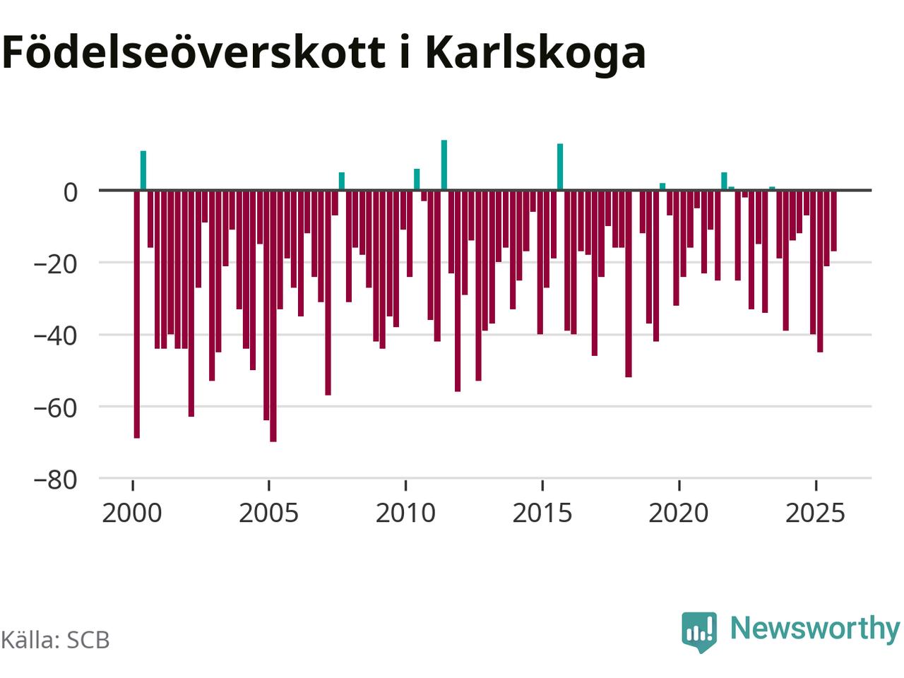 Enligt SCB:s siffror föddes 71 barn i Karlskoga under det senaste kvartalet. Samtidigt avled 88 personer. Karlskoga hade alltså ett negativt födelsenetto, vilket kommunen historiskt sett nästan alltid har haft.