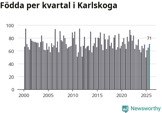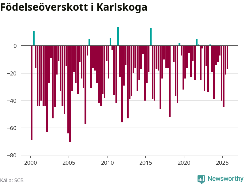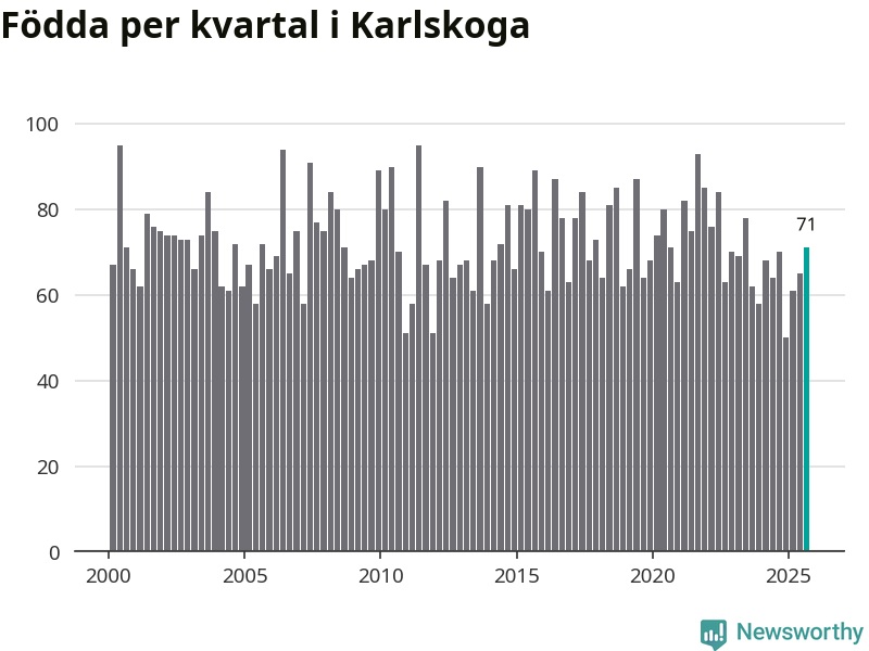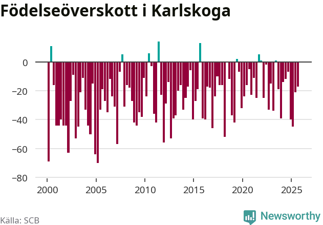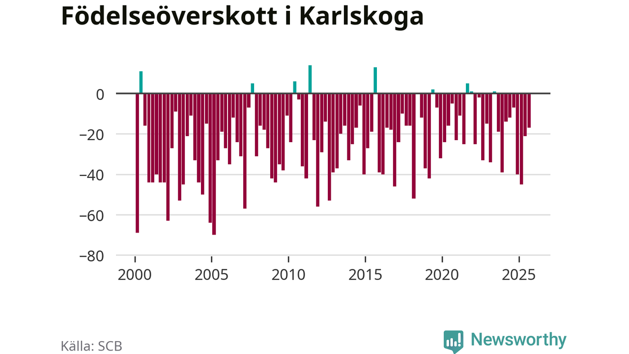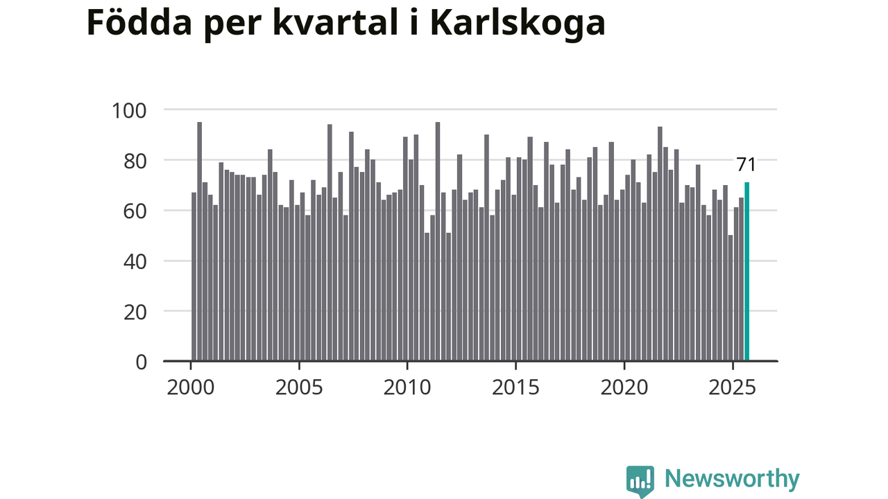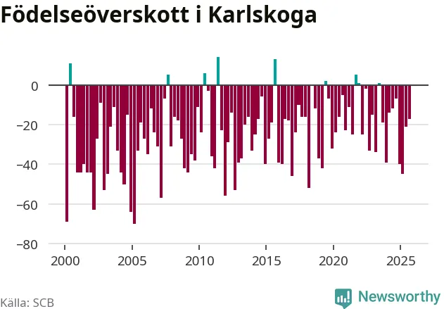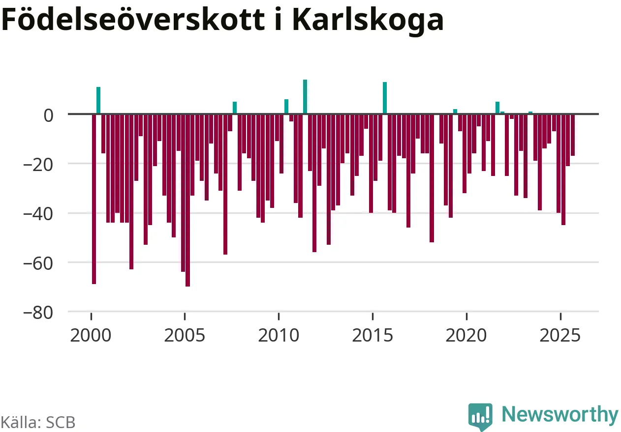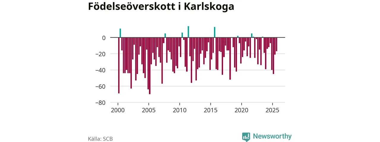 Enligt SCB:s siffror föddes 71 barn i Karlskoga under det senaste kvartalet. Samtidigt avled 88 personer. Karlskoga hade alltså ett negativt födelsenetto, vilket kommunen historiskt sett nästan alltid har haft.