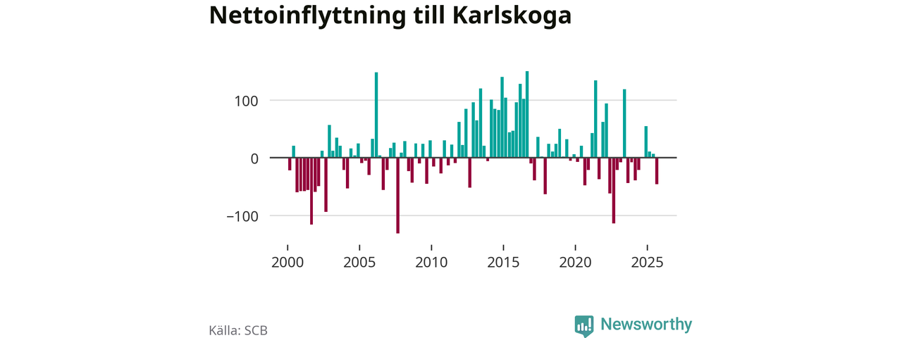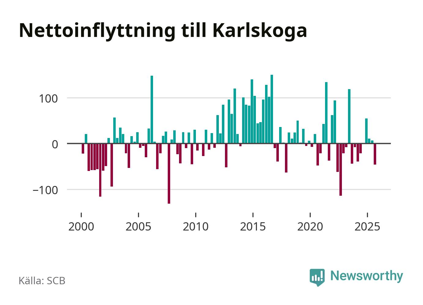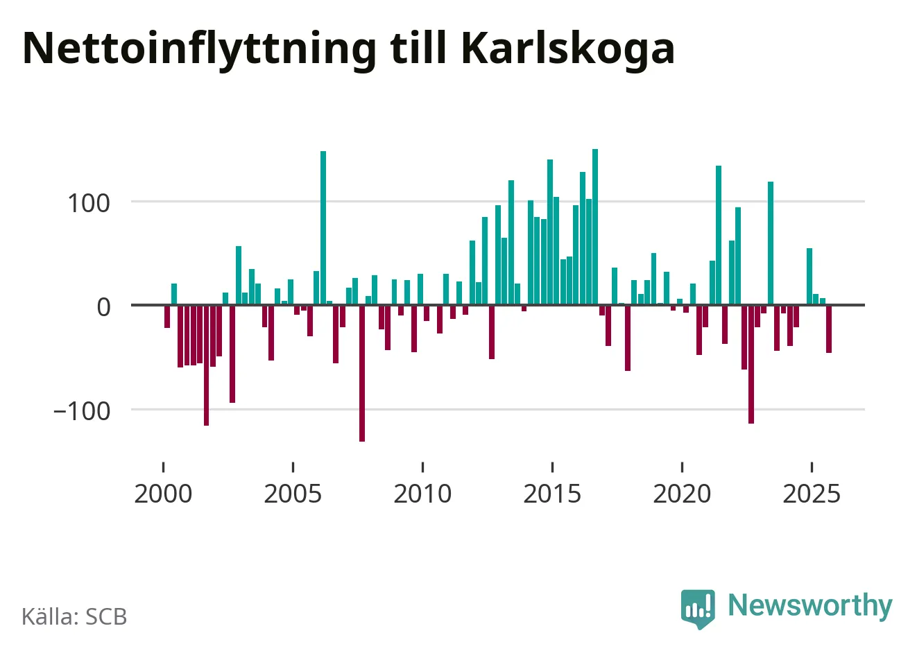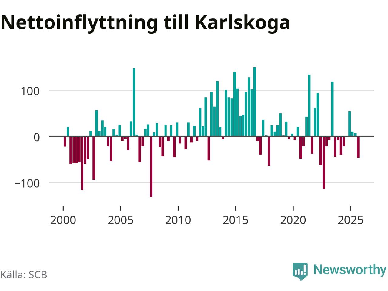 Under tredje kvartalet 2025 flyttade 346 personer till kommunen medan 392 personer flyttade därifrån. Sedan seklets början har Karlskoga haft ungefär lika många kvartal med positivt flyttnetto som negativt.