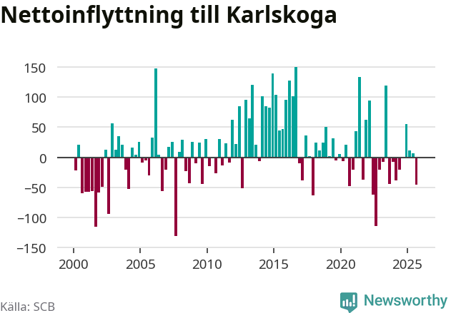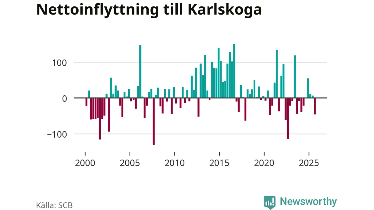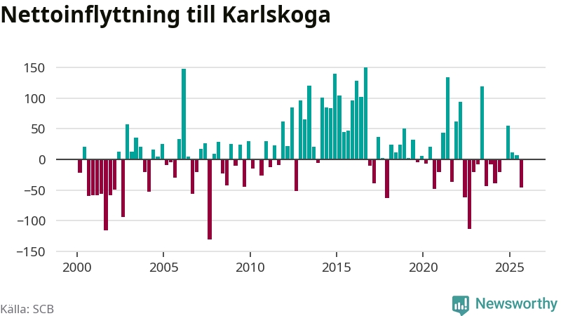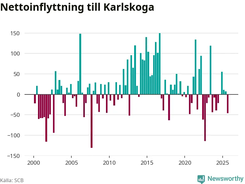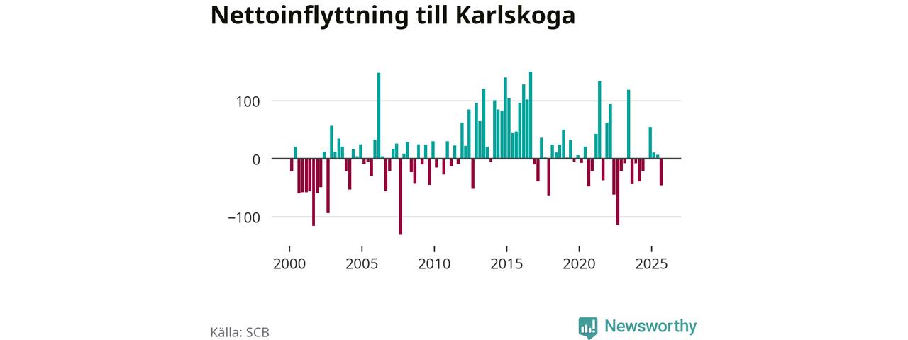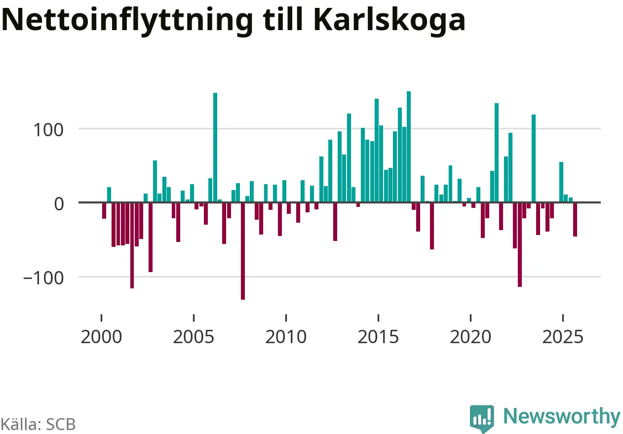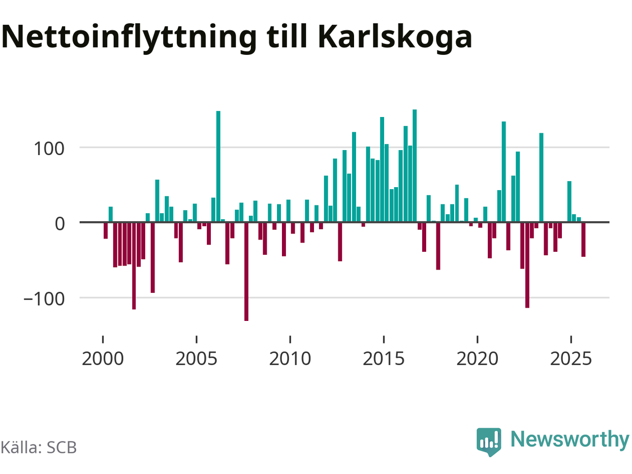 Under tredje kvartalet 2025 flyttade 346 personer till kommunen medan 392 personer flyttade därifrån. Sedan seklets början har Karlskoga haft ungefär lika många kvartal med positivt flyttnetto som negativt.