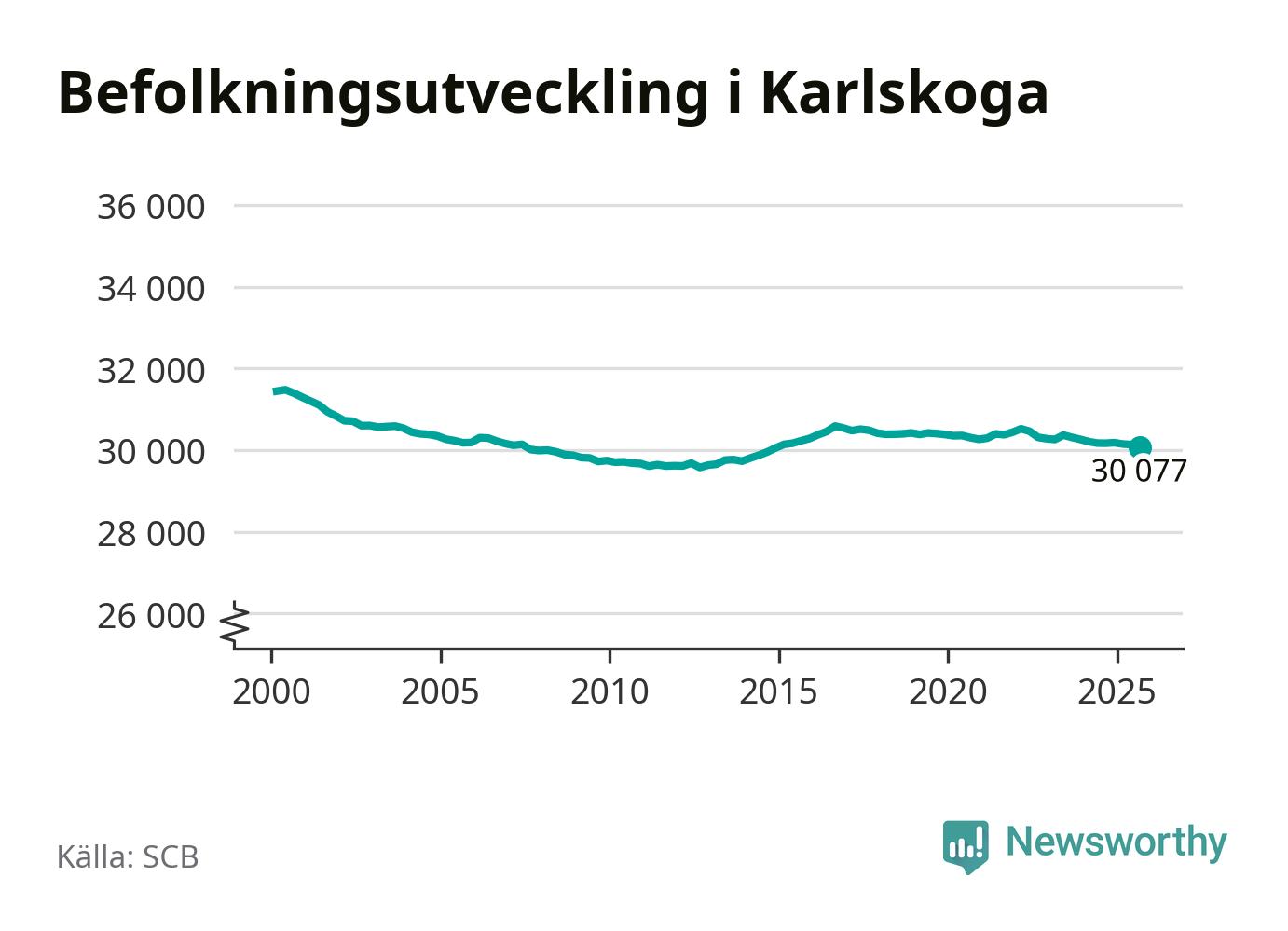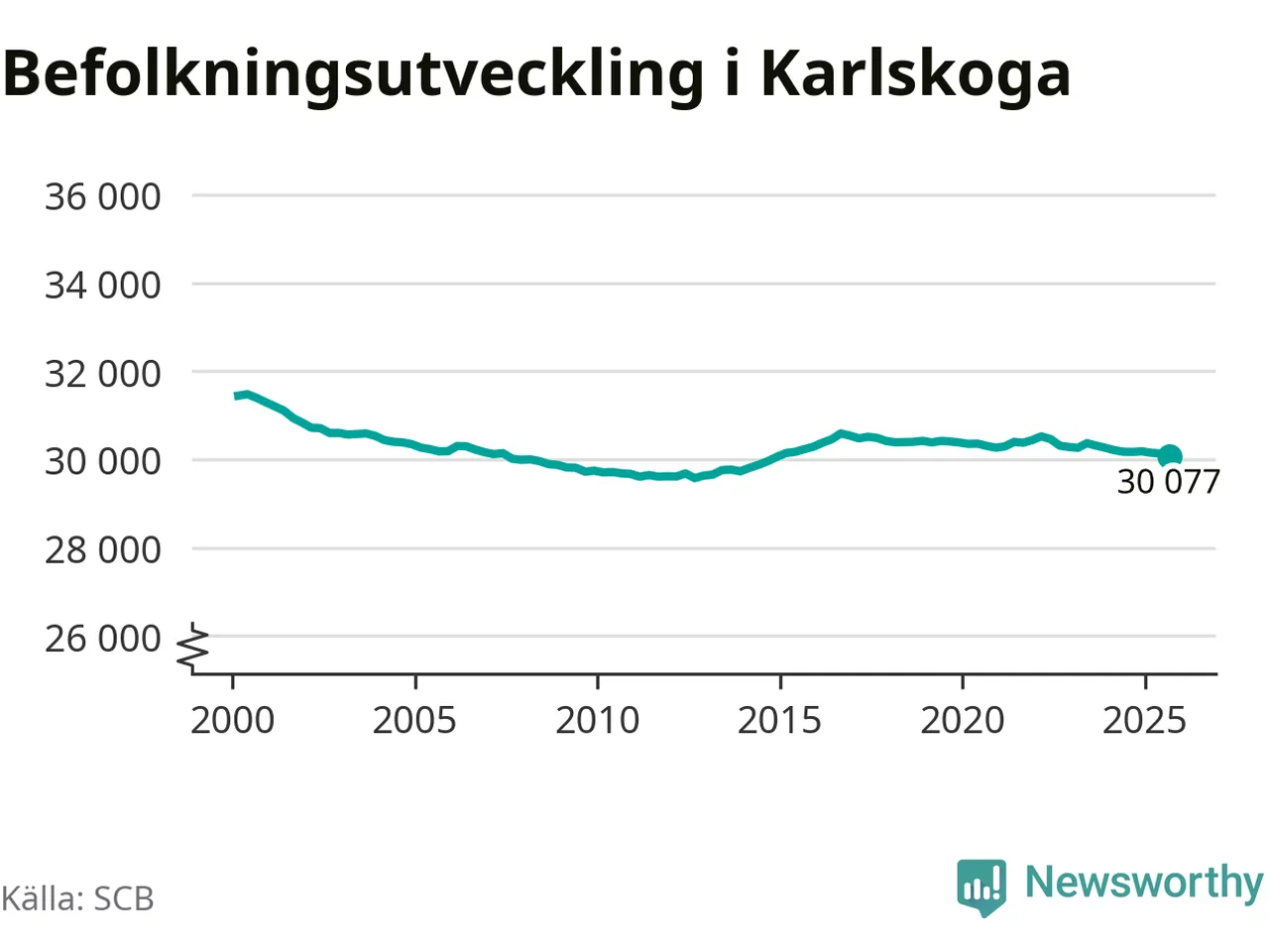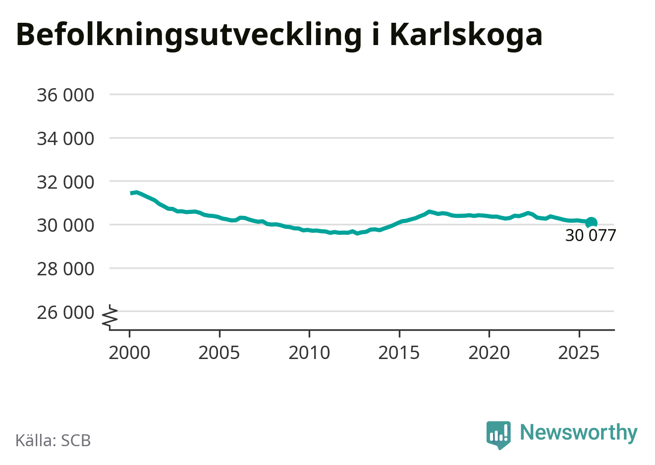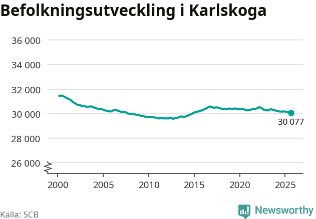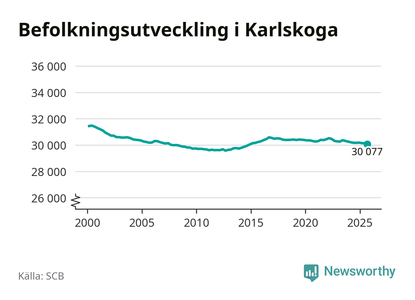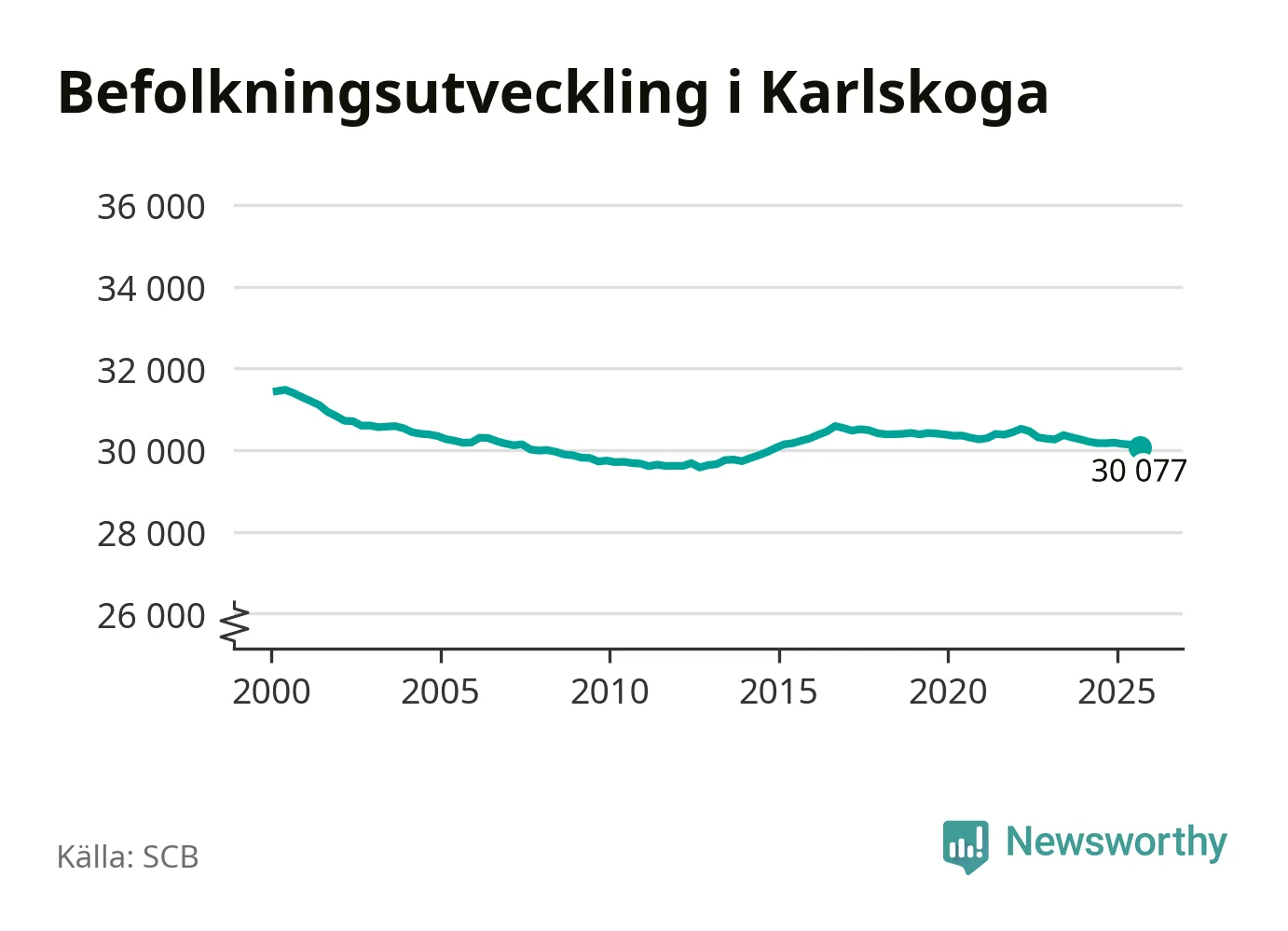 Befolkningen minskade i Karlskoga kommun under det tredje kvartalet 2025. Den 30 september bodde enligt SCB:s senaste siffror 30 077 personer i kommunen, vilket är 57 färre än i slutet av andra kvartalet.