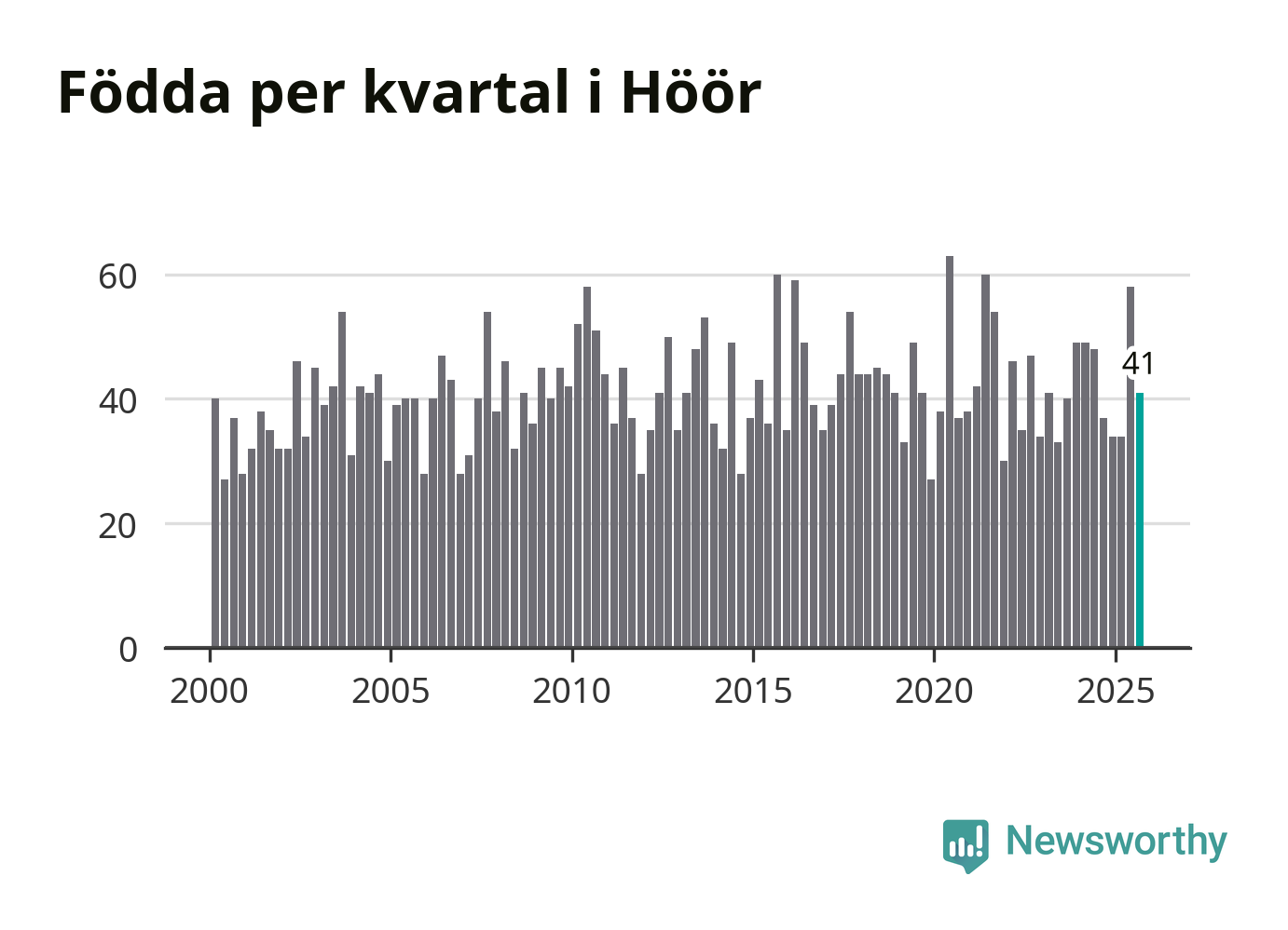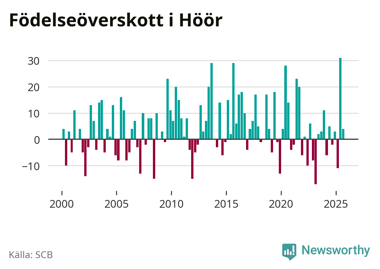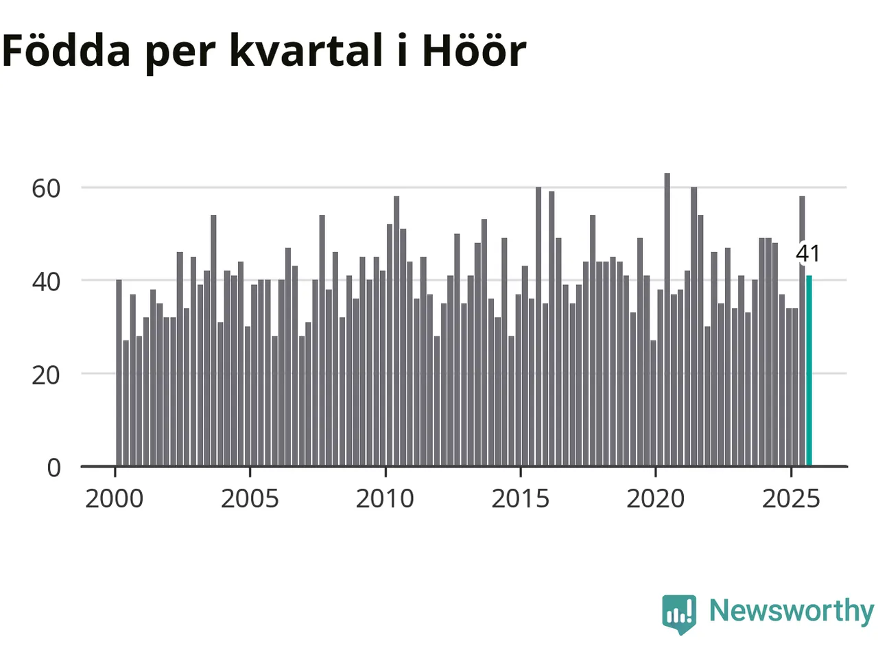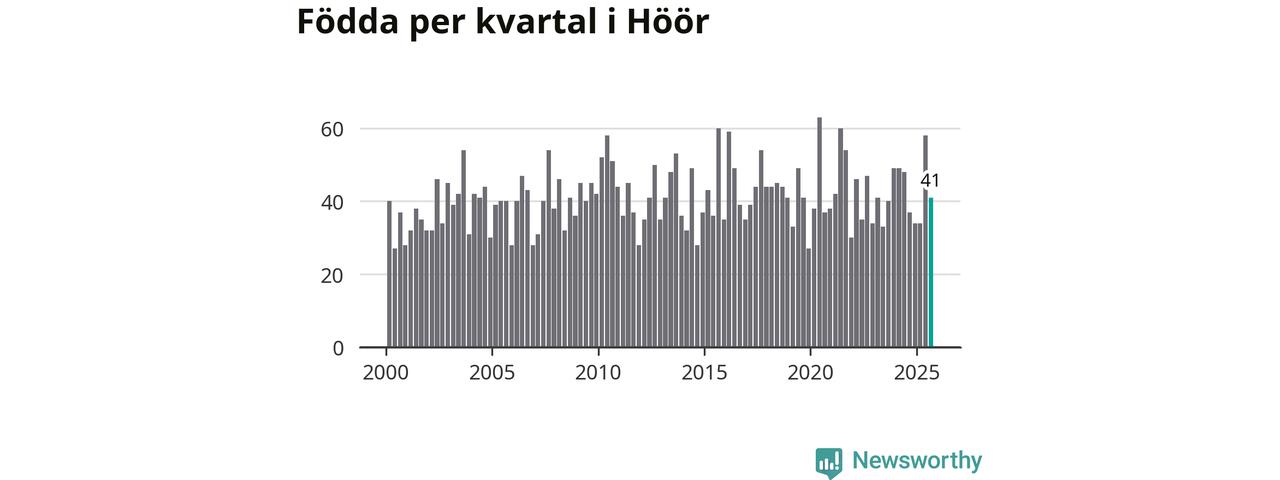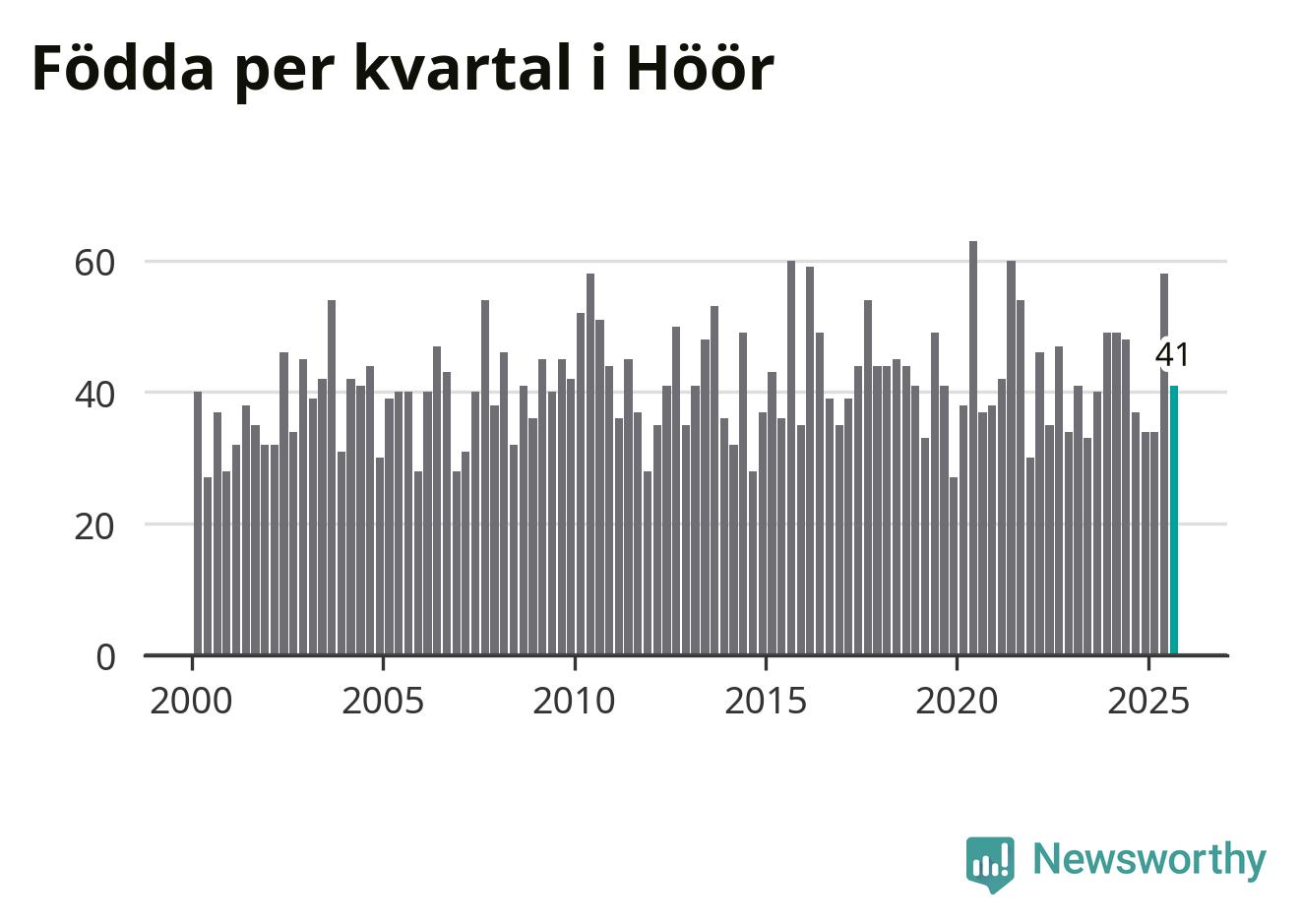 Enligt SCB:s siffror föddes 41 barn i Höör under det senaste kvartalet. Samtidigt avled 37 personer. Skillnaden mellan antal födda och döda är så liten att det inte går att säga om det beror på något annat än SCB:s röjandeskydd. Kommunen har oftast haft positivt födelsenetto tidigare.