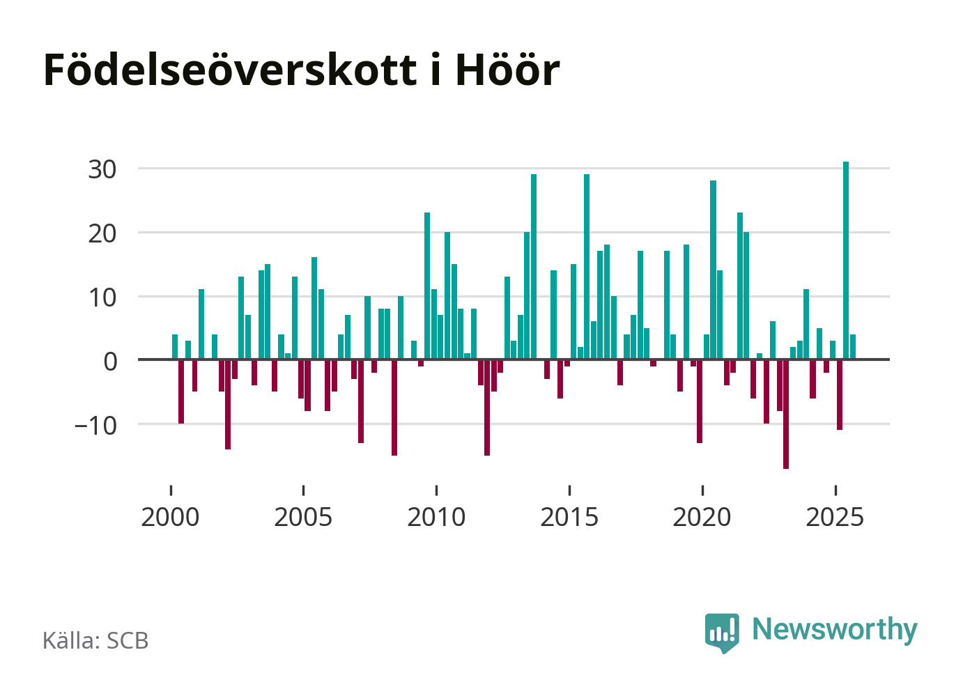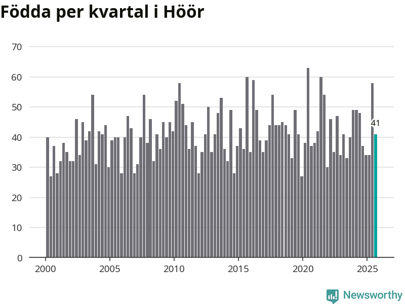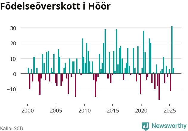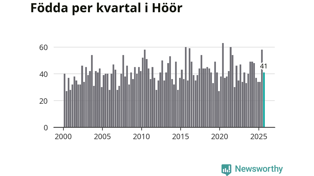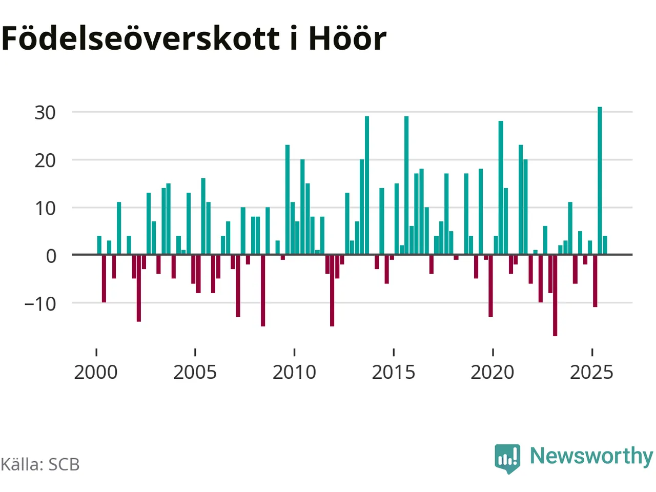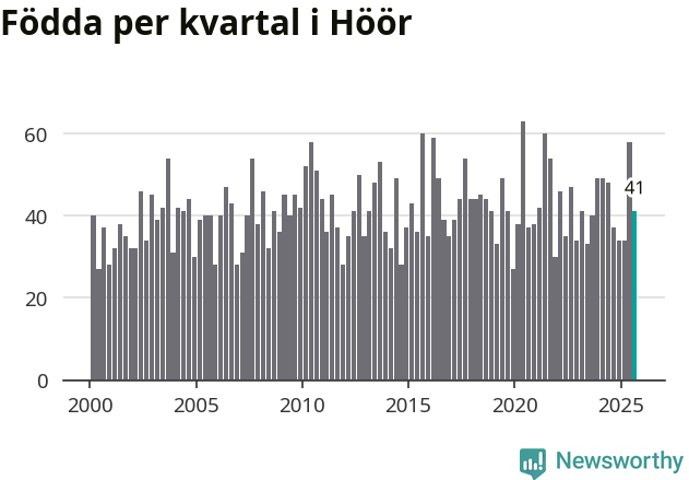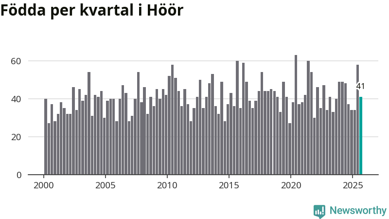 Enligt SCB:s siffror föddes 41 barn i Höör under det senaste kvartalet. Samtidigt avled 37 personer. Skillnaden mellan antal födda och döda är så liten att det inte går att säga om det beror på något annat än SCB:s röjandeskydd. Kommunen har oftast haft positivt födelsenetto tidigare.
