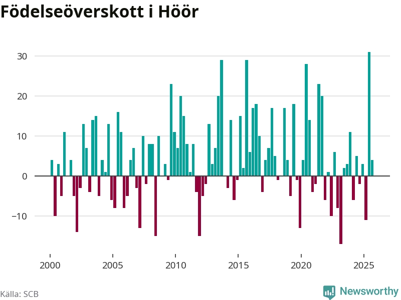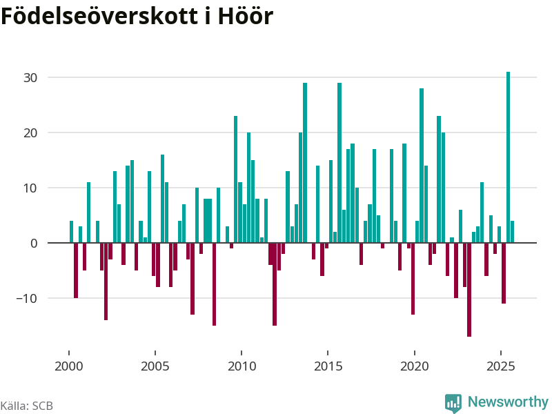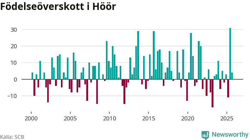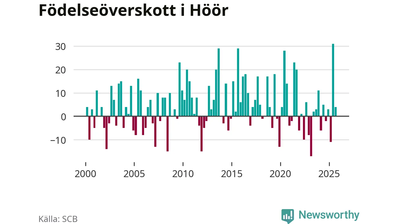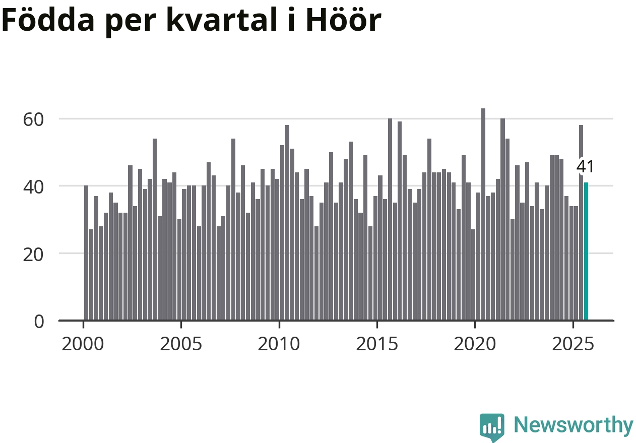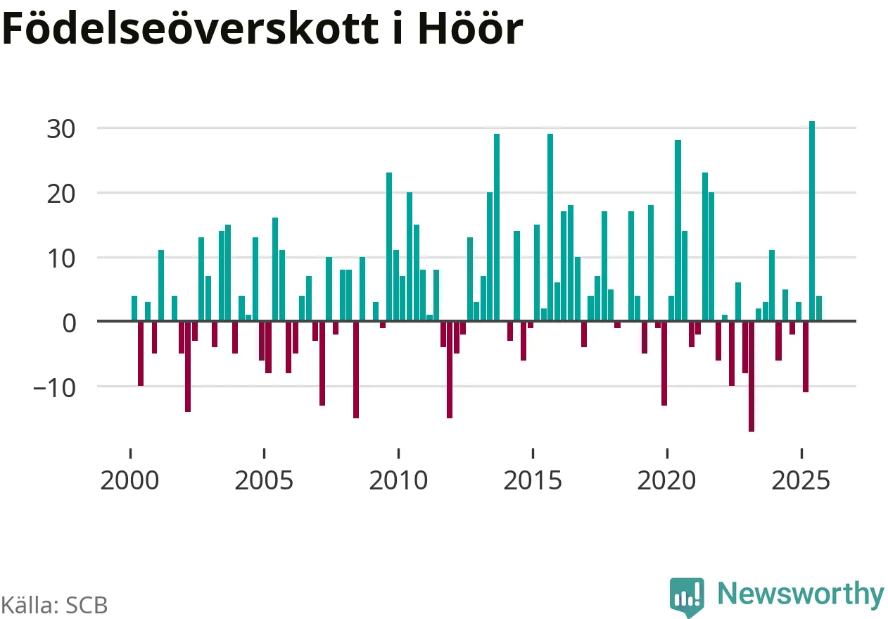 Enligt SCB:s siffror föddes 41 barn i Höör under det senaste kvartalet. Samtidigt avled 37 personer. Skillnaden mellan antal födda och döda är så liten att det inte går att säga om det beror på något annat än SCB:s röjandeskydd. Kommunen har oftast haft positivt födelsenetto tidigare.