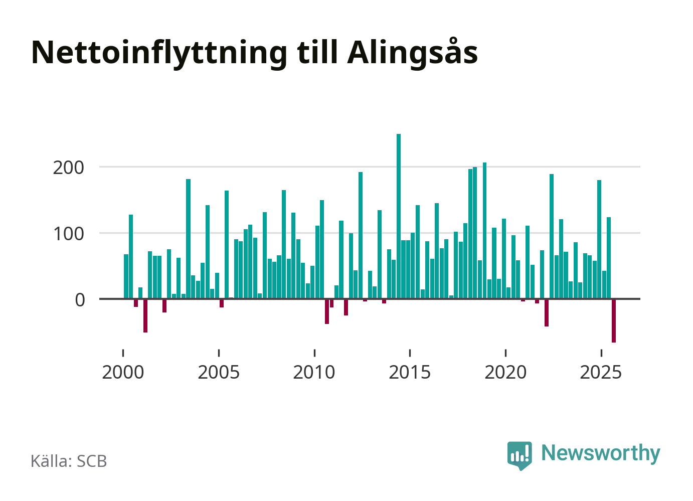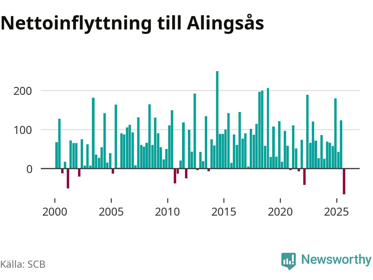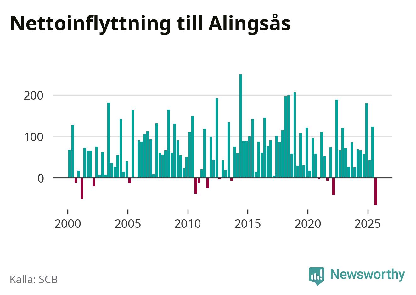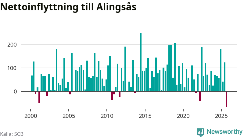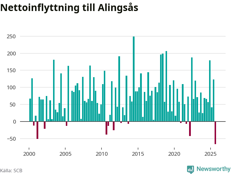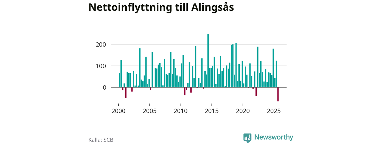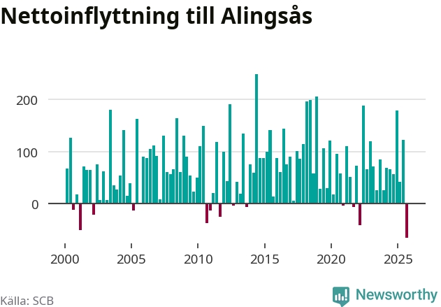 Under tredje kvartalet 2025 flyttade 537 personer till kommunen medan 603 personer flyttade därifrån. Det är historiskt sett en stor utflyttning under ett kvartal. Det ger den största nettoutflyttningen under ett kvartal sedan åtminstone år 2000. Sedan seklets början har Alingsås haft ett positivt flyttnetto under nästan alla kvartal.