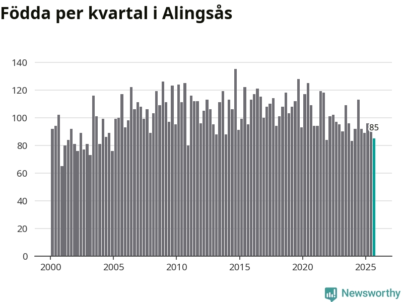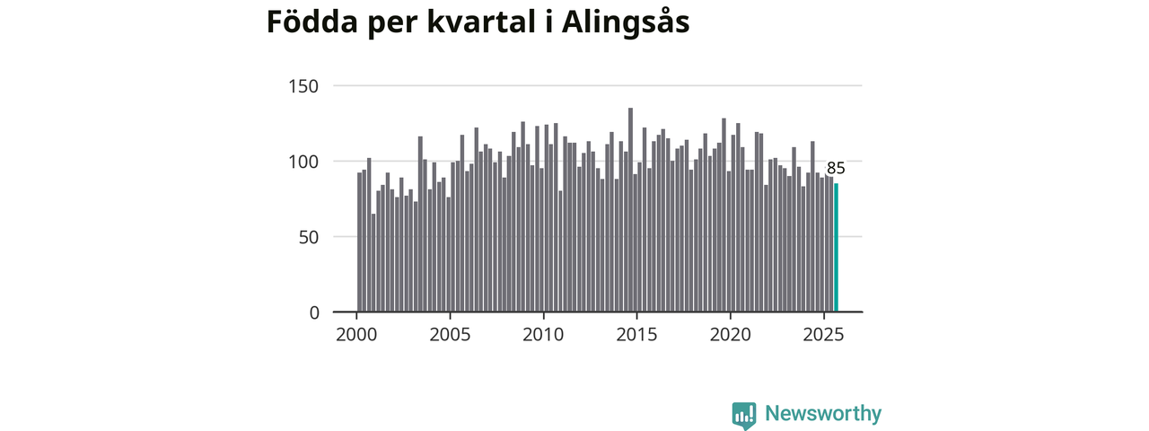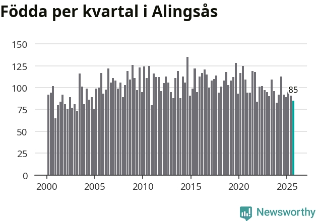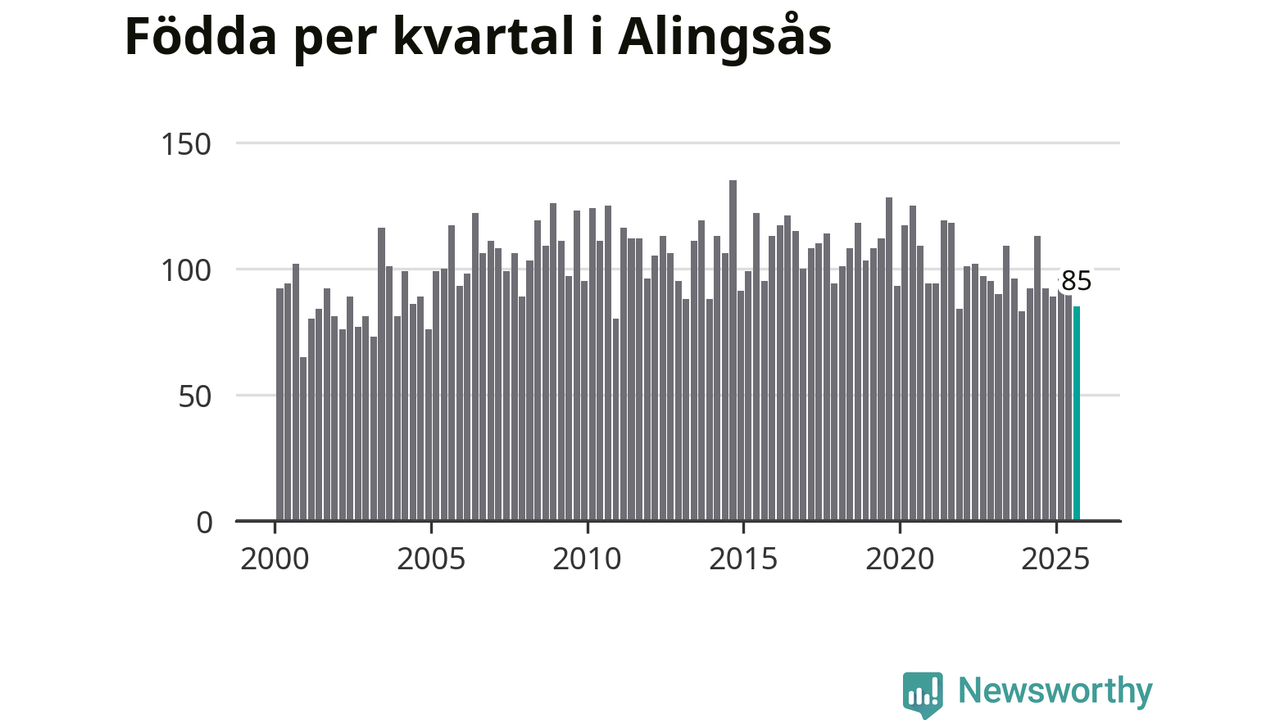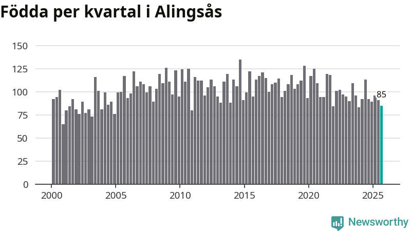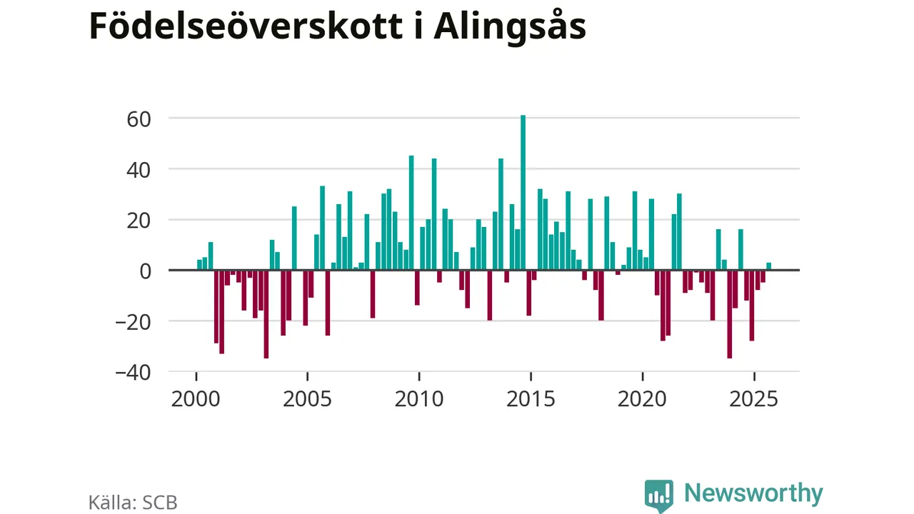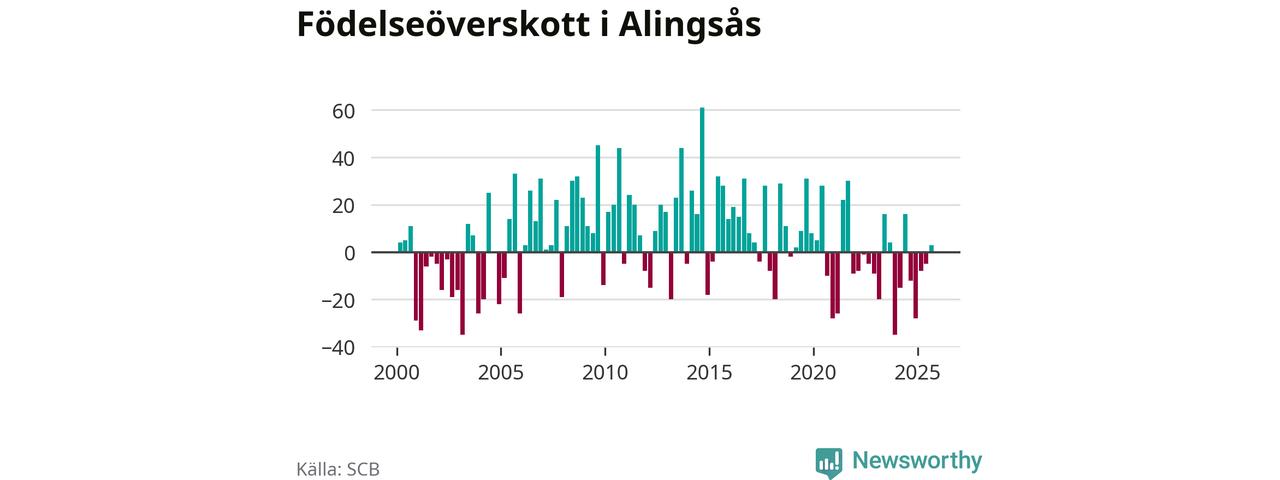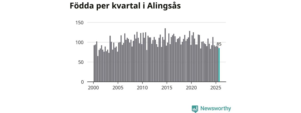 Enligt SCB:s siffror föddes 85 barn i Alingsås under det senaste kvartalet. Samtidigt avled 82 personer. Skillnaden mellan antal födda och döda är så liten att det inte går att säga om det beror på något annat än SCB:s röjandeskydd. Kommunen har historiskt sett haft ungefär lika många kvartal med positivt födelsenetto som negativt.