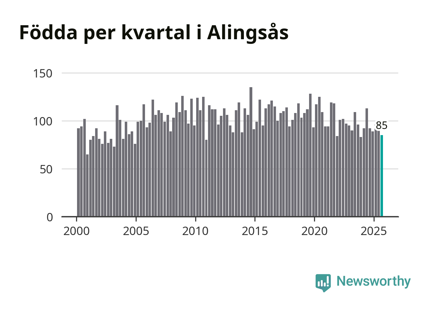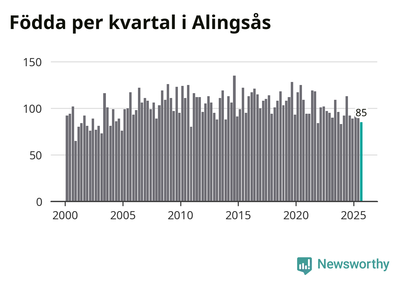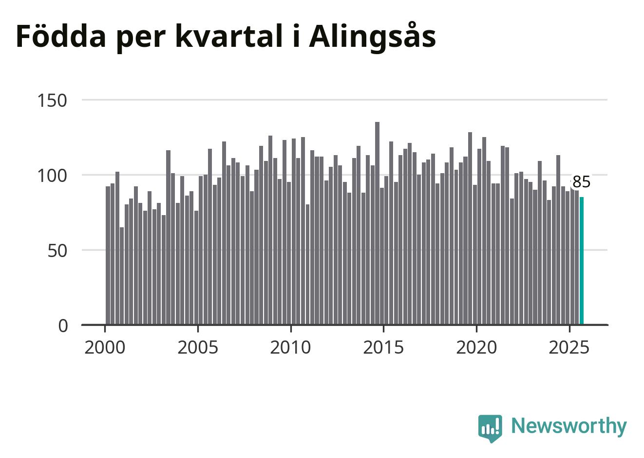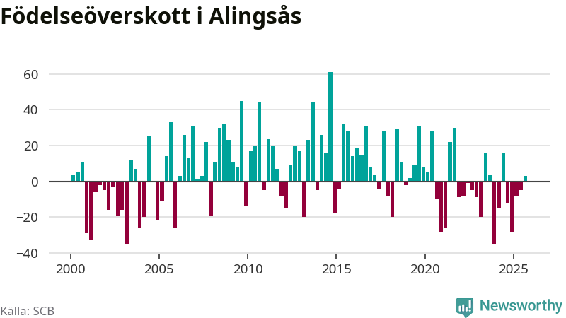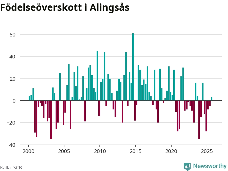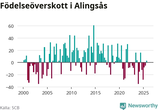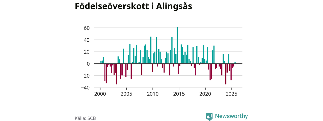 Enligt SCB:s siffror föddes 85 barn i Alingsås under det senaste kvartalet. Samtidigt avled 82 personer. Skillnaden mellan antal födda och döda är så liten att det inte går att säga om det beror på något annat än SCB:s röjandeskydd. Kommunen har historiskt sett haft ungefär lika många kvartal med positivt födelsenetto som negativt.