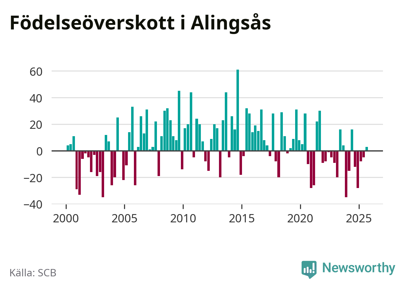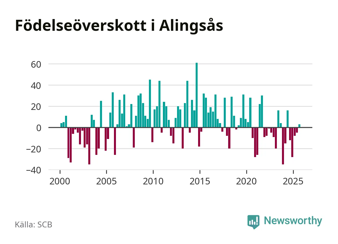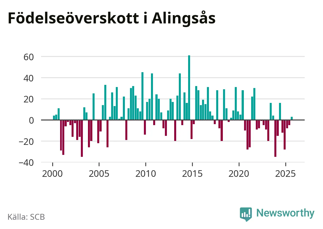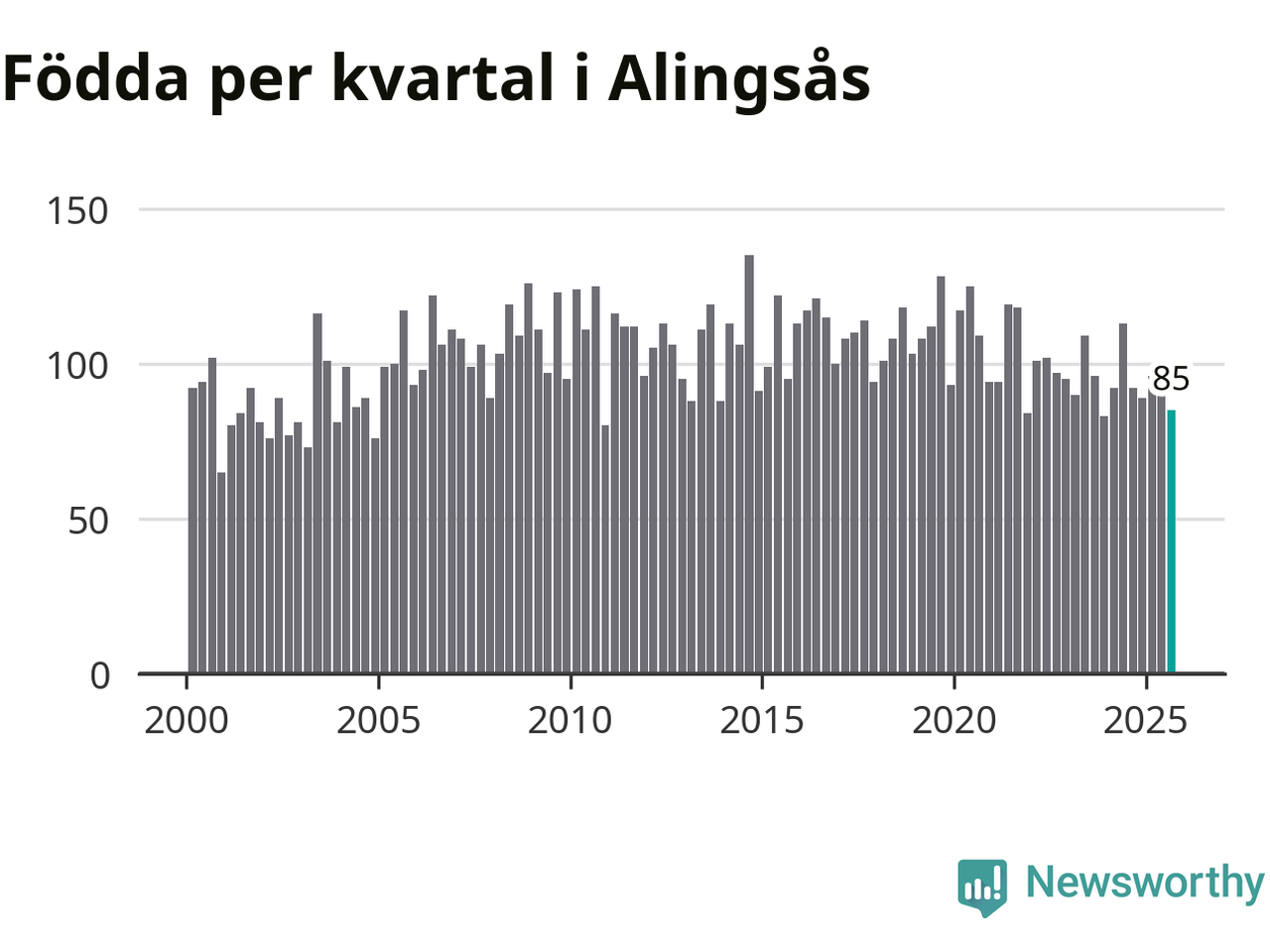 Enligt SCB:s siffror föddes 85 barn i Alingsås under det senaste kvartalet. Samtidigt avled 82 personer. Skillnaden mellan antal födda och döda är så liten att det inte går att säga om det beror på något annat än SCB:s röjandeskydd. Kommunen har historiskt sett haft ungefär lika många kvartal med positivt födelsenetto som negativt.