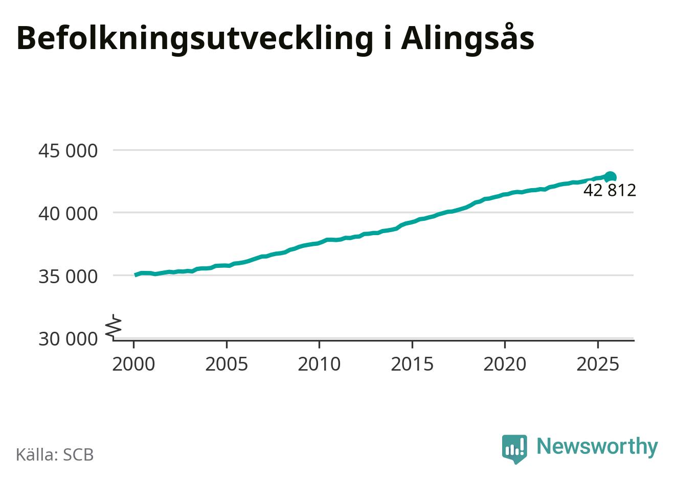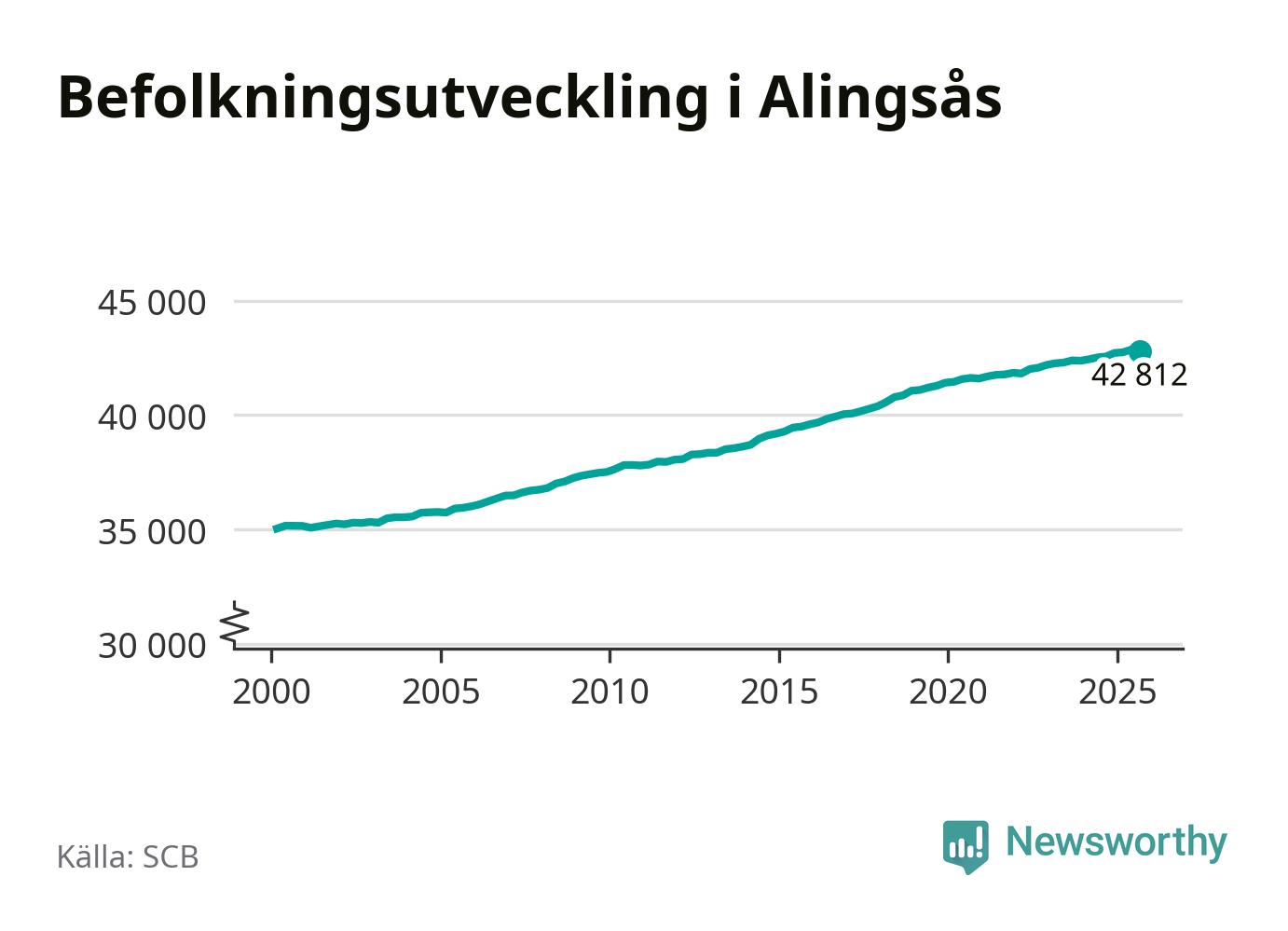 Jämfört med för ett år sedan har befolkningen i Alingsås ökat med ungefär 240 personer – vilket motsvarar en ökning på 0,6 procent. Sedan millennieskiftet har folkmängden ökat med runt 7 780 personer, eller 22 procent.
