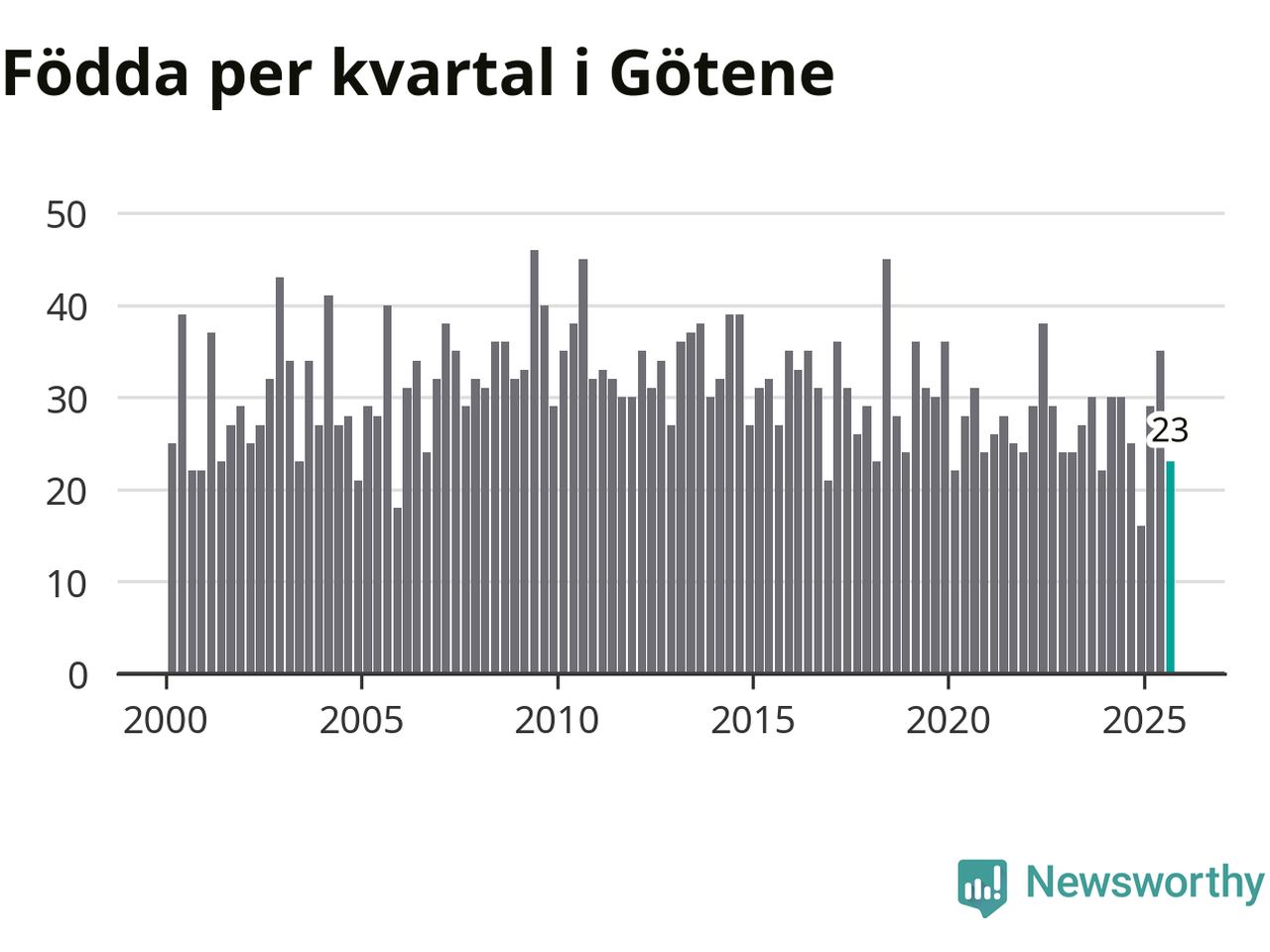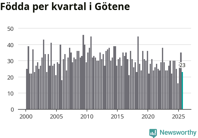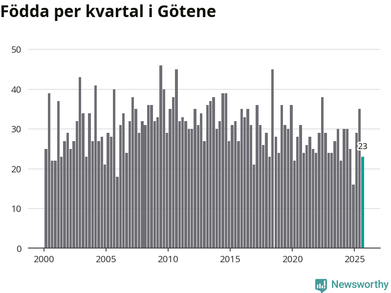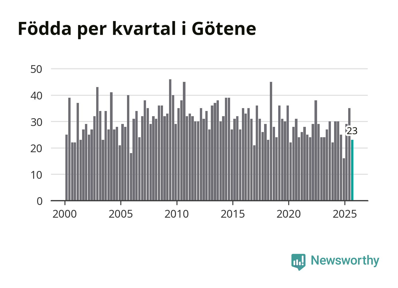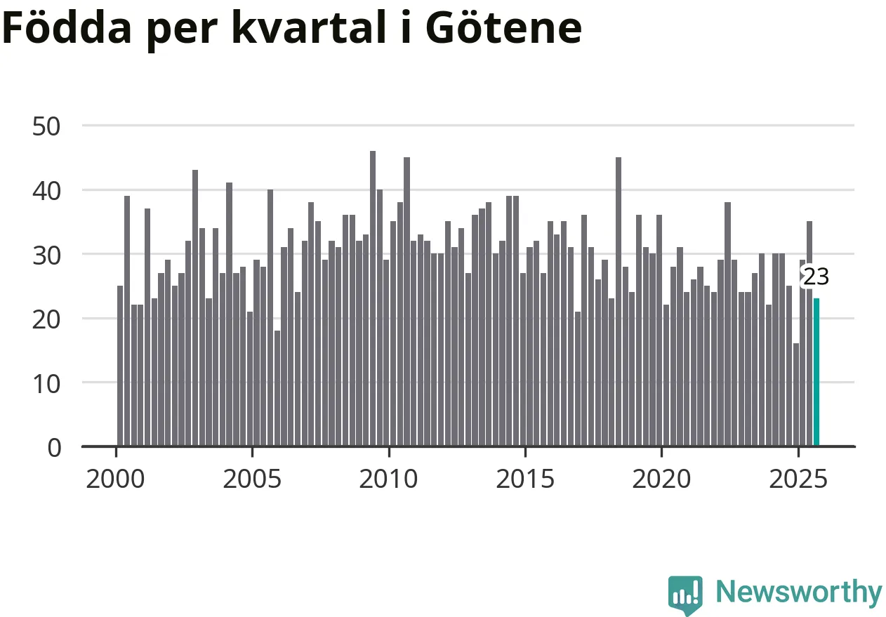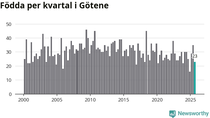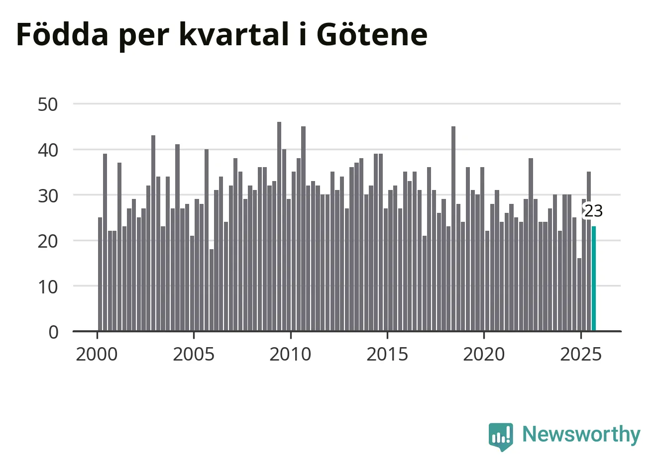 Enligt SCB:s siffror föddes 23 barn i Götene under det senaste kvartalet. Samtidigt avled 36 personer. Götene hade alltså ett negativt födelsenetto, vilket kommunen historiskt sett oftast har haft.