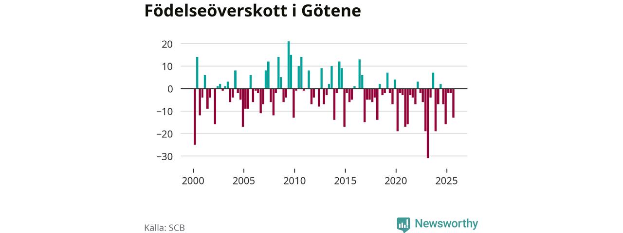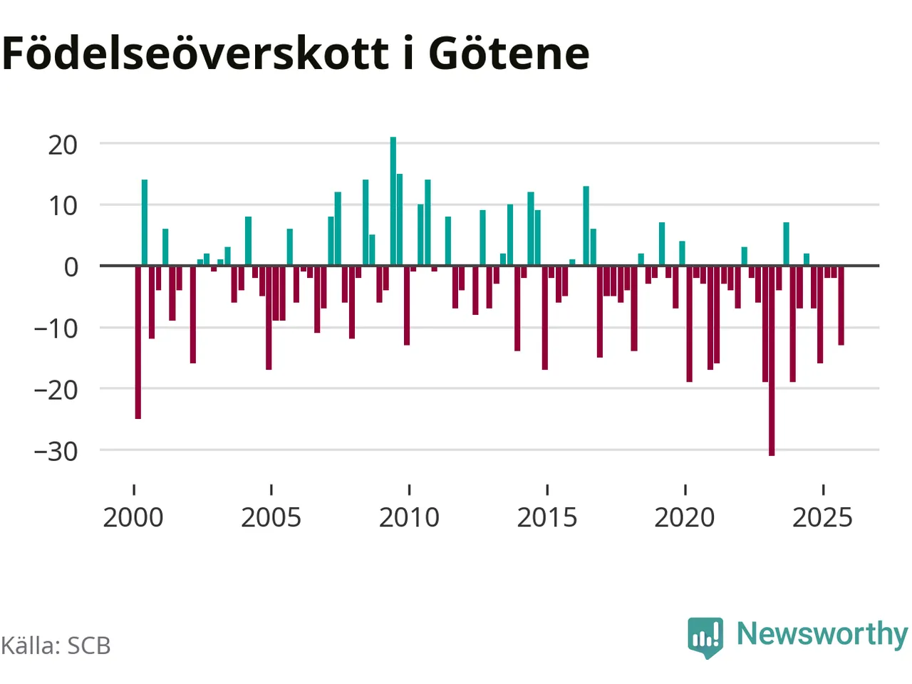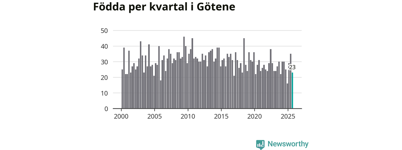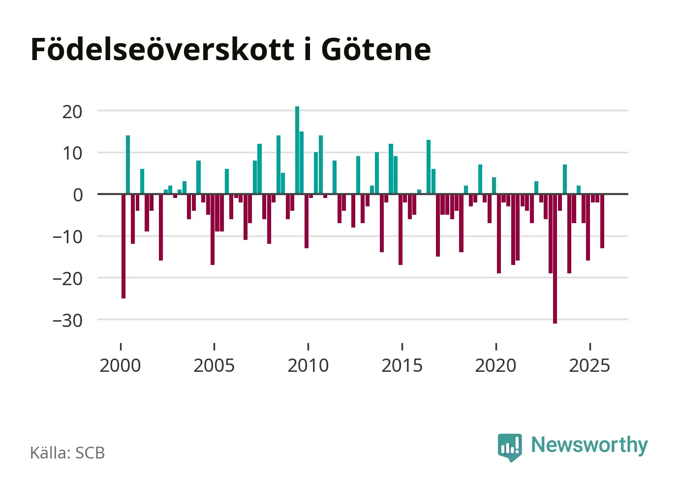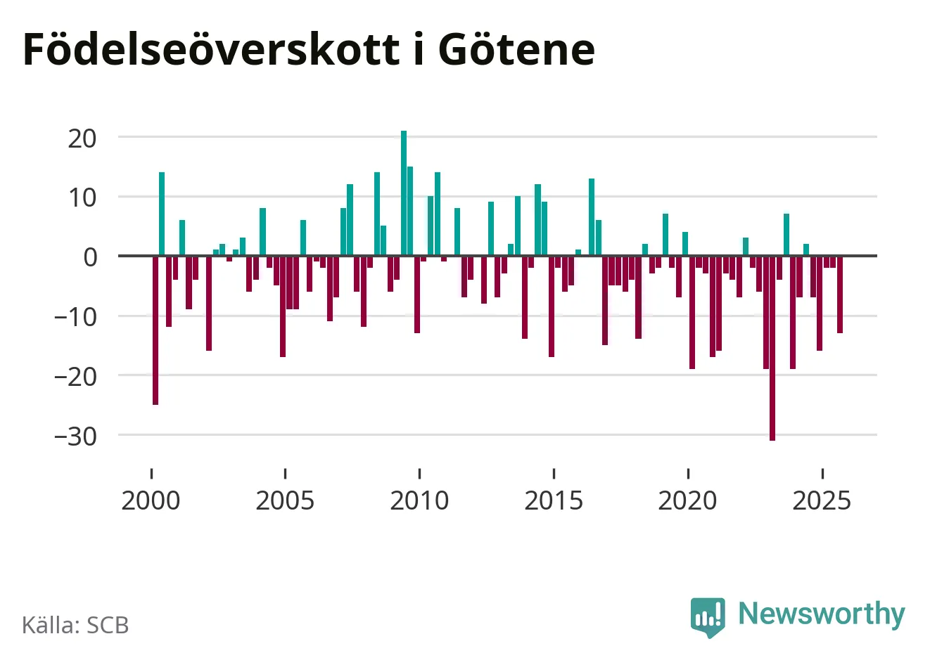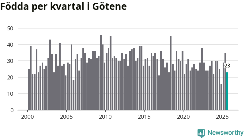 Enligt SCB:s siffror föddes 23 barn i Götene under det senaste kvartalet. Samtidigt avled 36 personer. Götene hade alltså ett negativt födelsenetto, vilket kommunen historiskt sett oftast har haft.