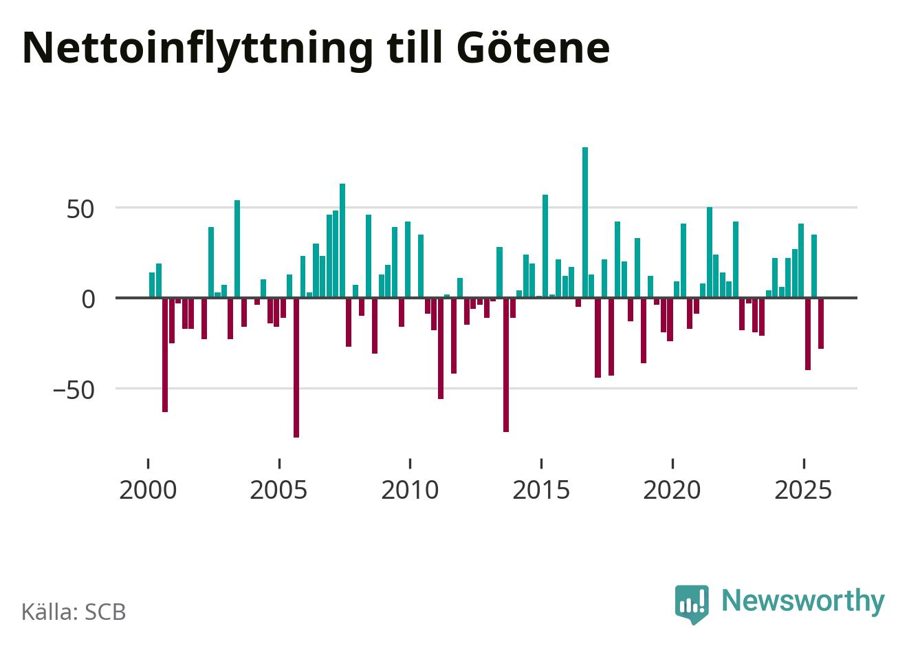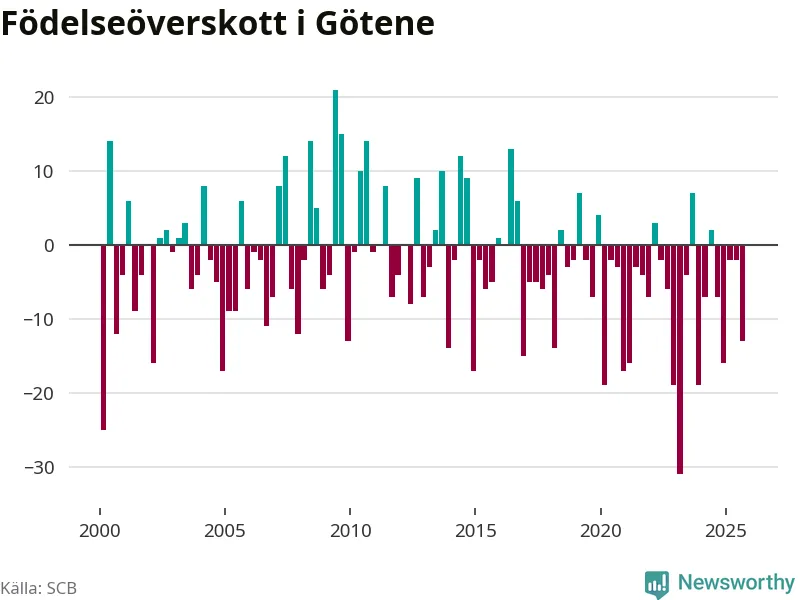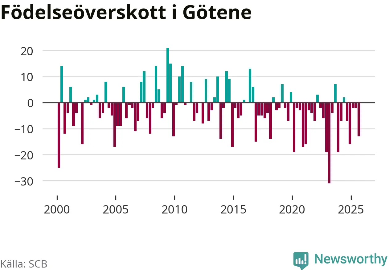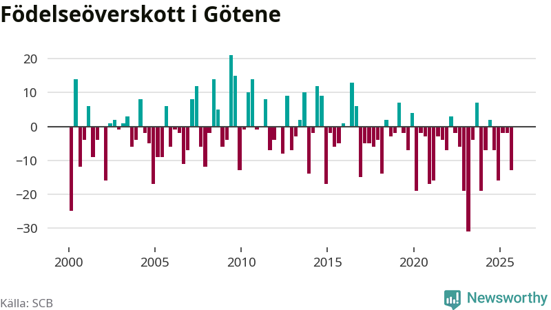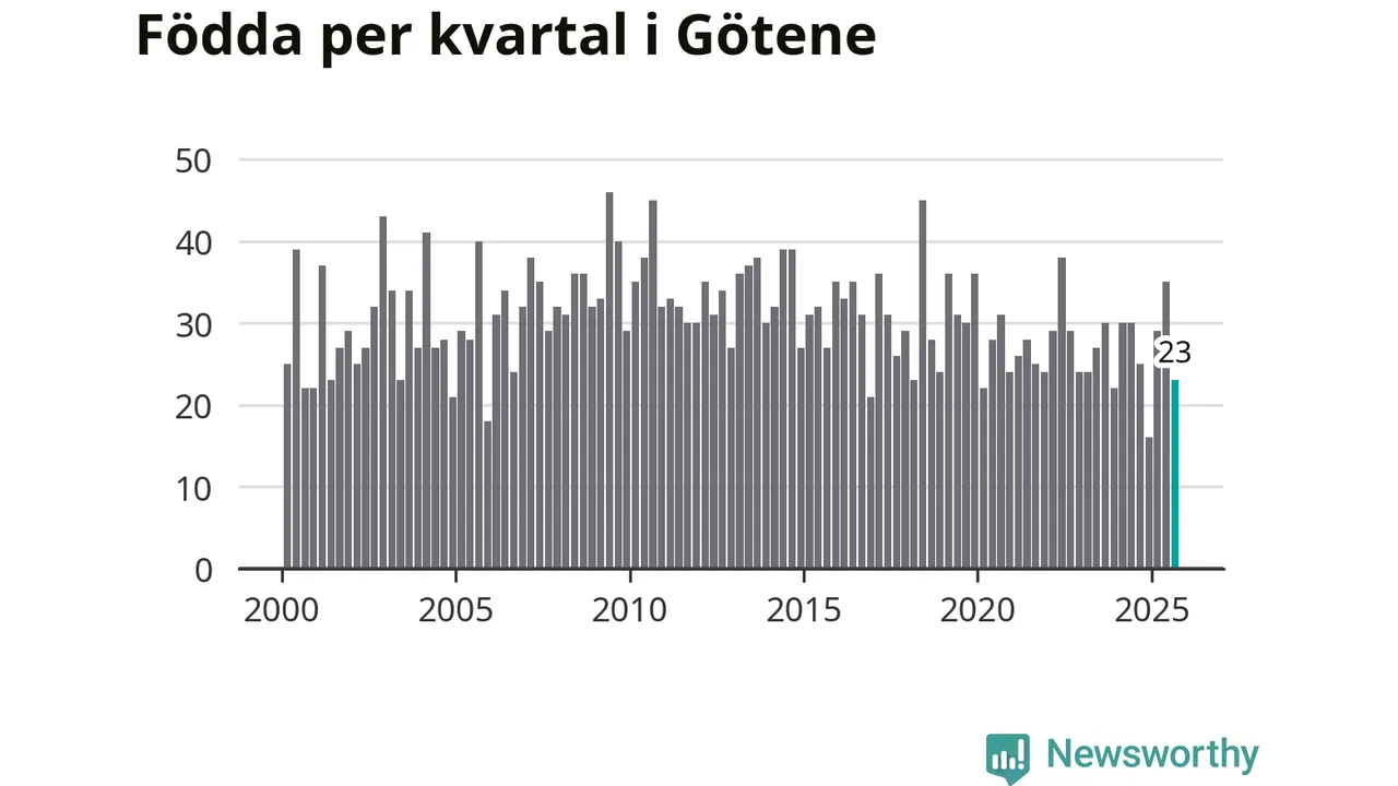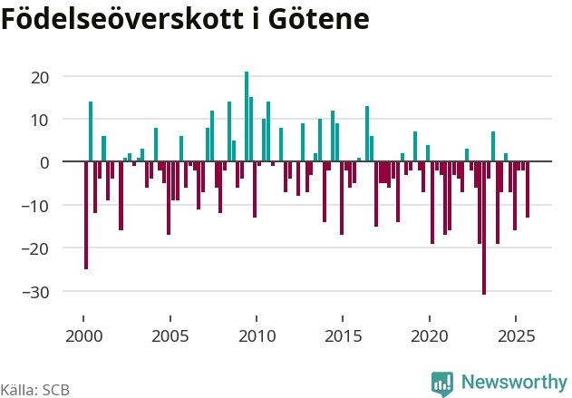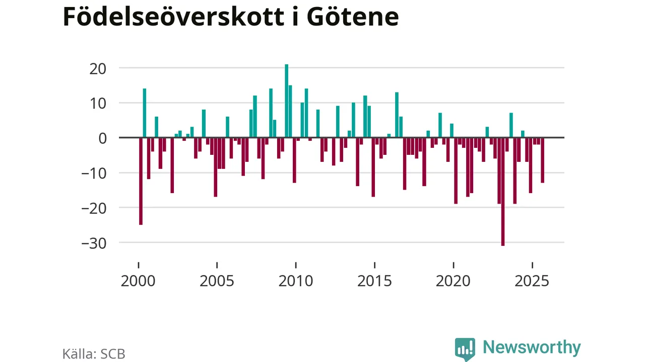 Enligt SCB:s siffror föddes 23 barn i Götene under det senaste kvartalet. Samtidigt avled 36 personer. Götene hade alltså ett negativt födelsenetto, vilket kommunen historiskt sett oftast har haft.