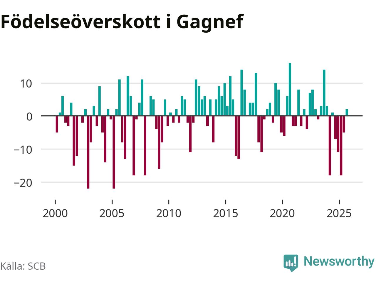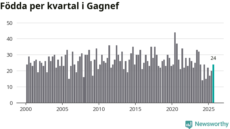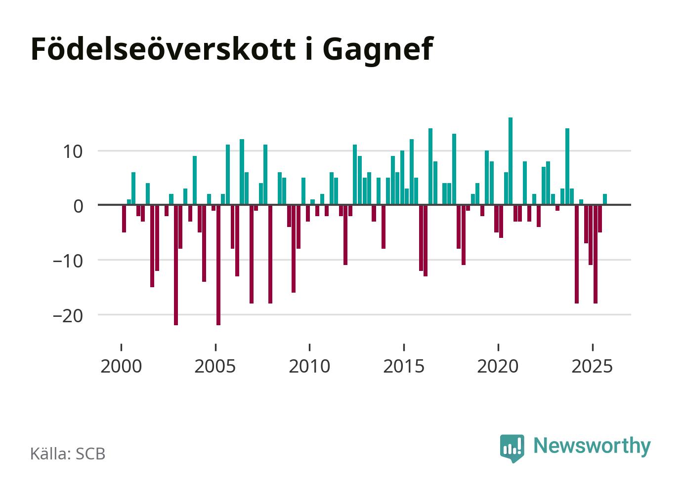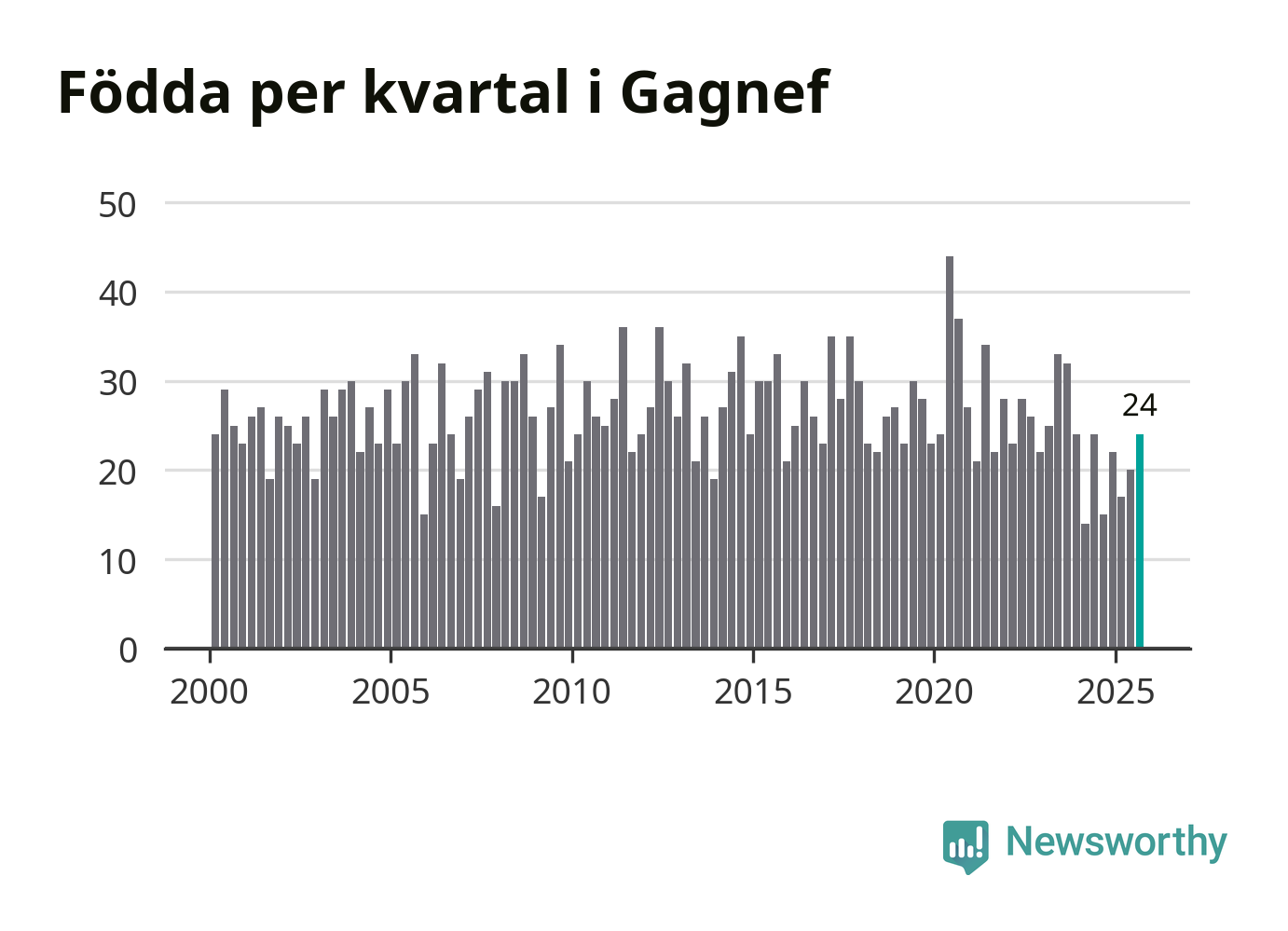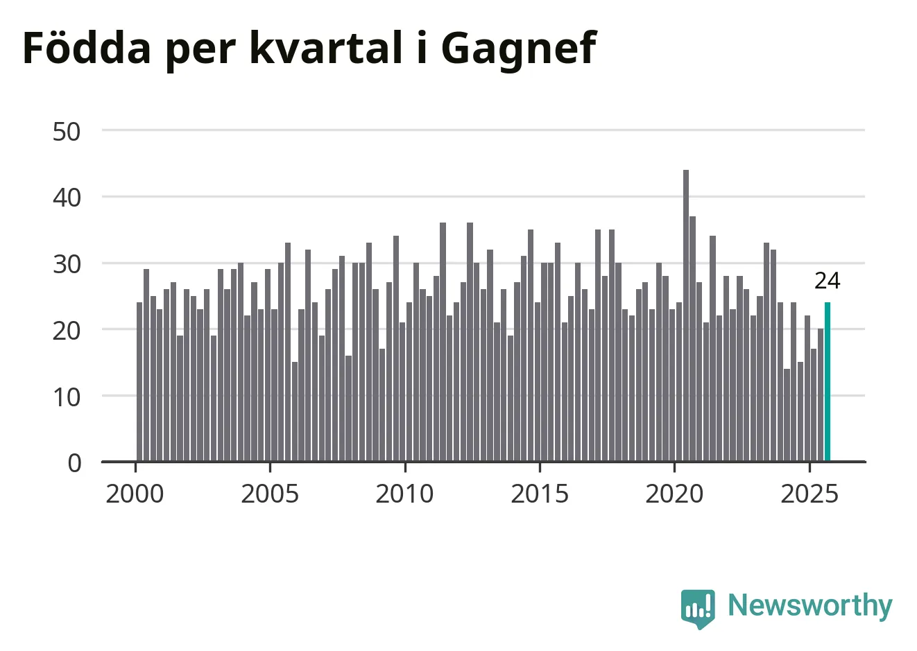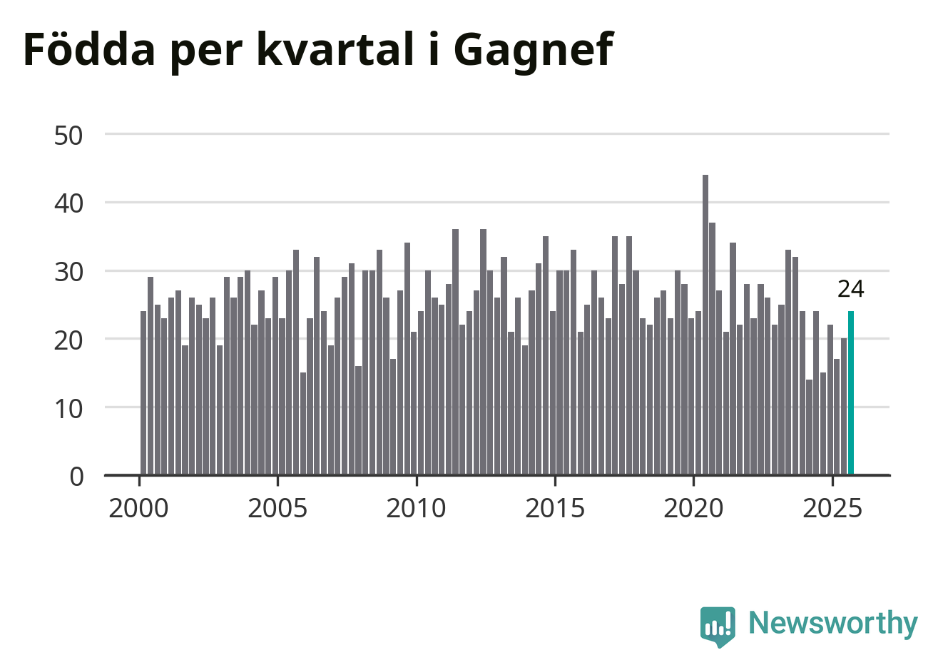 Enligt SCB:s siffror föddes 24 barn i Gagnef under det senaste kvartalet. Samtidigt avled 22 personer. Skillnaden mellan antal födda och döda är så liten att det inte går att säga om det beror på något annat än SCB:s röjandeskydd. Kommunen har historiskt sett haft ungefär lika många kvartal med positivt födelsenetto som negativt.
