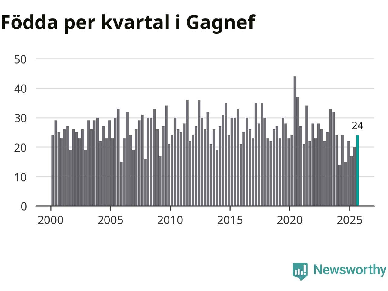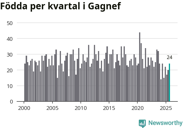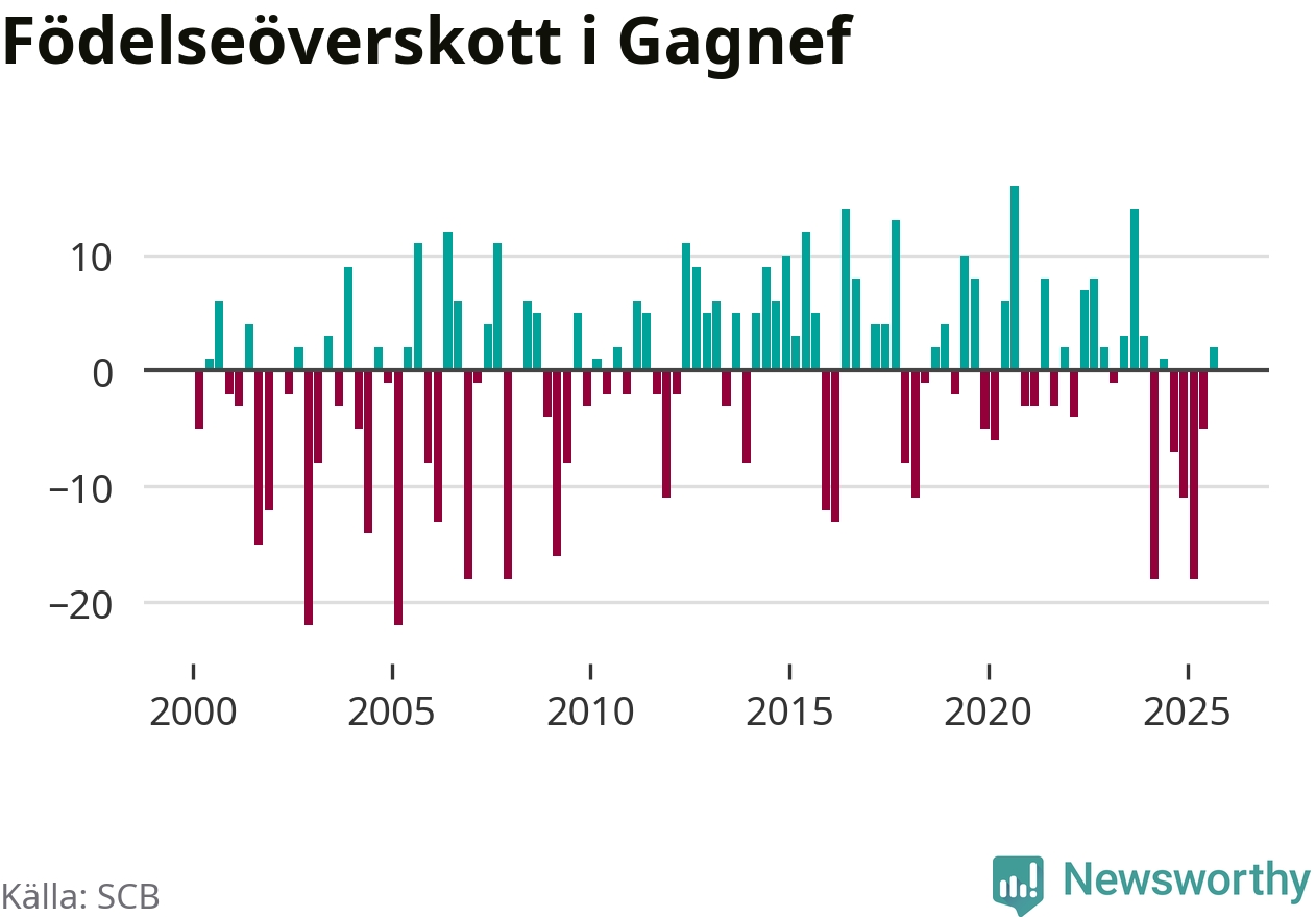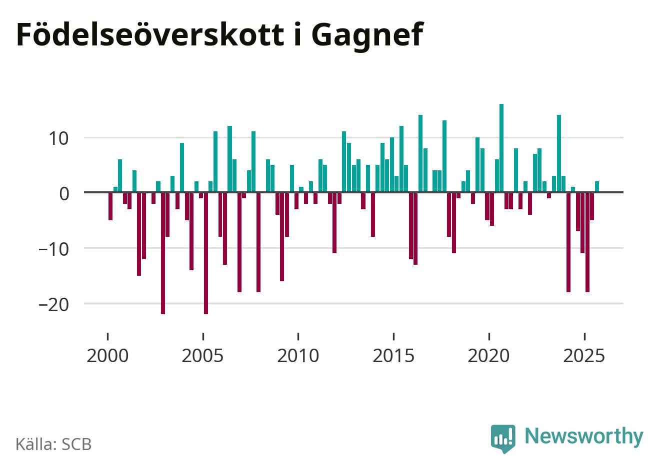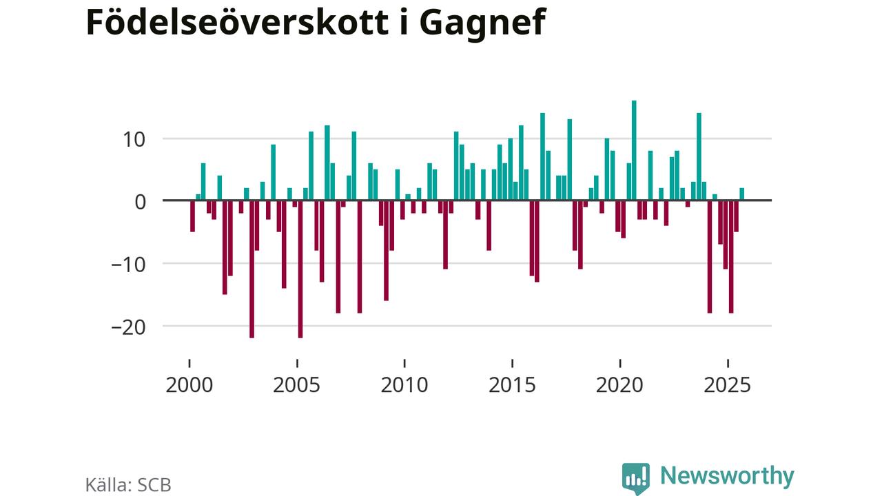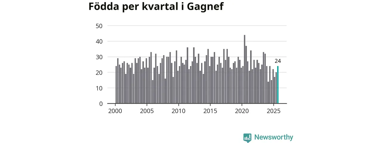 Enligt SCB:s siffror föddes 24 barn i Gagnef under det senaste kvartalet. Samtidigt avled 22 personer. Skillnaden mellan antal födda och döda är så liten att det inte går att säga om det beror på något annat än SCB:s röjandeskydd. Kommunen har historiskt sett haft ungefär lika många kvartal med positivt födelsenetto som negativt.