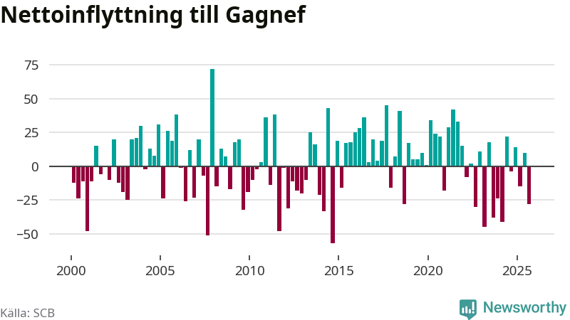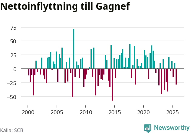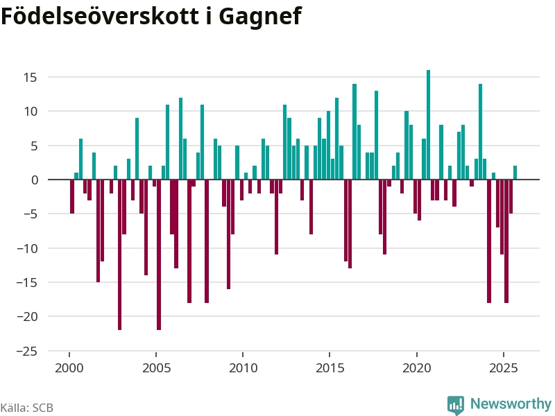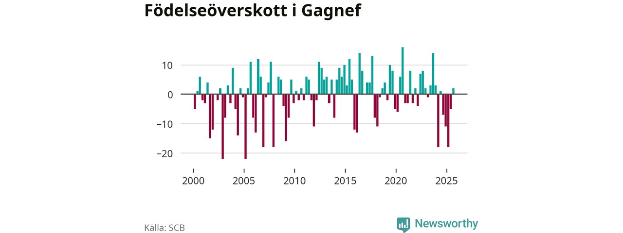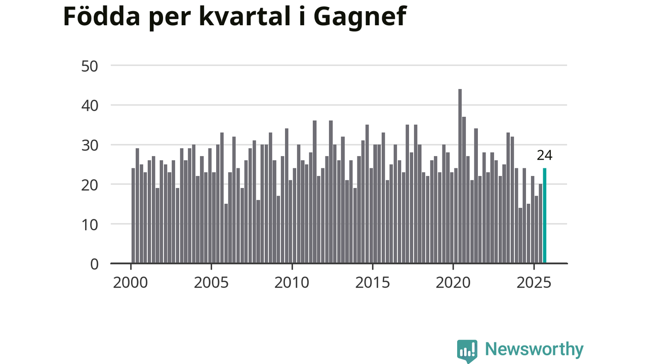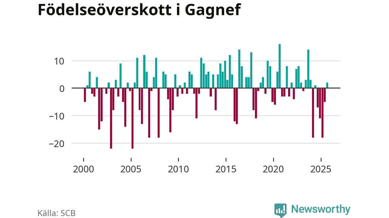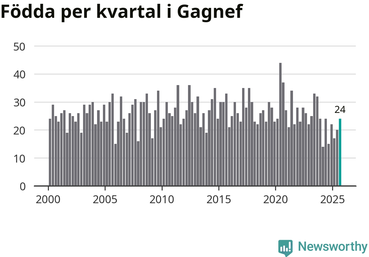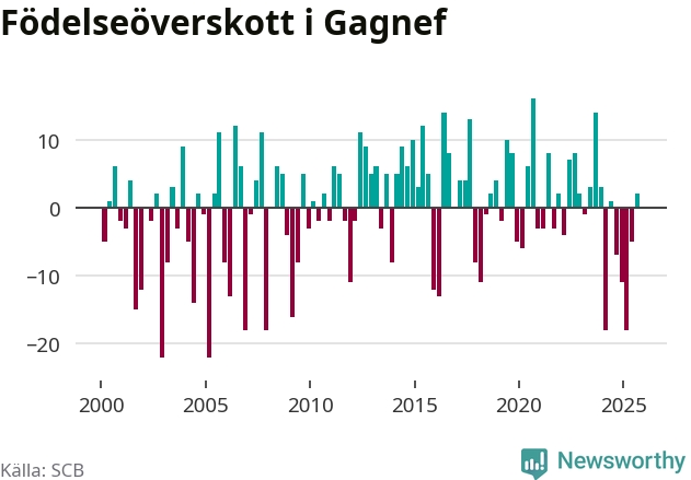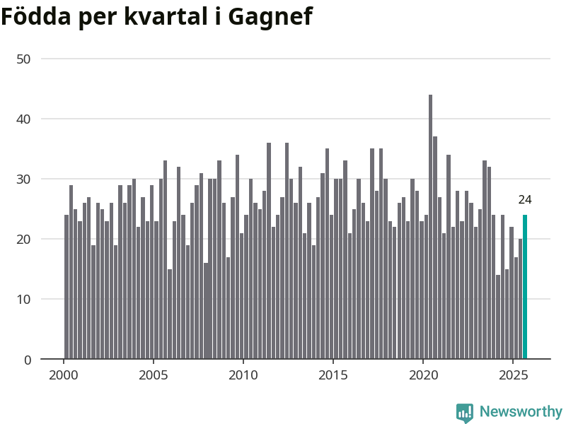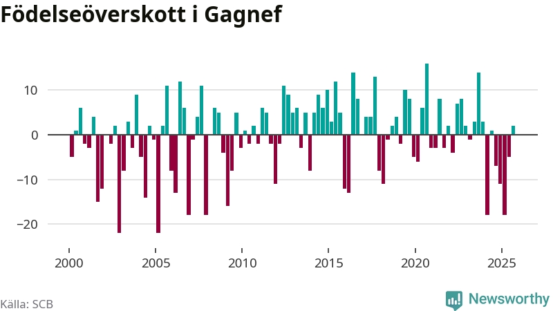 Enligt SCB:s siffror föddes 24 barn i Gagnef under det senaste kvartalet. Samtidigt avled 22 personer. Skillnaden mellan antal födda och döda är så liten att det inte går att säga om det beror på något annat än SCB:s röjandeskydd. Kommunen har historiskt sett haft ungefär lika många kvartal med positivt födelsenetto som negativt.