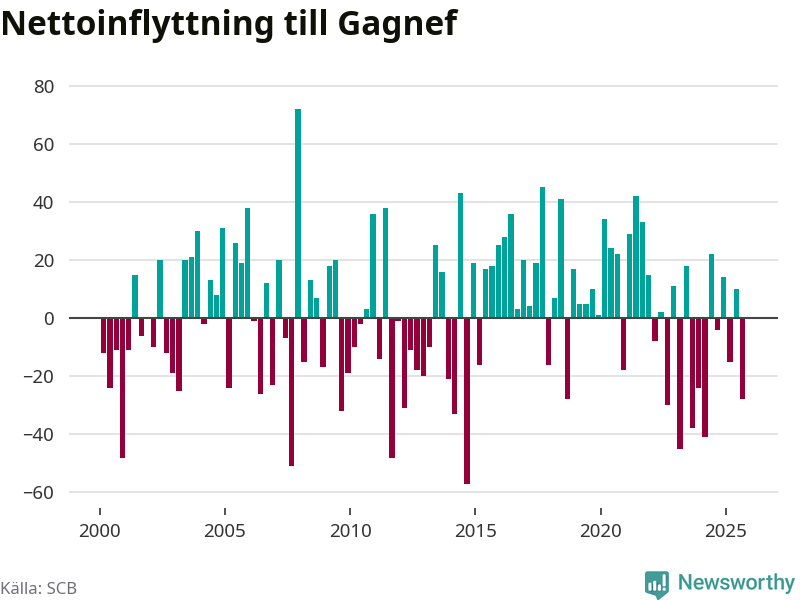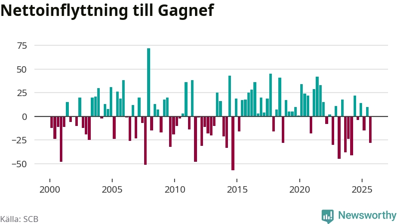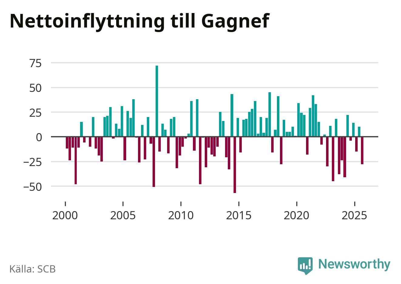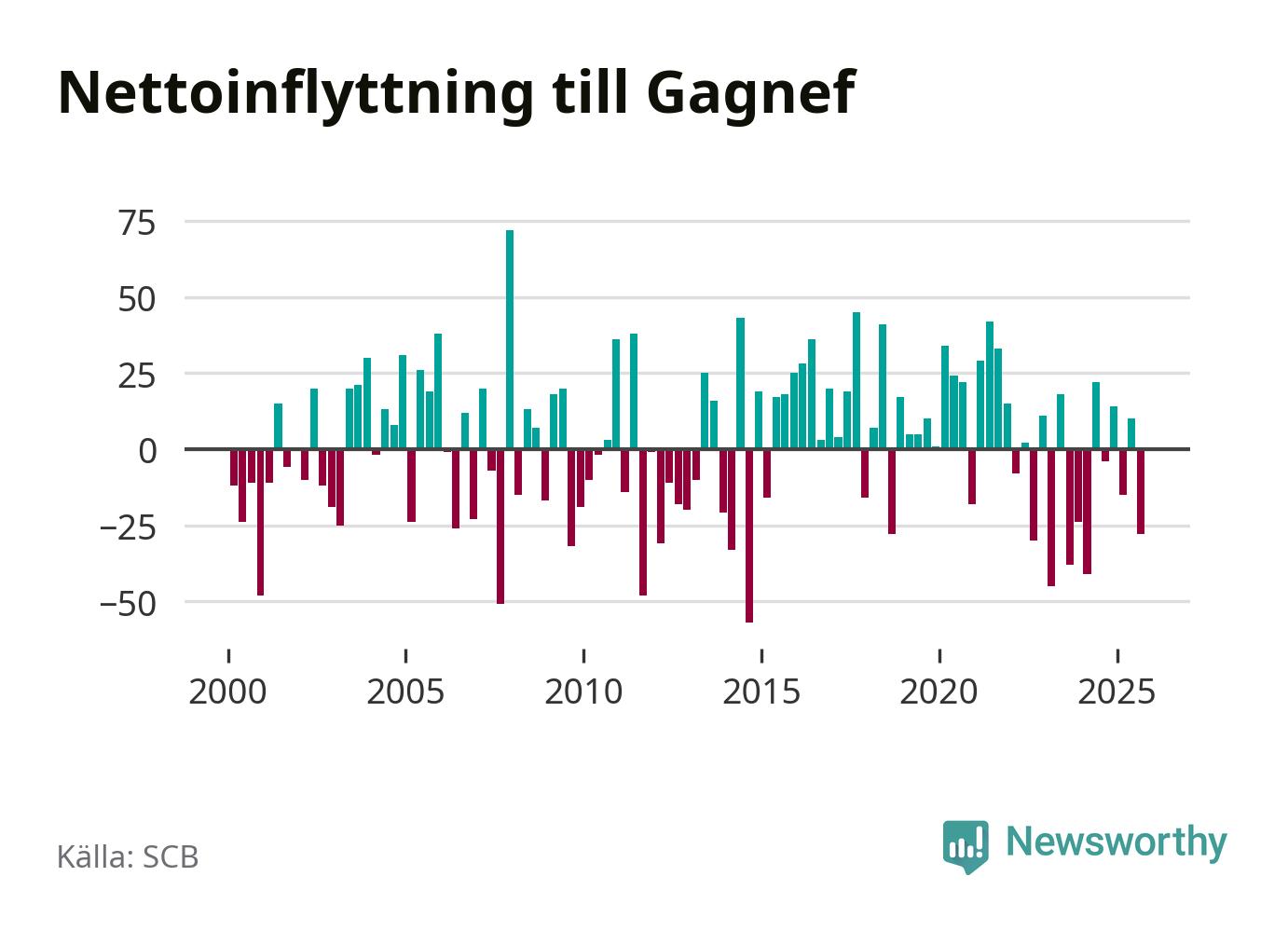 Under tredje kvartalet 2025 flyttade 109 personer till kommunen medan 137 personer flyttade därifrån. Sedan seklets början har Gagnef oftast haft ett positivt flyttnetto.