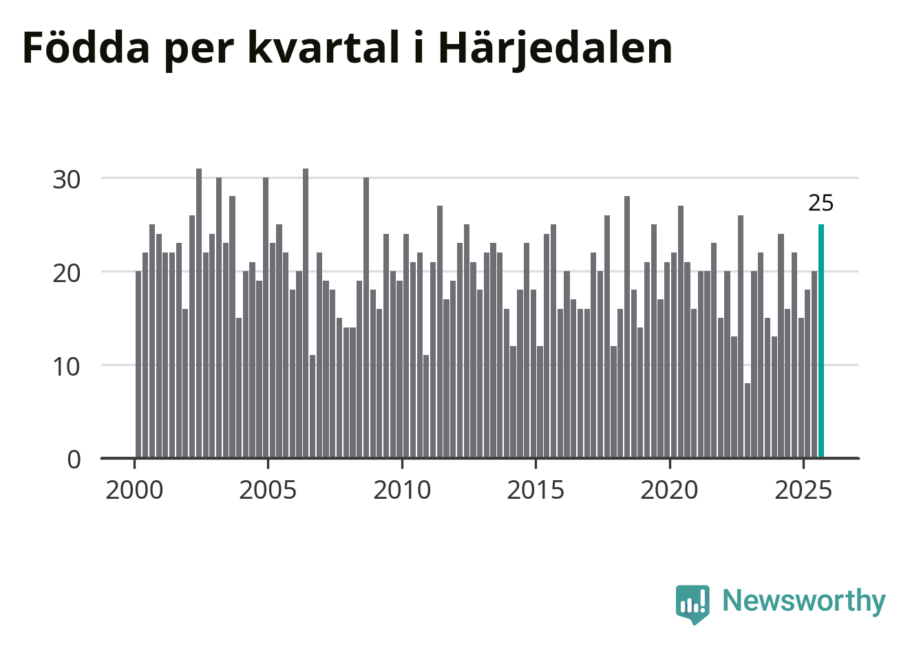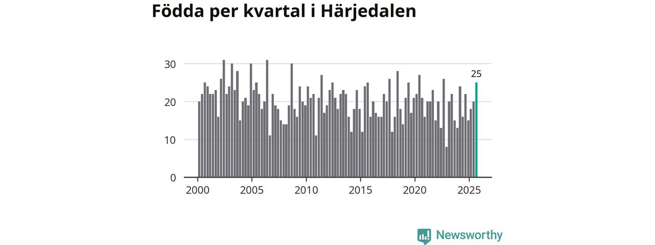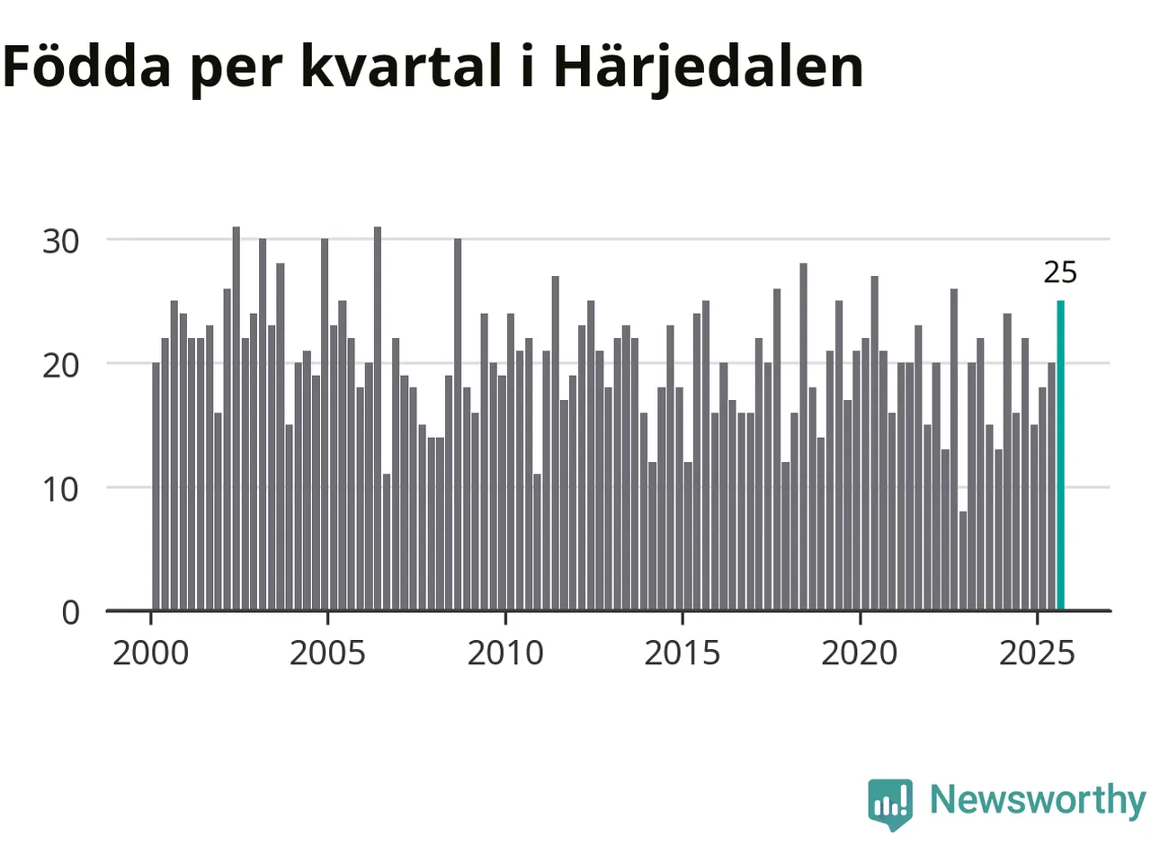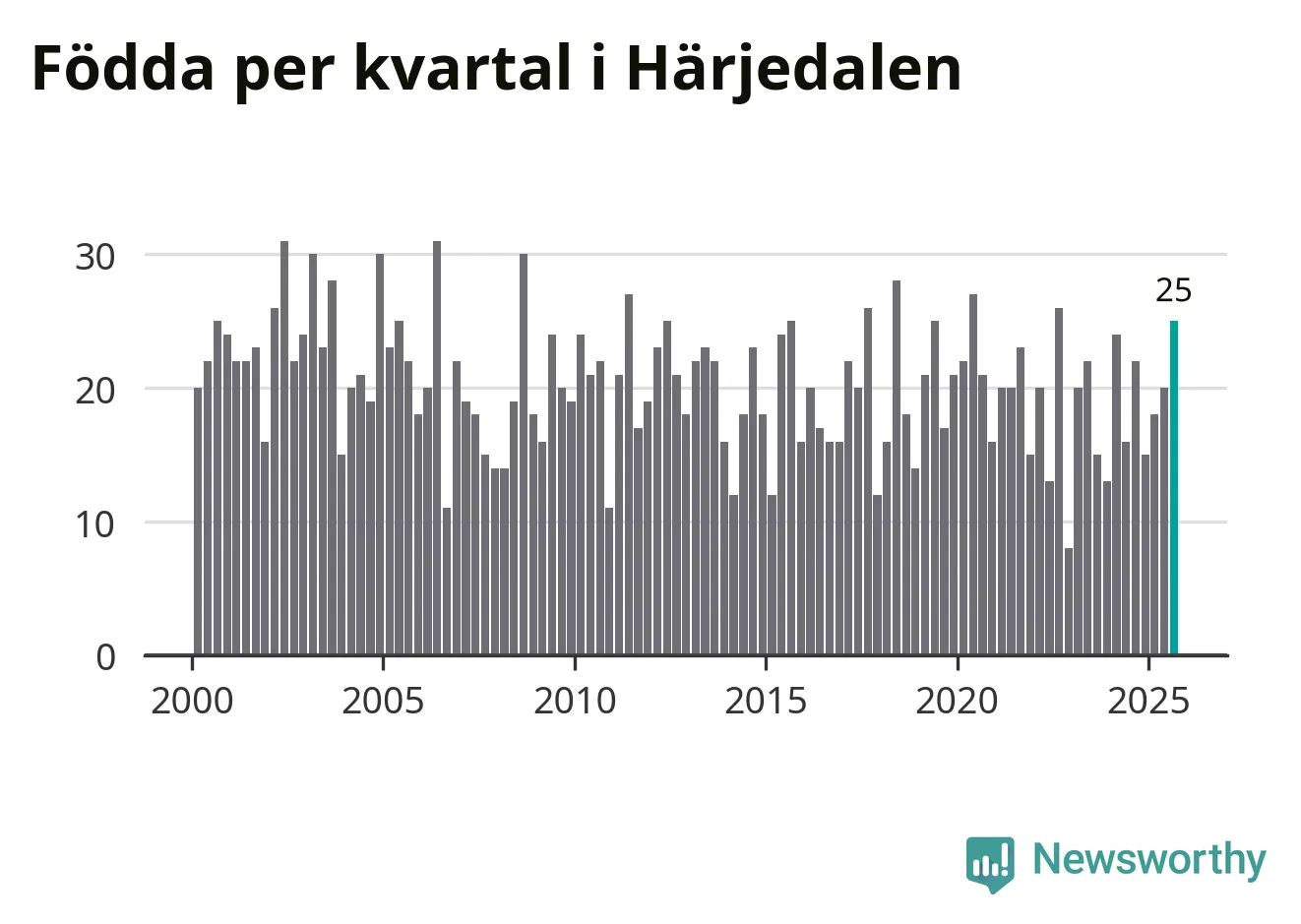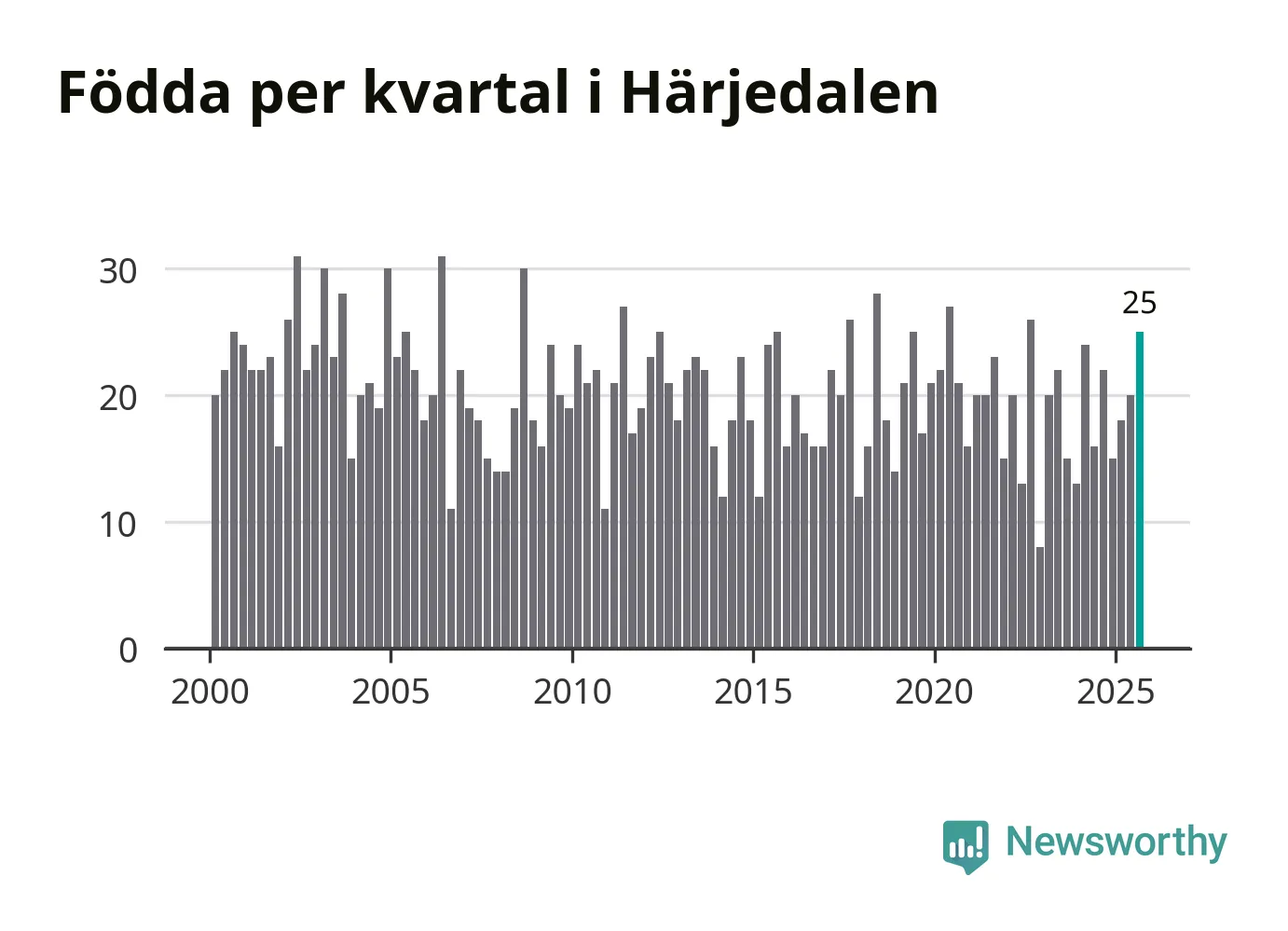 Enligt SCB:s siffror föddes 25 barn i Härjedalen under det senaste kvartalet, vilket är en relativt hög siffra historiskt sett. Samtidigt avled 41 personer. Härjedalen hade alltså ett negativt födelsenetto, vilket kommunen historiskt sett i princip alltid har haft.