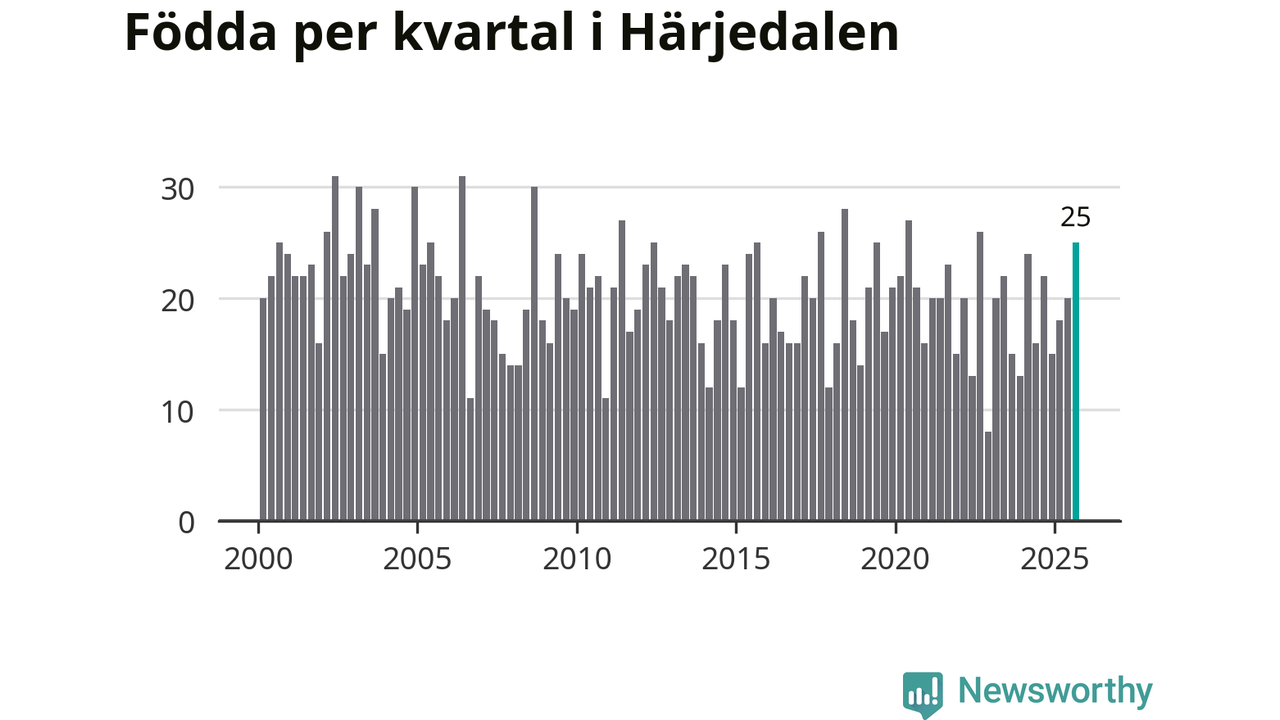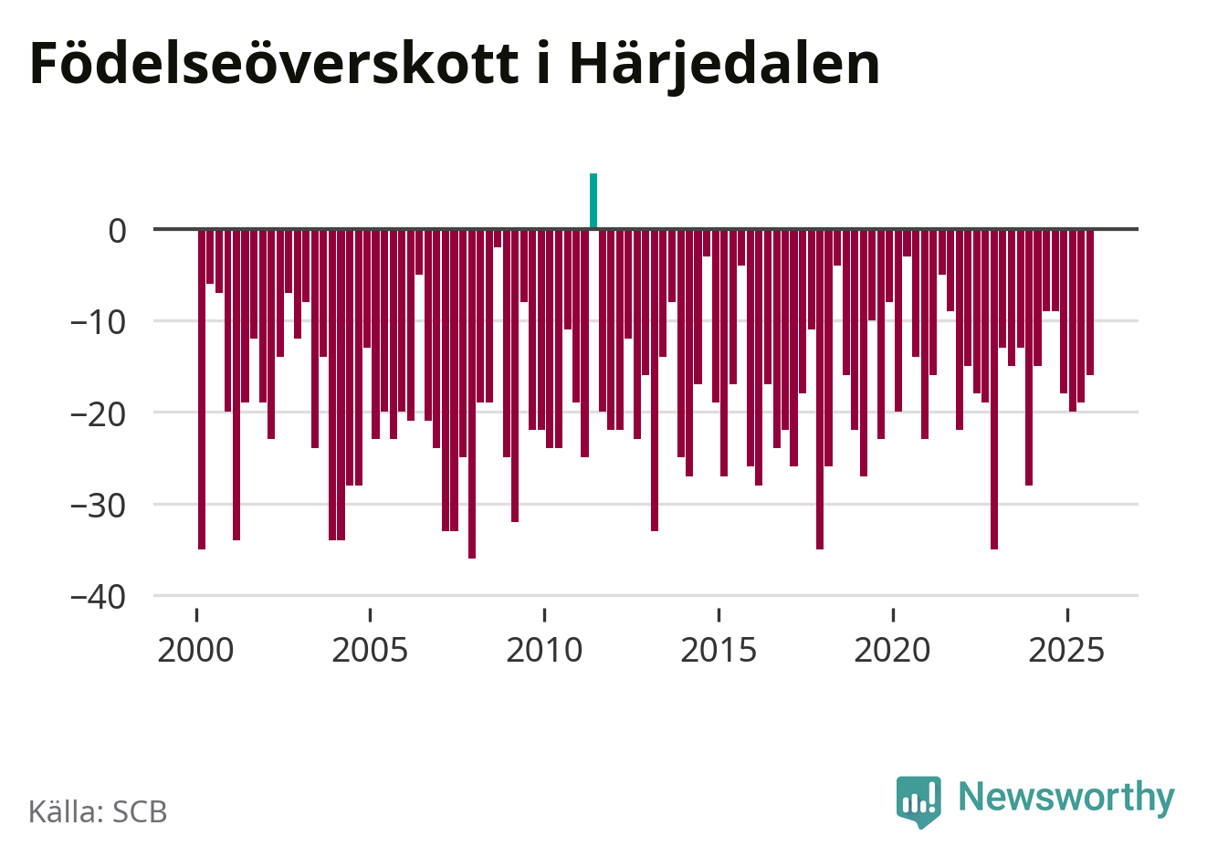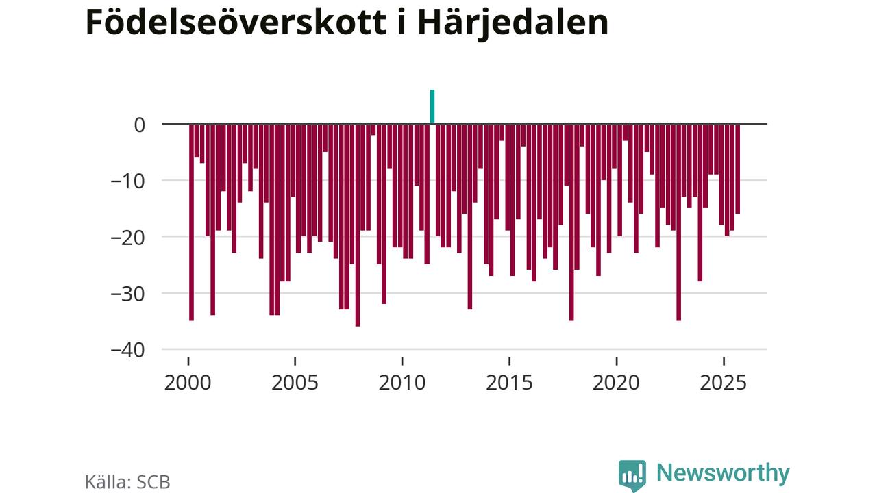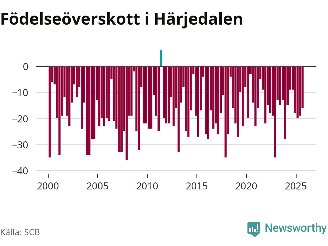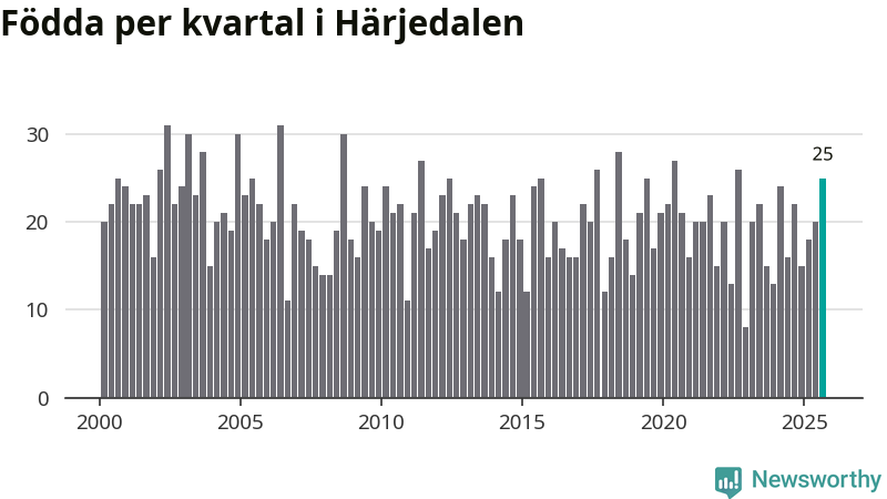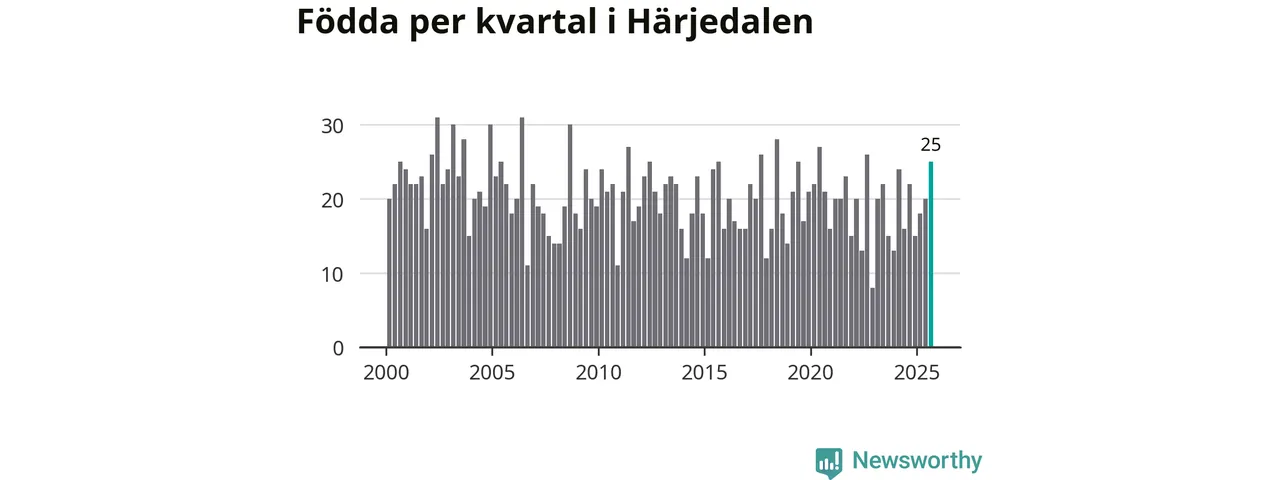 Enligt SCB:s siffror föddes 25 barn i Härjedalen under det senaste kvartalet, vilket är en relativt hög siffra historiskt sett. Samtidigt avled 41 personer. Härjedalen hade alltså ett negativt födelsenetto, vilket kommunen historiskt sett i princip alltid har haft.