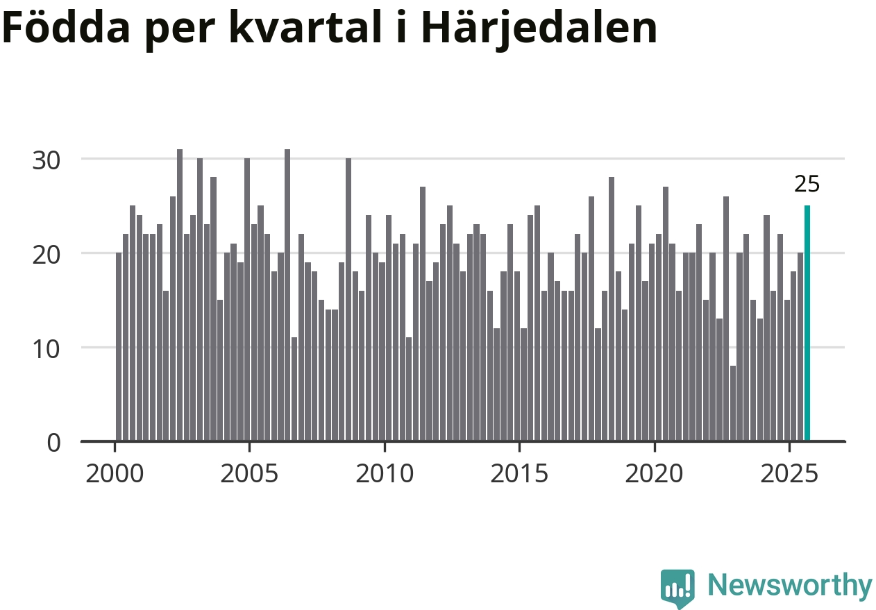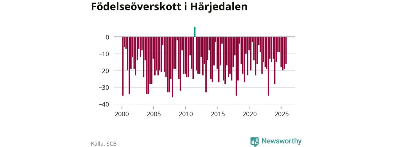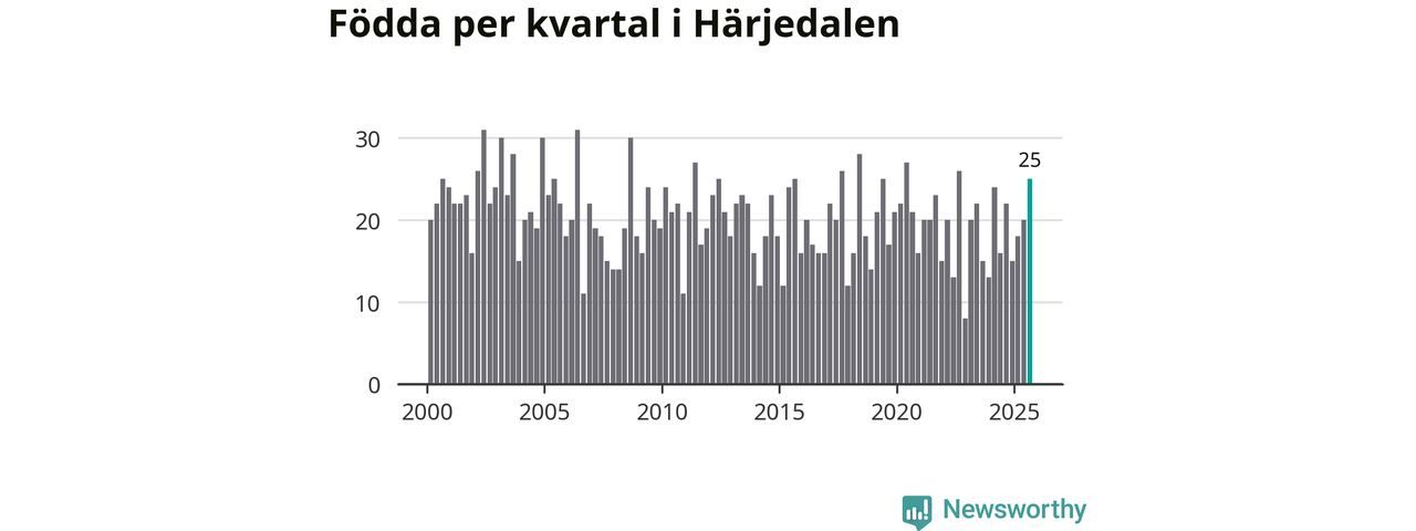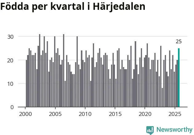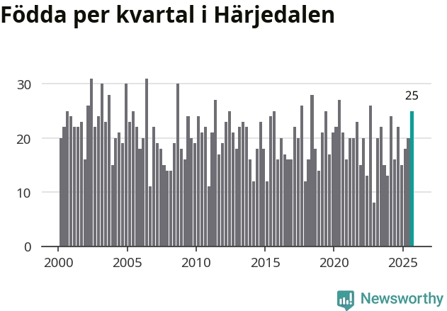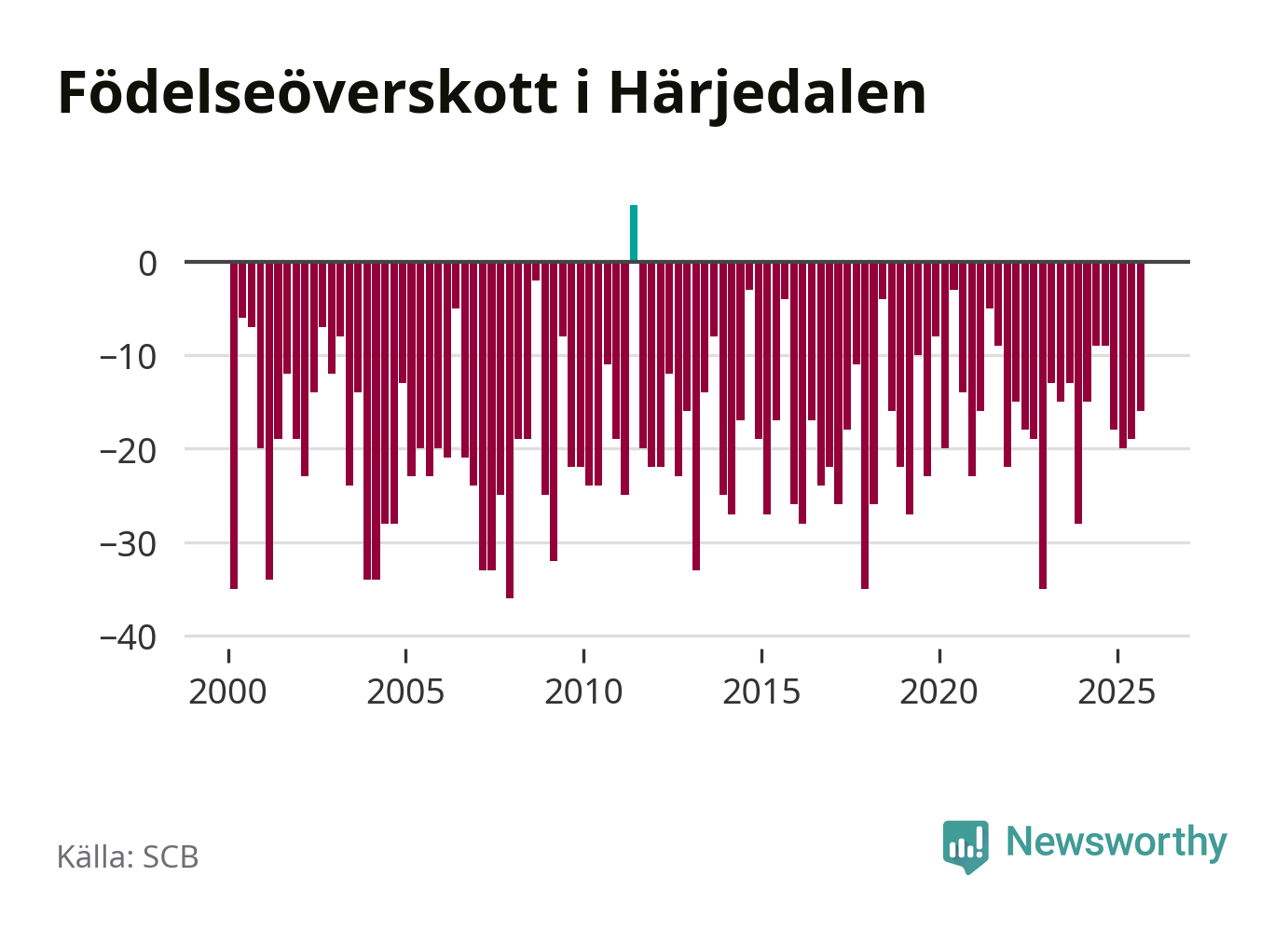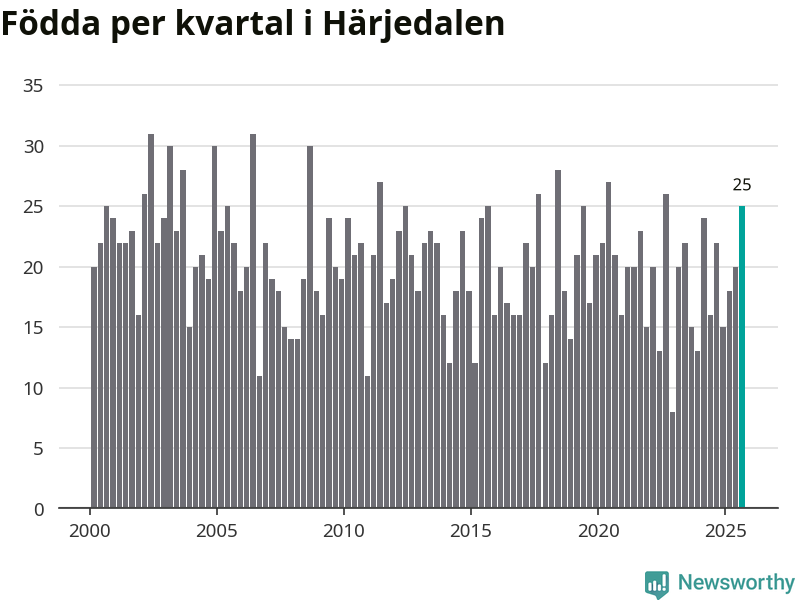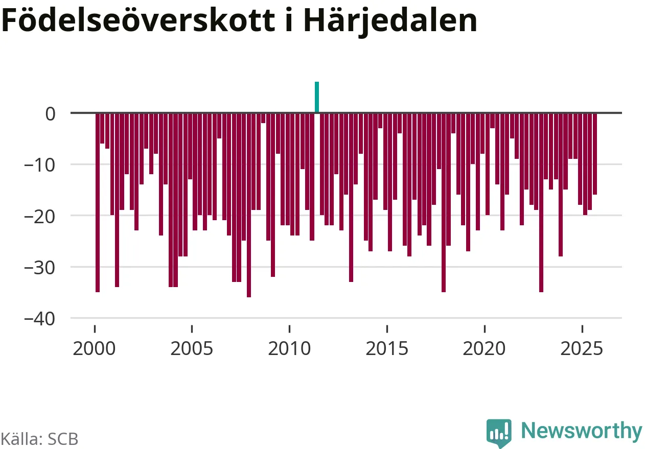 Enligt SCB:s siffror föddes 25 barn i Härjedalen under det senaste kvartalet, vilket är en relativt hög siffra historiskt sett. Samtidigt avled 41 personer. Härjedalen hade alltså ett negativt födelsenetto, vilket kommunen historiskt sett i princip alltid har haft.