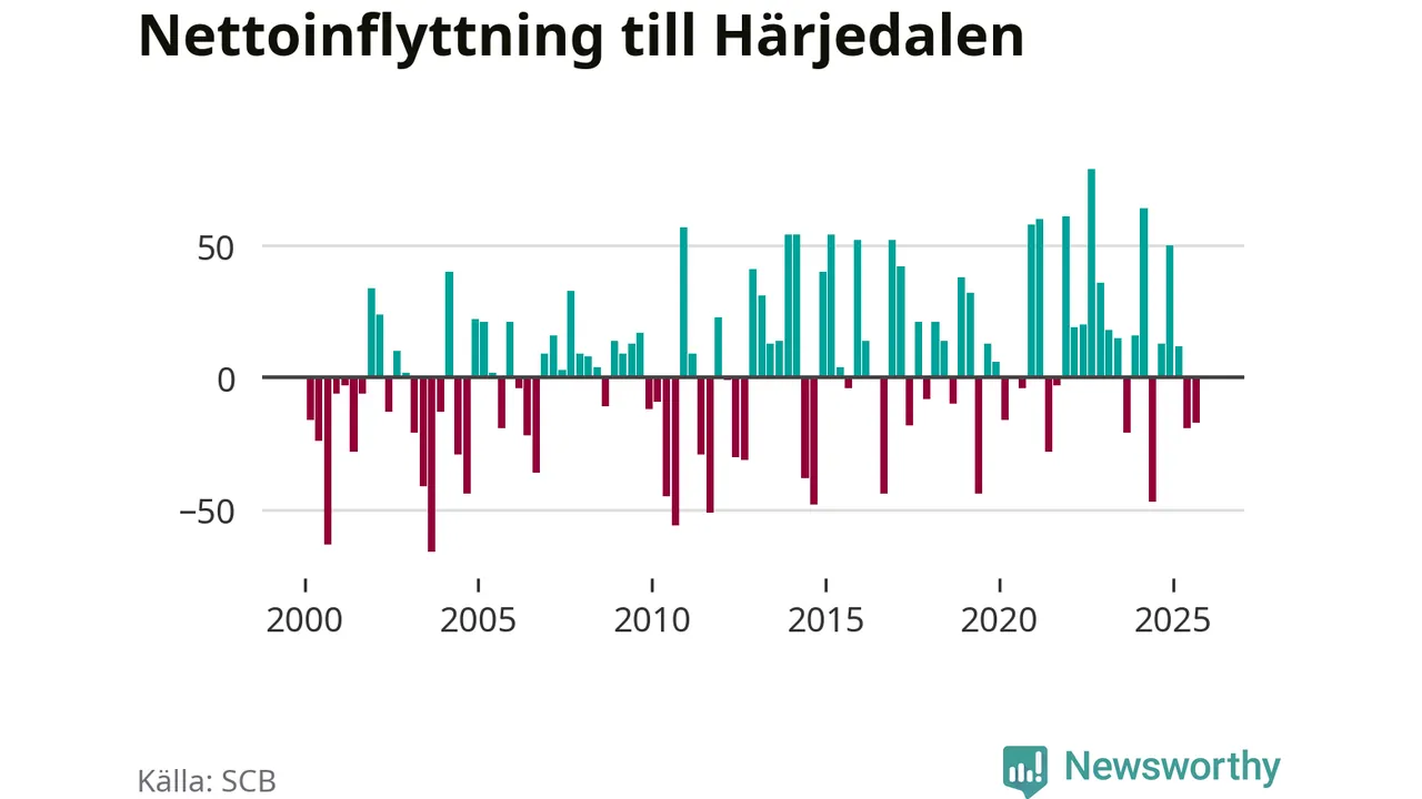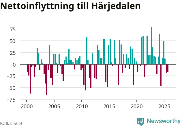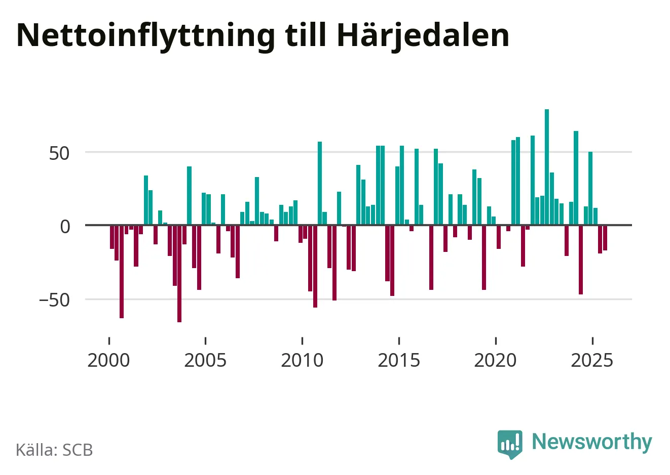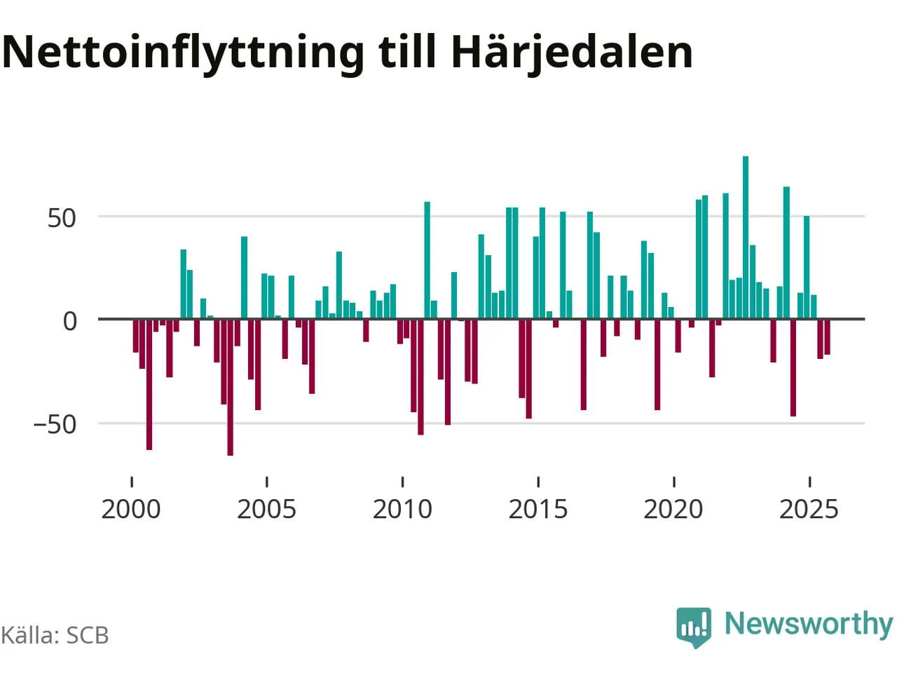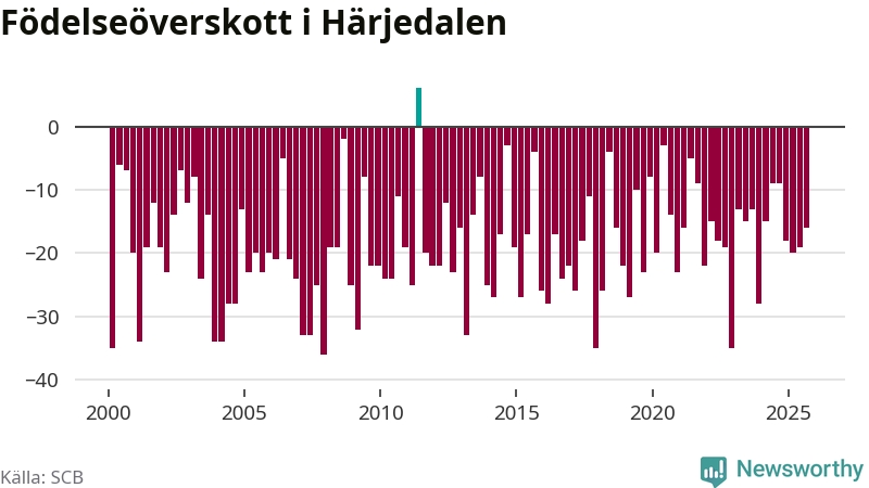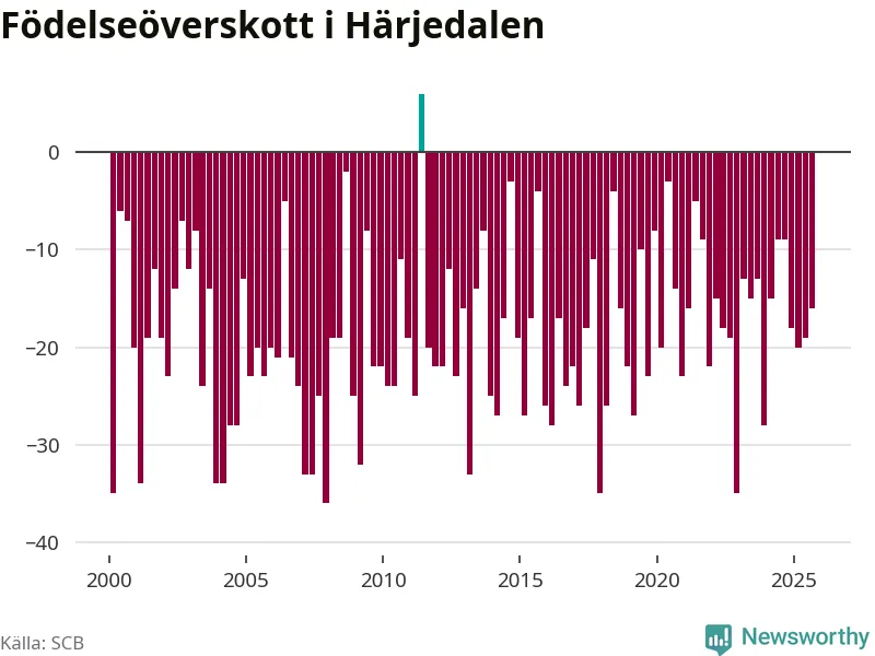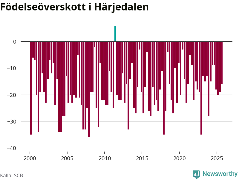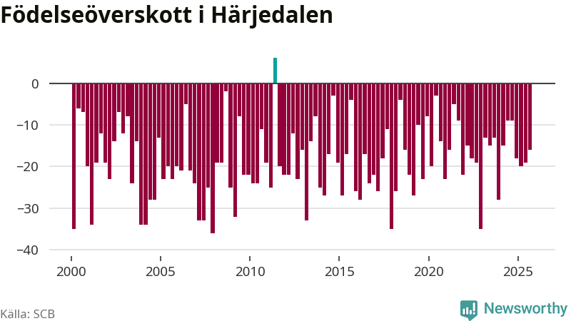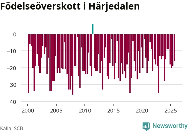 Enligt SCB:s siffror föddes 25 barn i Härjedalen under det senaste kvartalet, vilket är en relativt hög siffra historiskt sett. Samtidigt avled 41 personer. Härjedalen hade alltså ett negativt födelsenetto, vilket kommunen historiskt sett i princip alltid har haft.