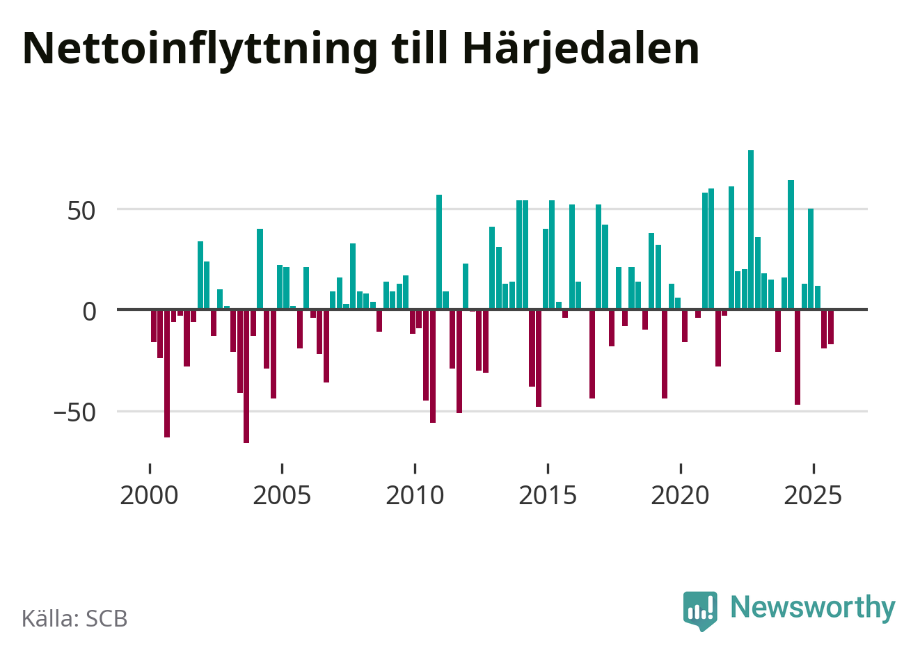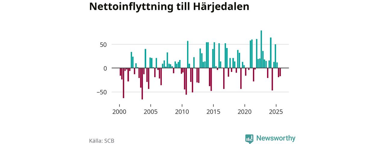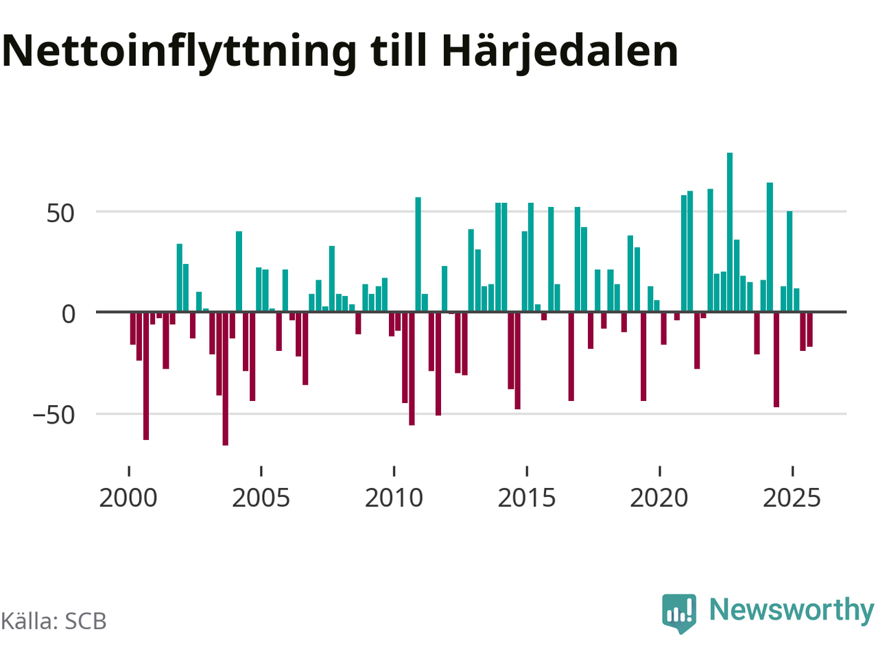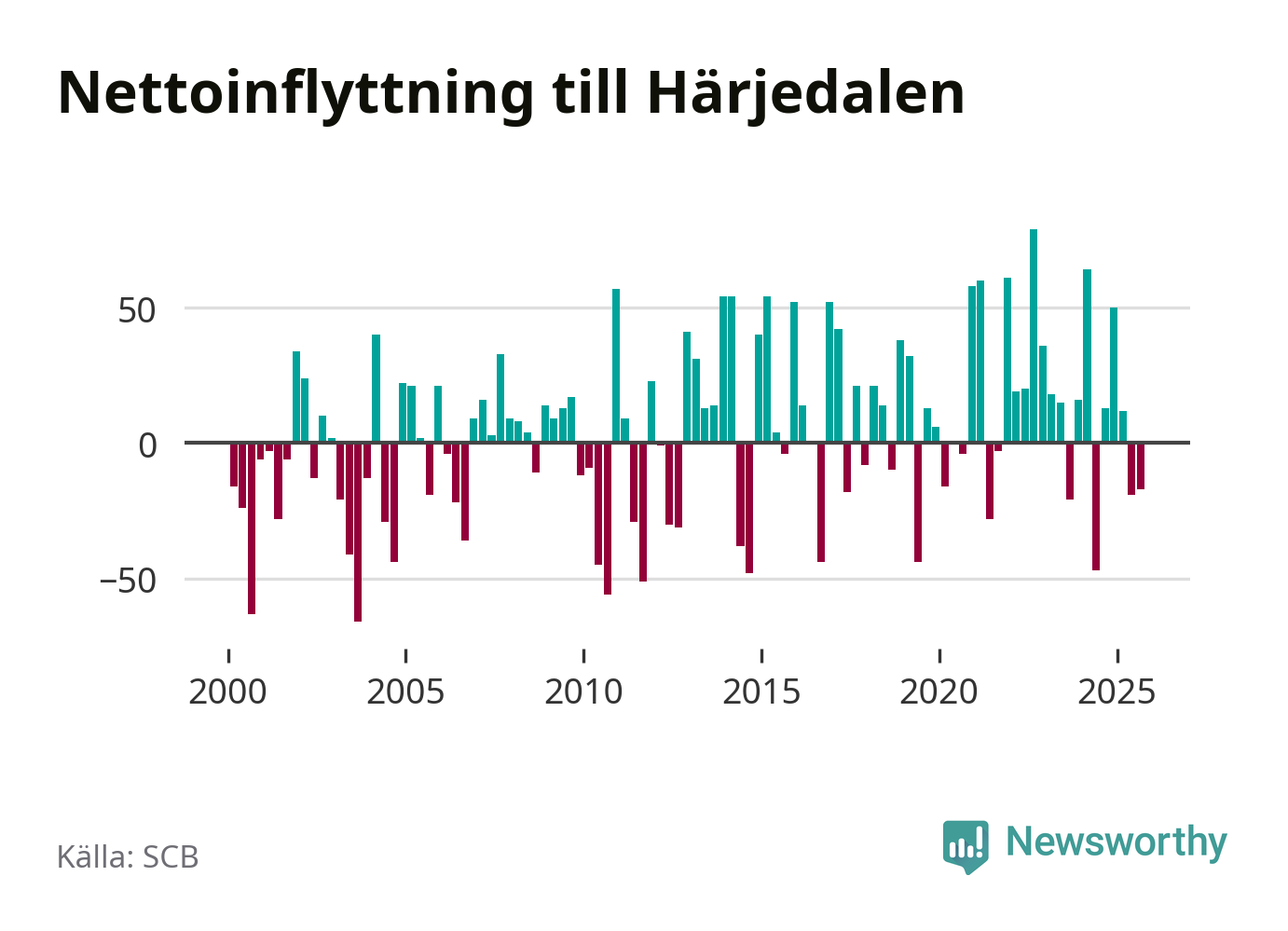 Under tredje kvartalet 2025 flyttade 148 personer till kommunen medan 165 personer flyttade därifrån. Sedan seklets början har Härjedalen oftast haft ett positivt flyttnetto.