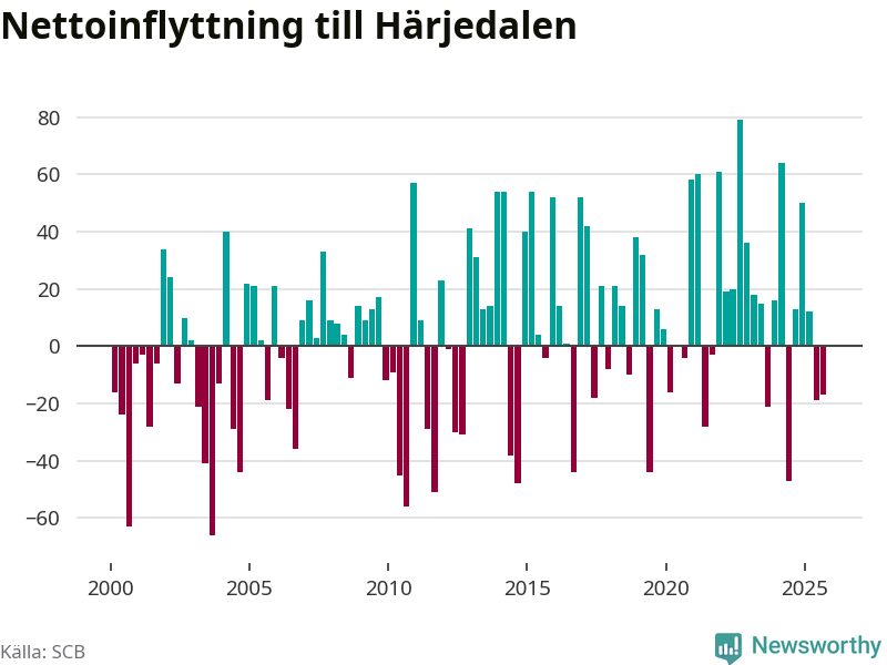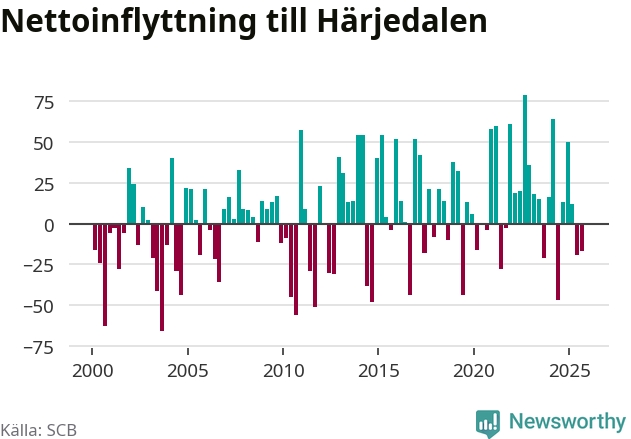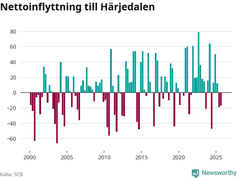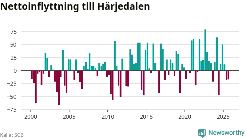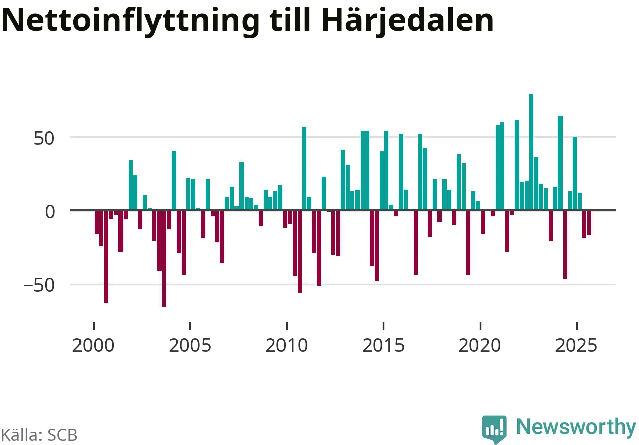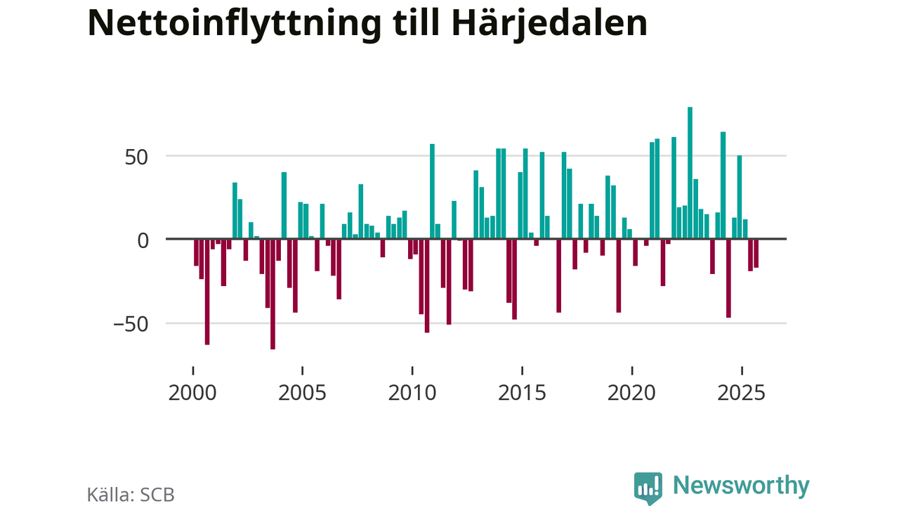 Under tredje kvartalet 2025 flyttade 148 personer till kommunen medan 165 personer flyttade därifrån. Sedan seklets början har Härjedalen oftast haft ett positivt flyttnetto.