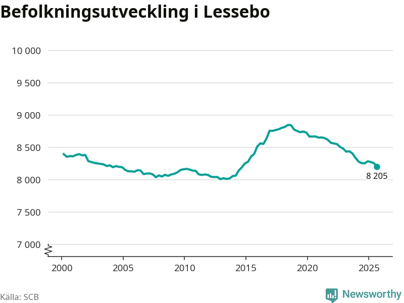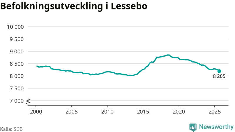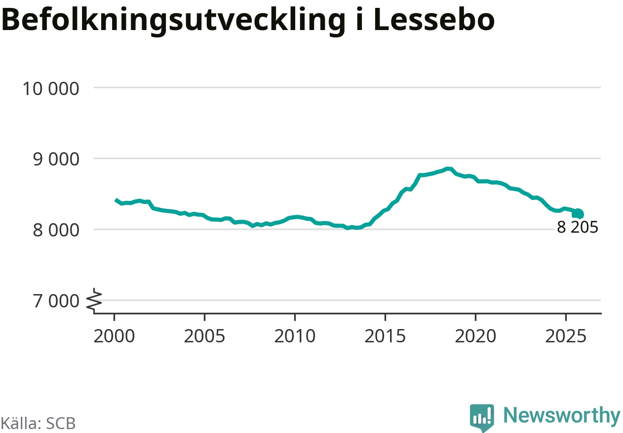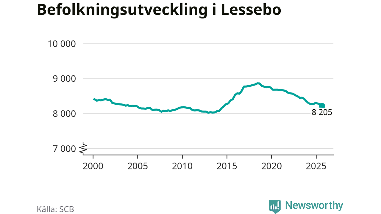 Befolkningen minskade i Lessebo kommun under det tredje kvartalet 2025. Den 30 september bodde enligt SCB:s senaste siffror 8 205 personer i kommunen, vilket är 55 färre än i slutet av andra kvartalet. Minskningen är procentuellt sett en av de största i Kronoberg.