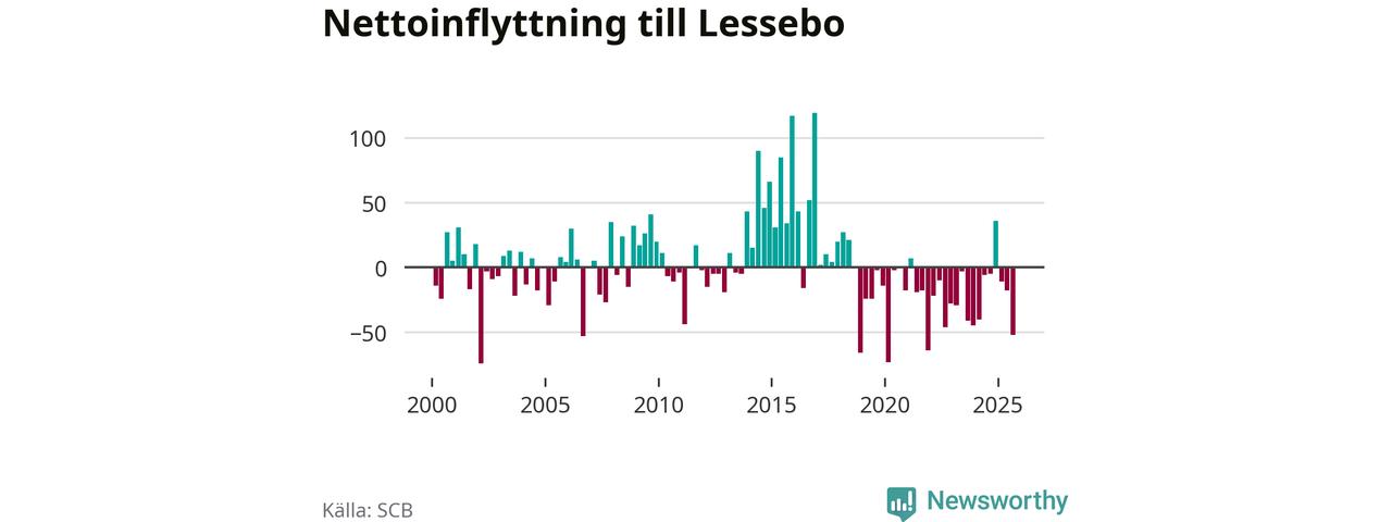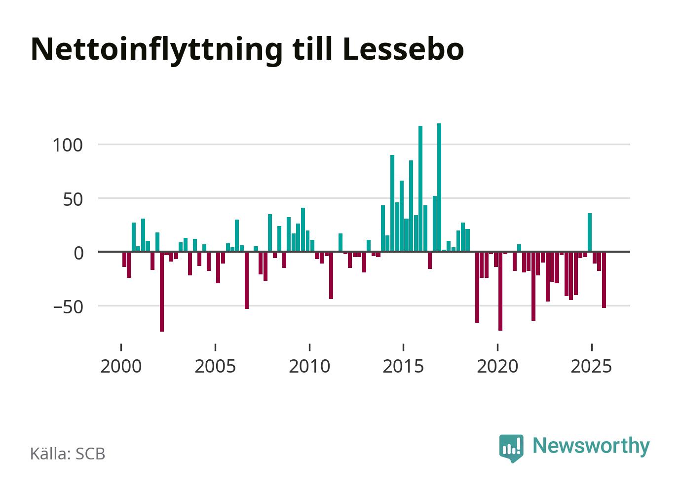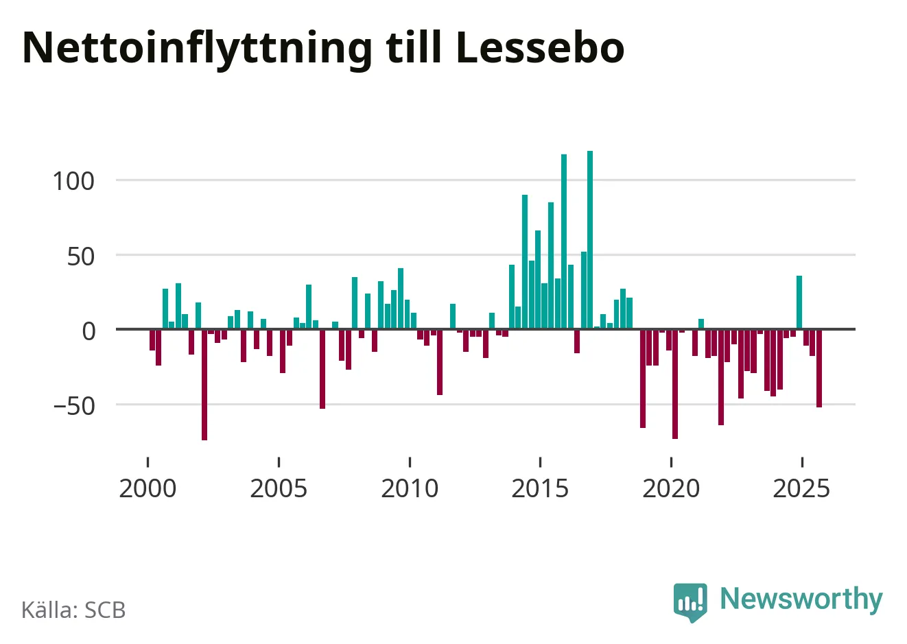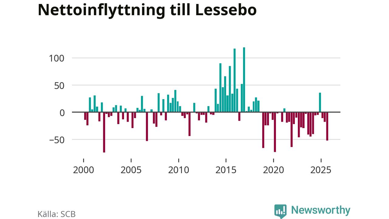Under tredje kvartalet 2025 flyttade 155 personer till kommunen medan 207 personer flyttade därifrån. Det är historiskt sett en stor utflyttning under ett kvartal. Sedan seklets början har Lessebo oftast haft ett negativt flyttnetto.