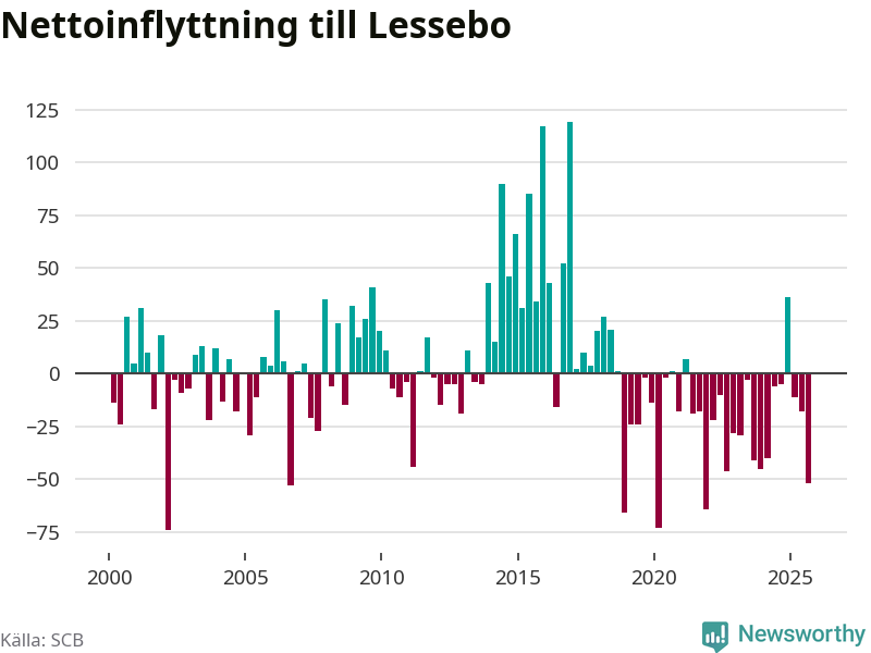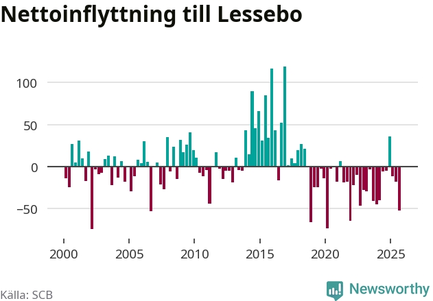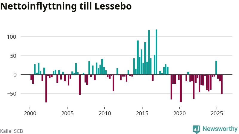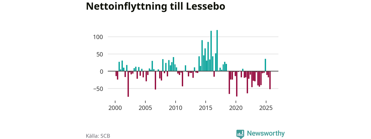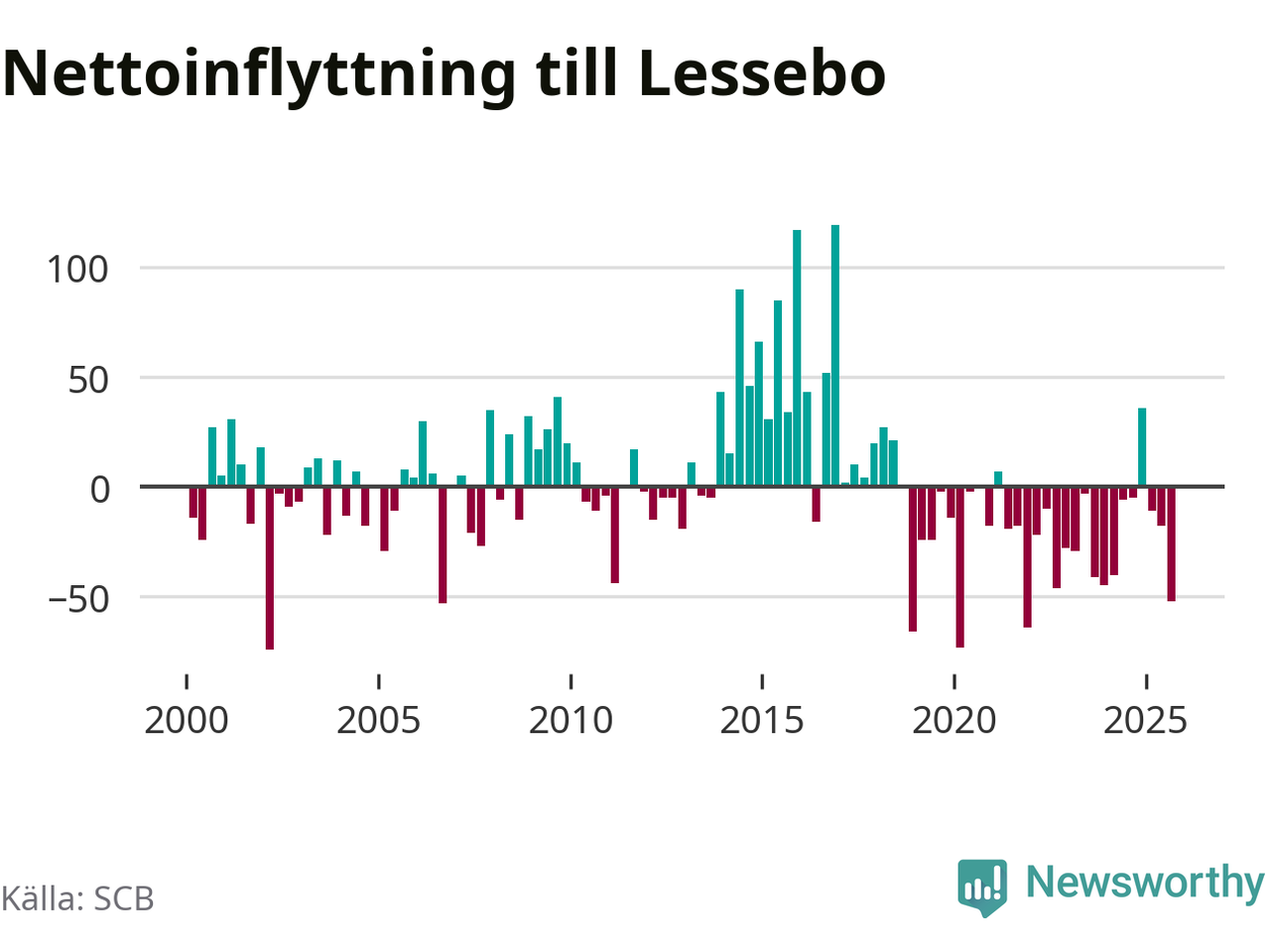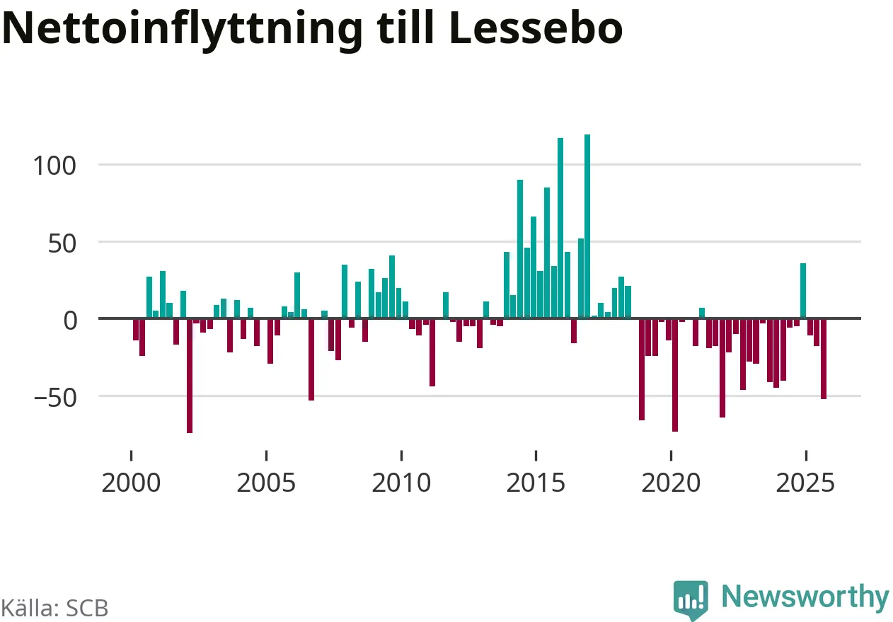 Under tredje kvartalet 2025 flyttade 155 personer till kommunen medan 207 personer flyttade därifrån. Det är historiskt sett en stor utflyttning under ett kvartal. Sedan seklets början har Lessebo oftast haft ett negativt flyttnetto.