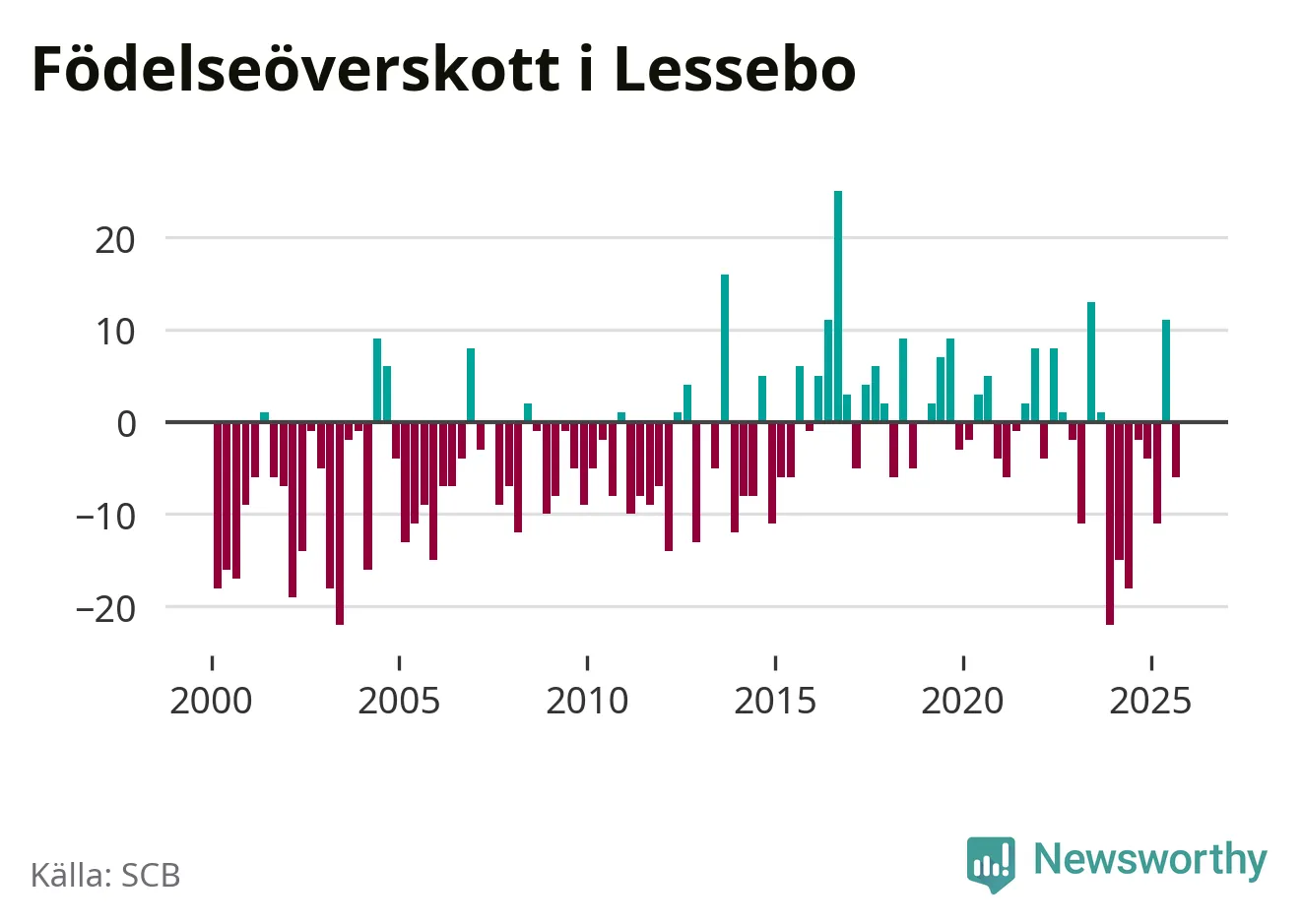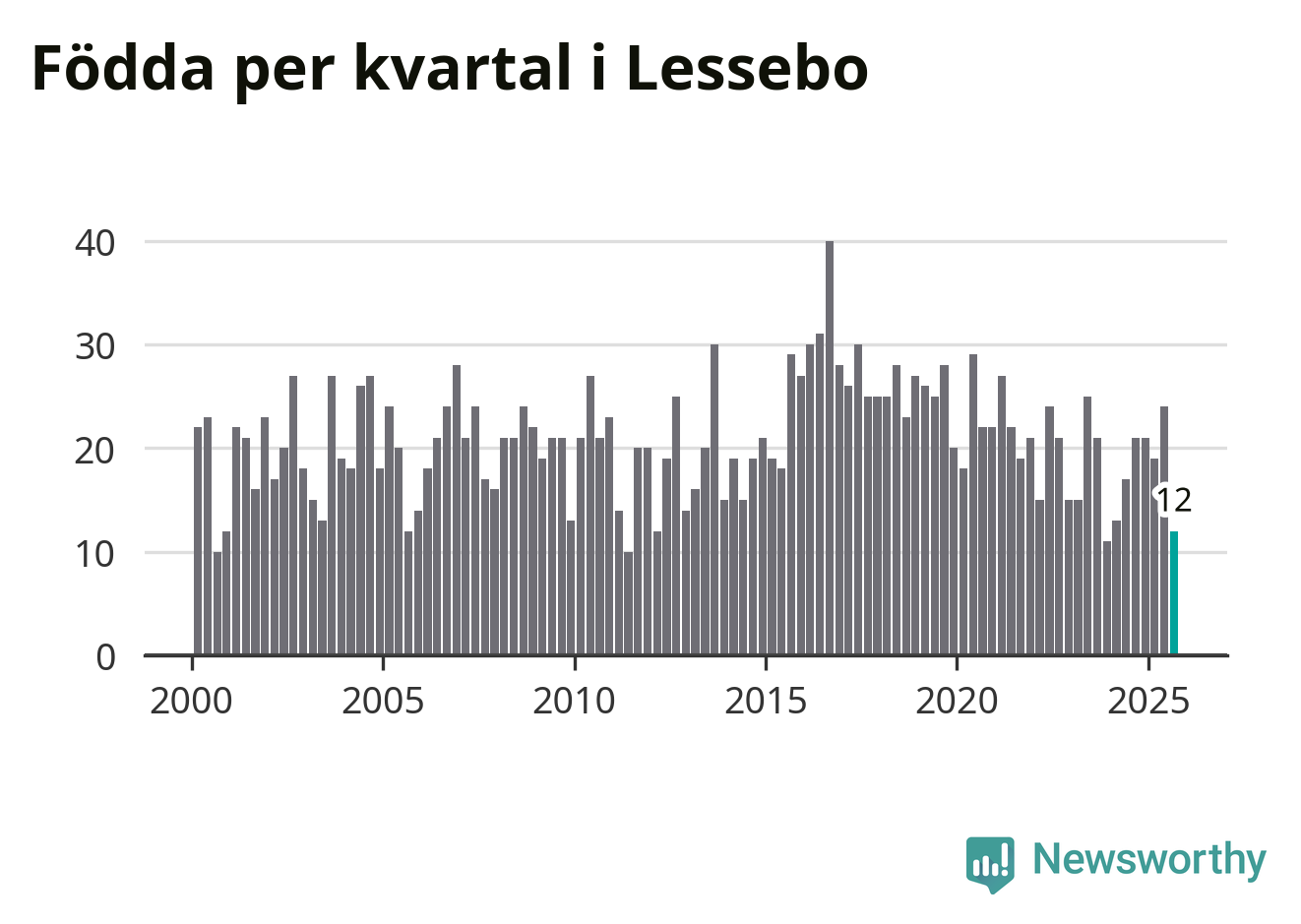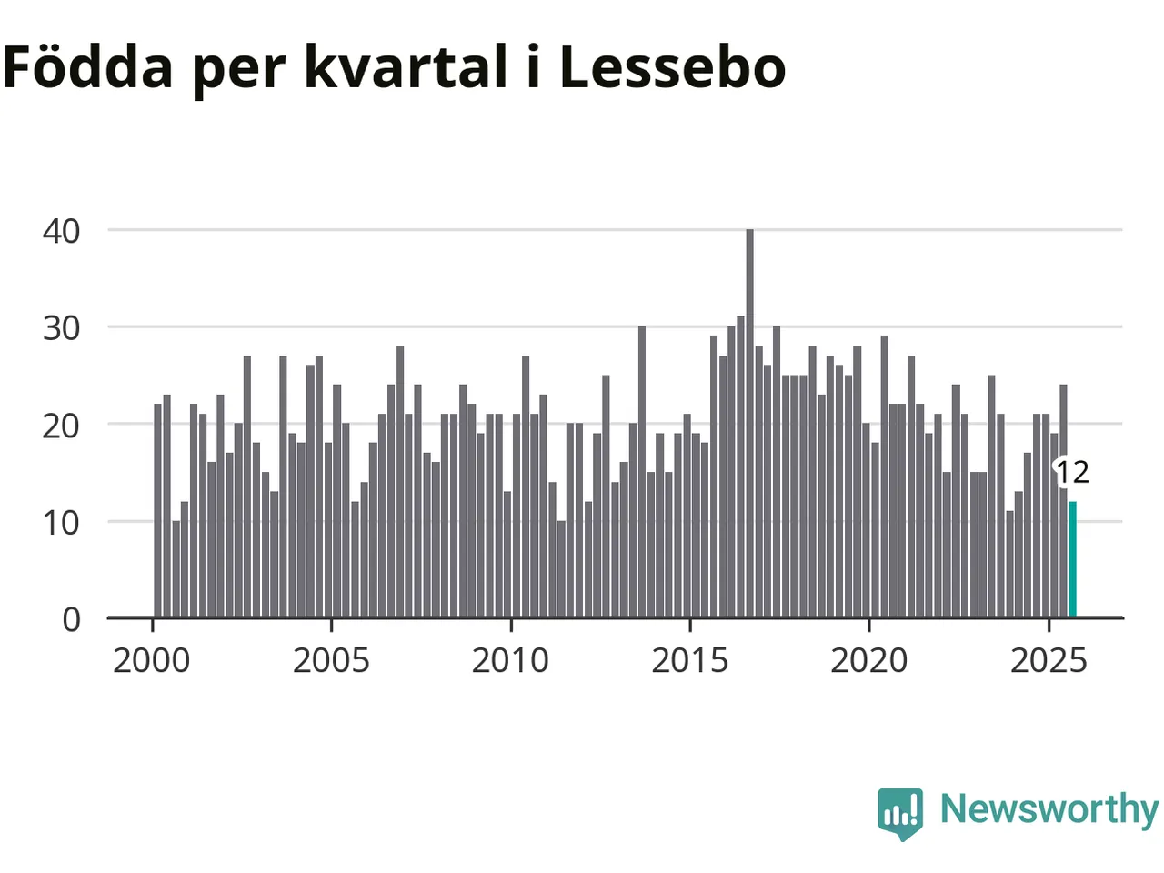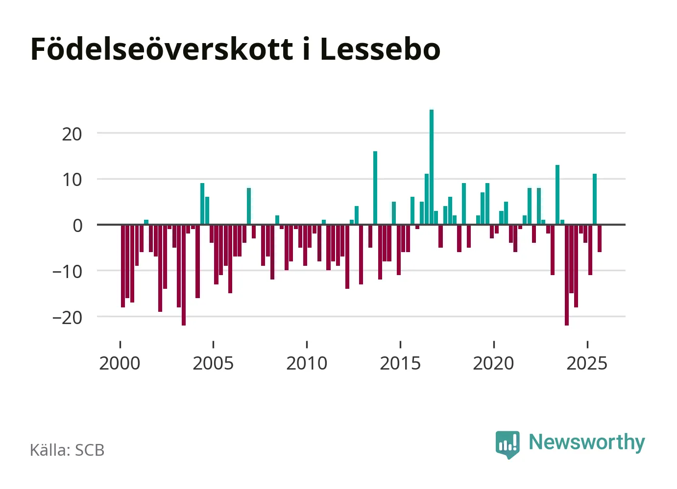 Enligt SCB:s siffror föddes tolv barn i Lessebo under det senaste kvartalet. Samtidigt avled 18 personer. Skillnaden mellan antal födda och döda är så liten att det inte går att säga om det beror på något annat än SCB:s röjandeskydd. Kommunen har historiskt sett haft ungefär lika många kvartal med positivt födelsenetto som negativt.