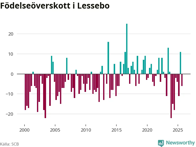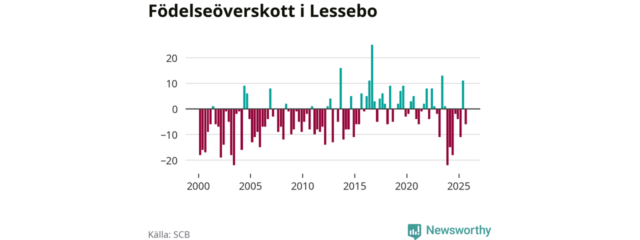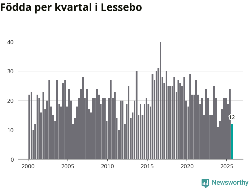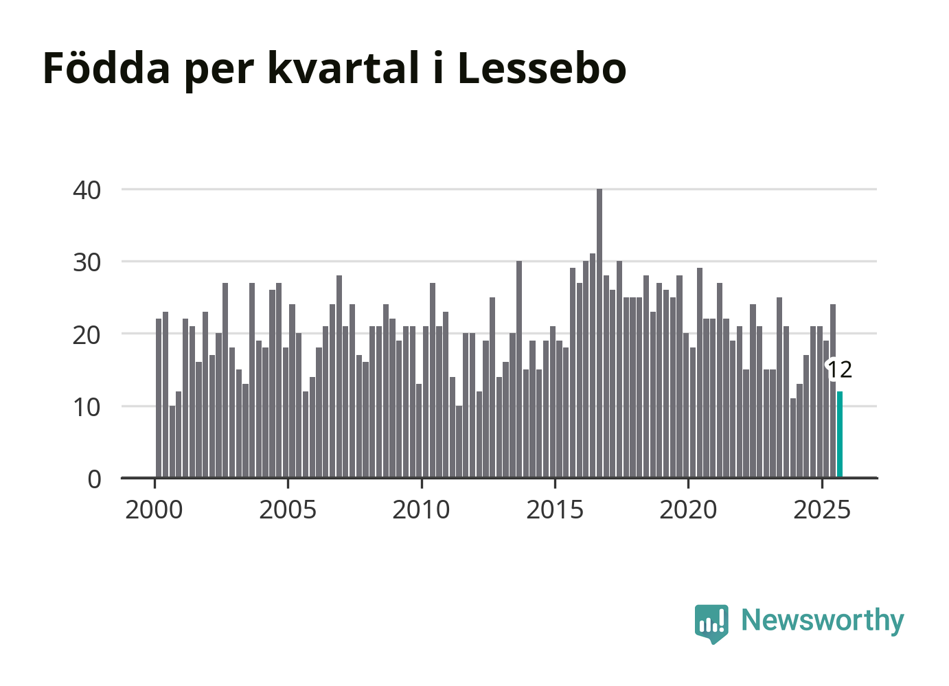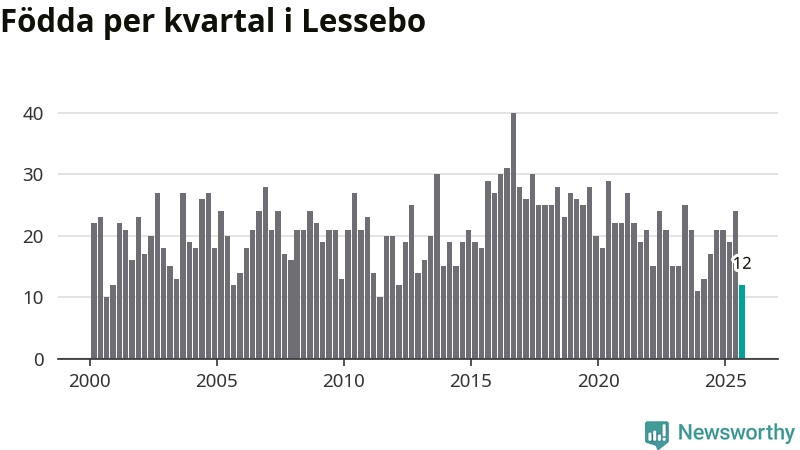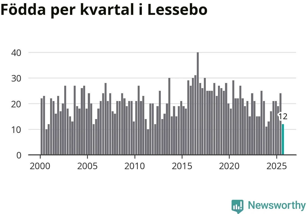 Enligt SCB:s siffror föddes tolv barn i Lessebo under det senaste kvartalet. Samtidigt avled 18 personer. Skillnaden mellan antal födda och döda är så liten att det inte går att säga om det beror på något annat än SCB:s röjandeskydd. Kommunen har historiskt sett haft ungefär lika många kvartal med positivt födelsenetto som negativt.