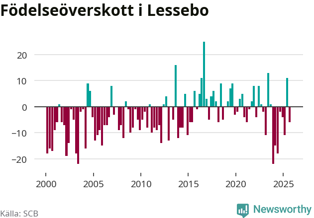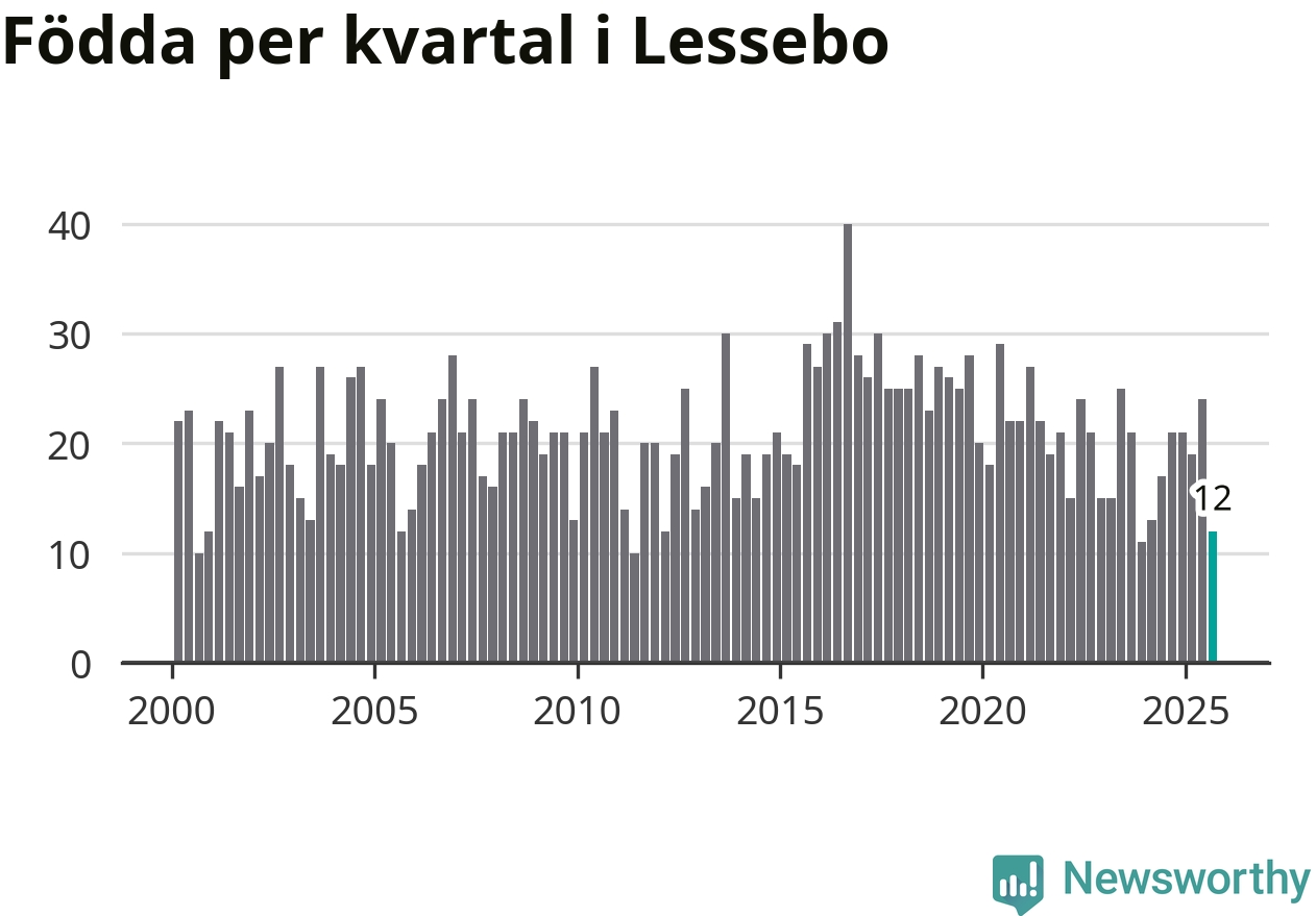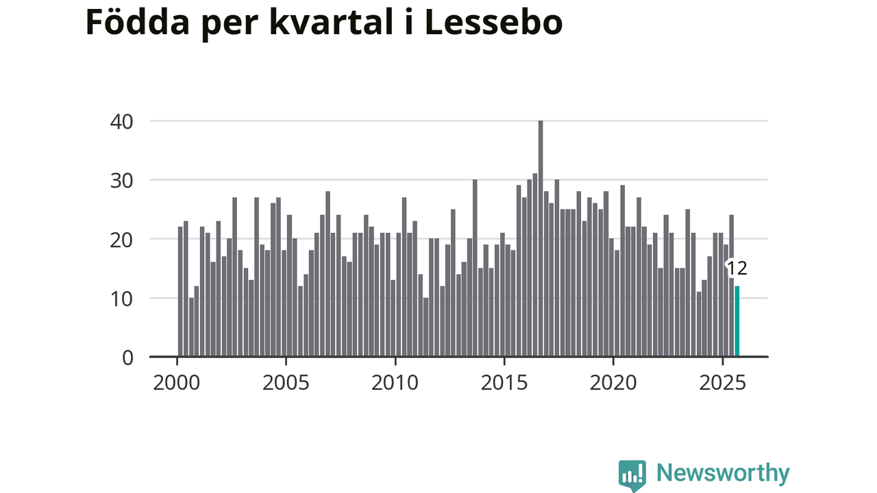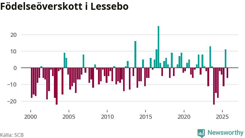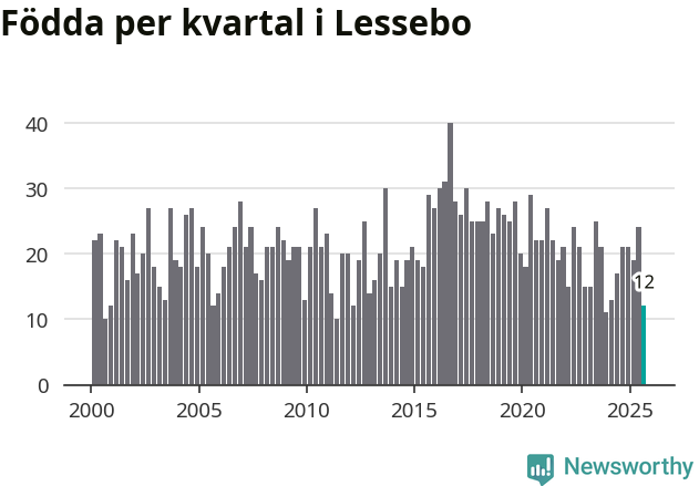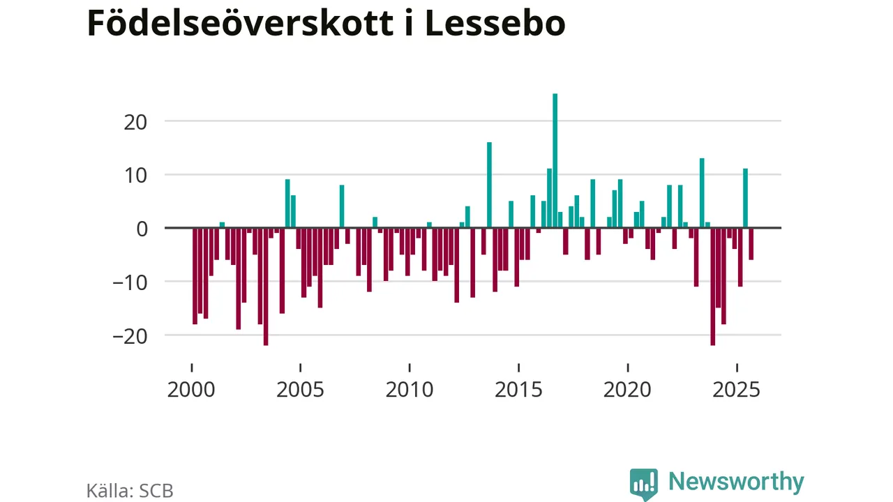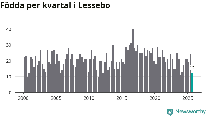 Enligt SCB:s siffror föddes tolv barn i Lessebo under det senaste kvartalet. Samtidigt avled 18 personer. Skillnaden mellan antal födda och döda är så liten att det inte går att säga om det beror på något annat än SCB:s röjandeskydd. Kommunen har historiskt sett haft ungefär lika många kvartal med positivt födelsenetto som negativt.