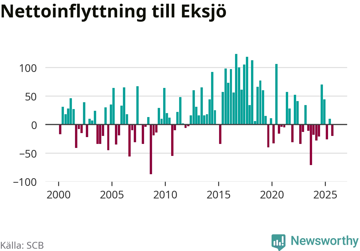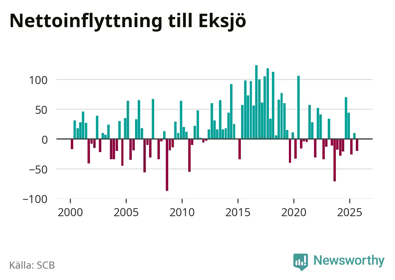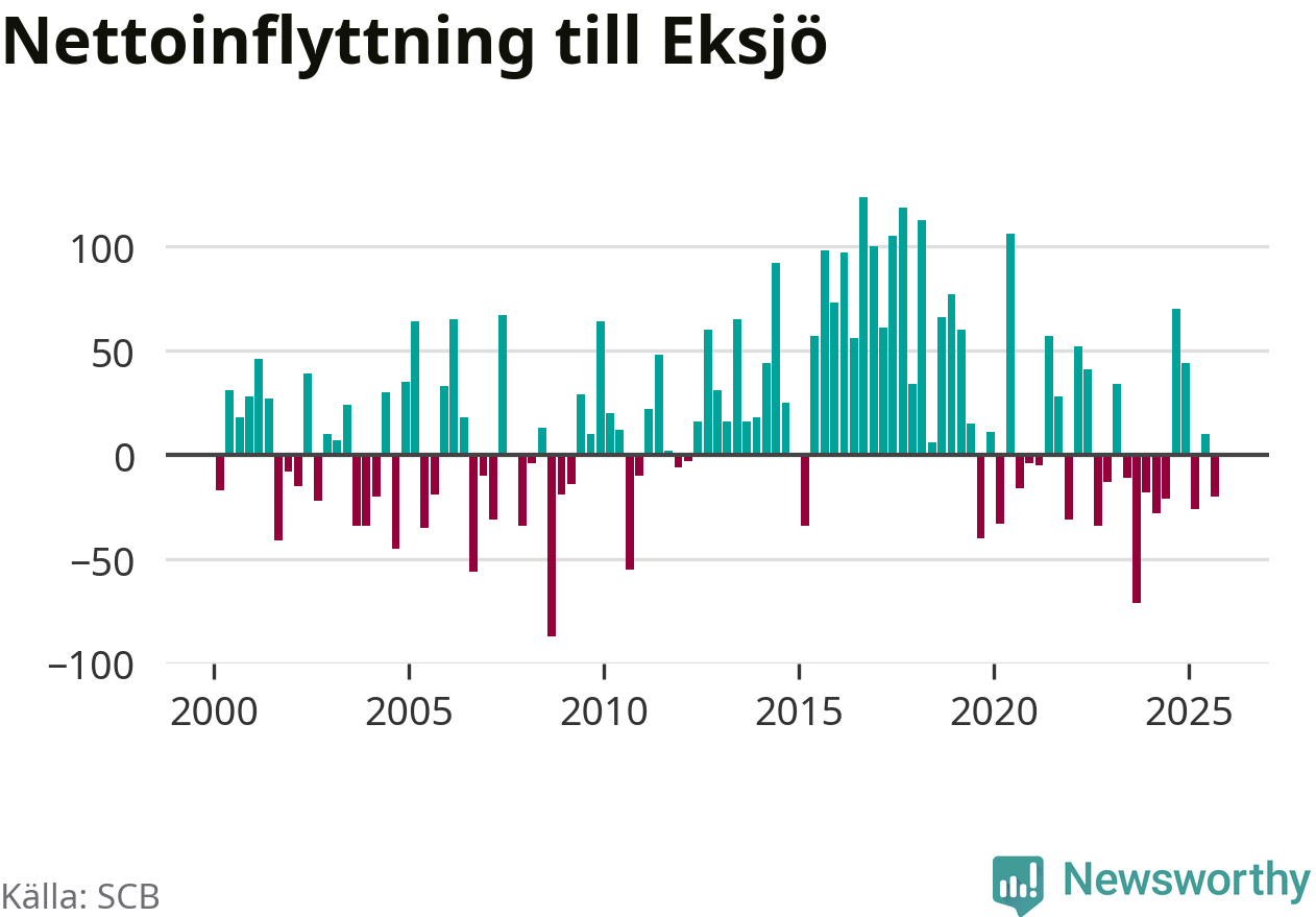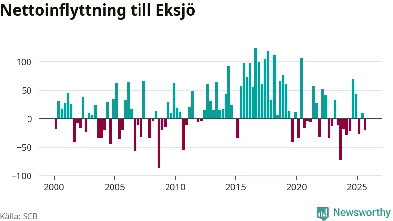 Under tredje kvartalet 2025 flyttade 274 personer till kommunen medan 294 personer flyttade därifrån. Sedan seklets början har Eksjö oftast haft ett positivt flyttnetto.