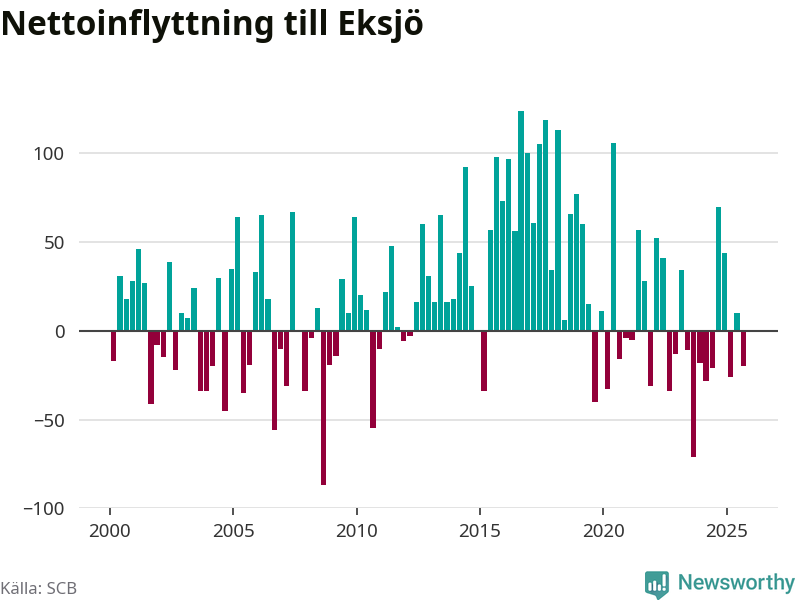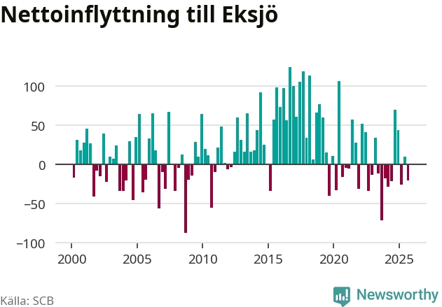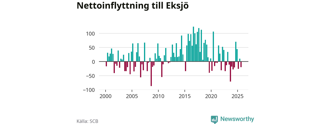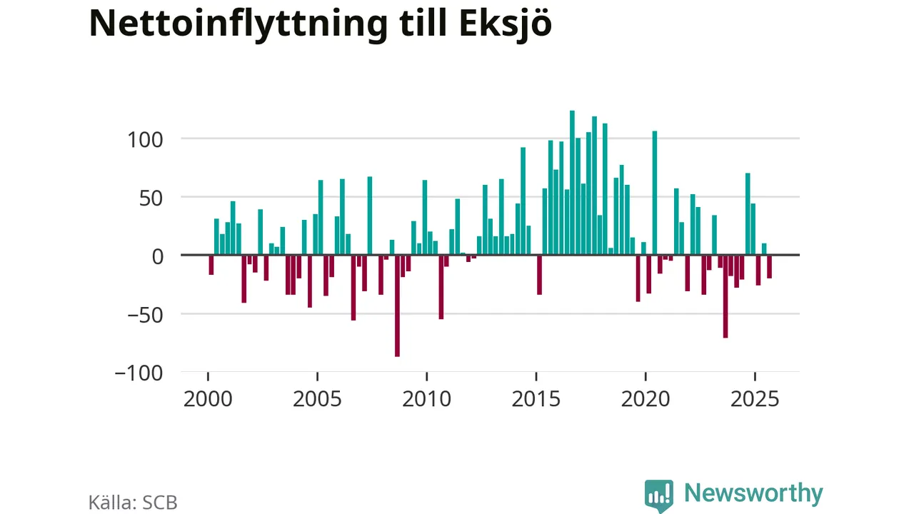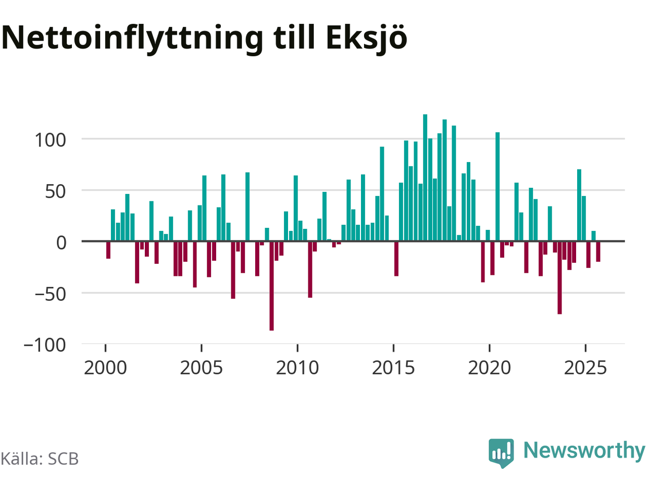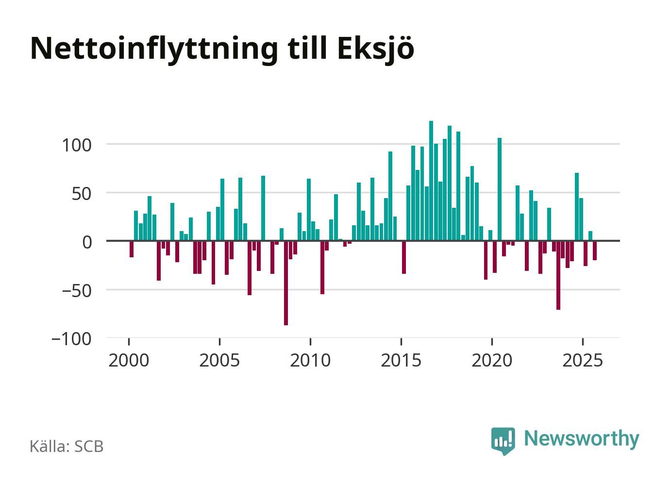 Under tredje kvartalet 2025 flyttade 274 personer till kommunen medan 294 personer flyttade därifrån. Sedan seklets början har Eksjö oftast haft ett positivt flyttnetto.