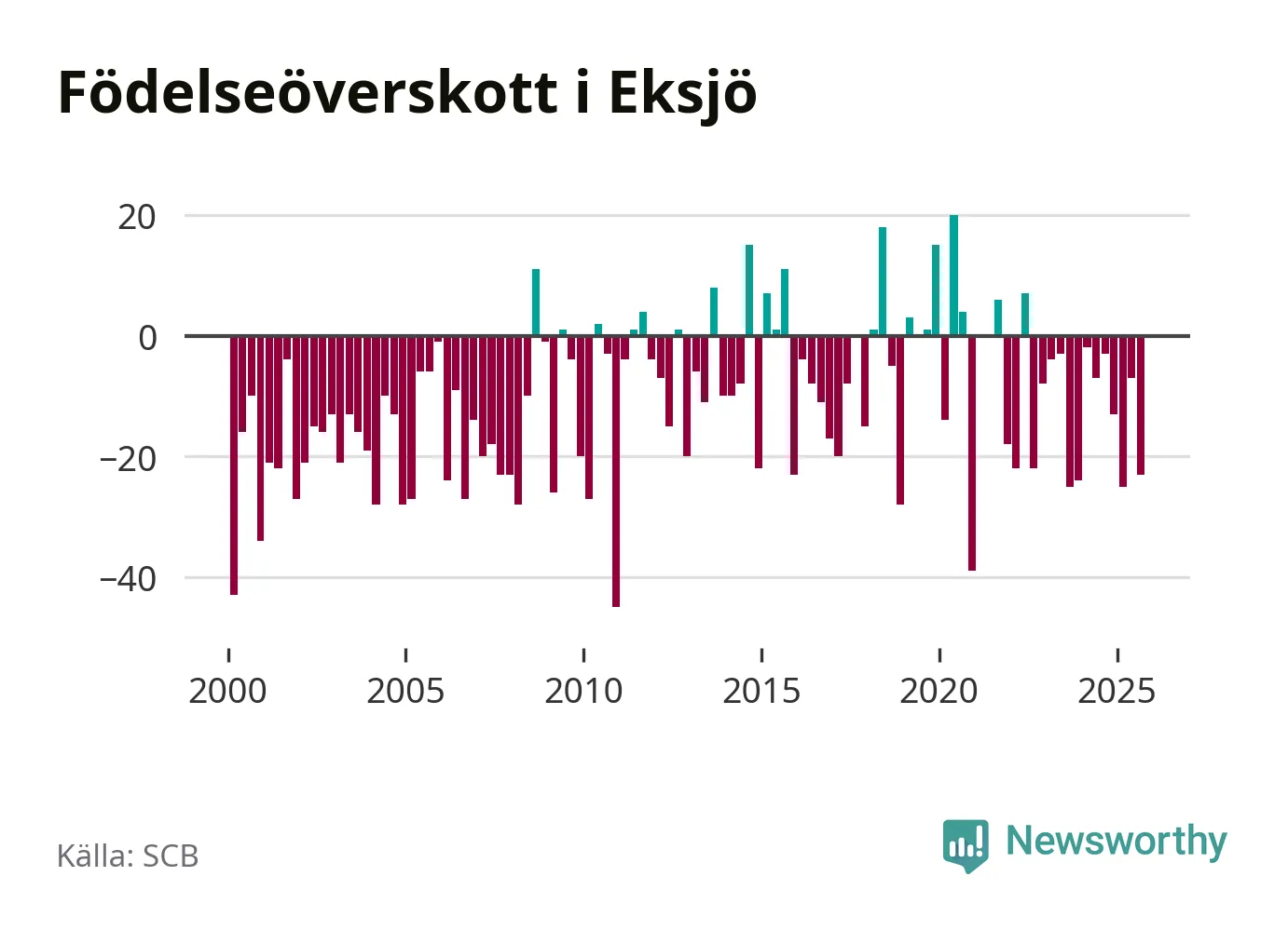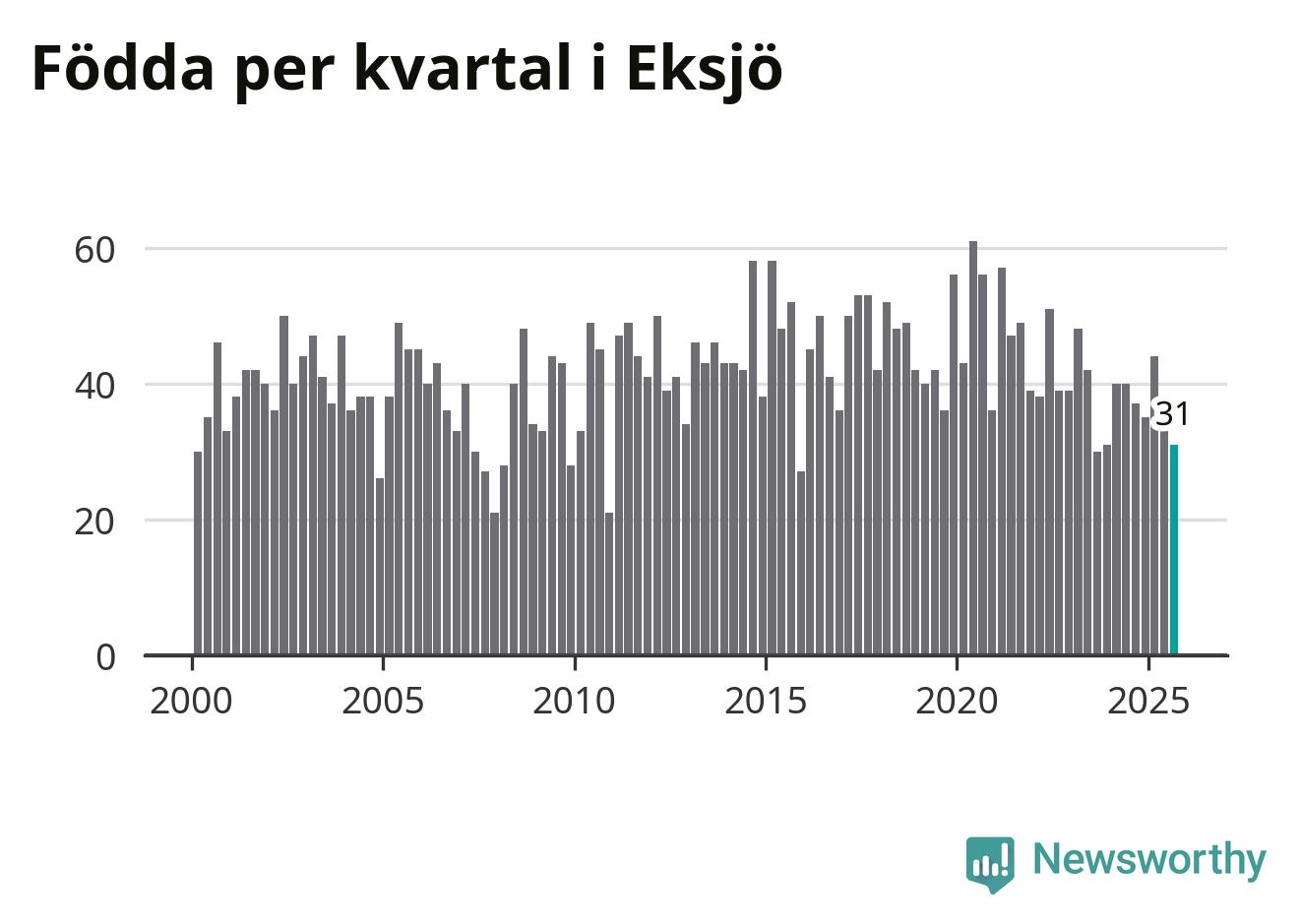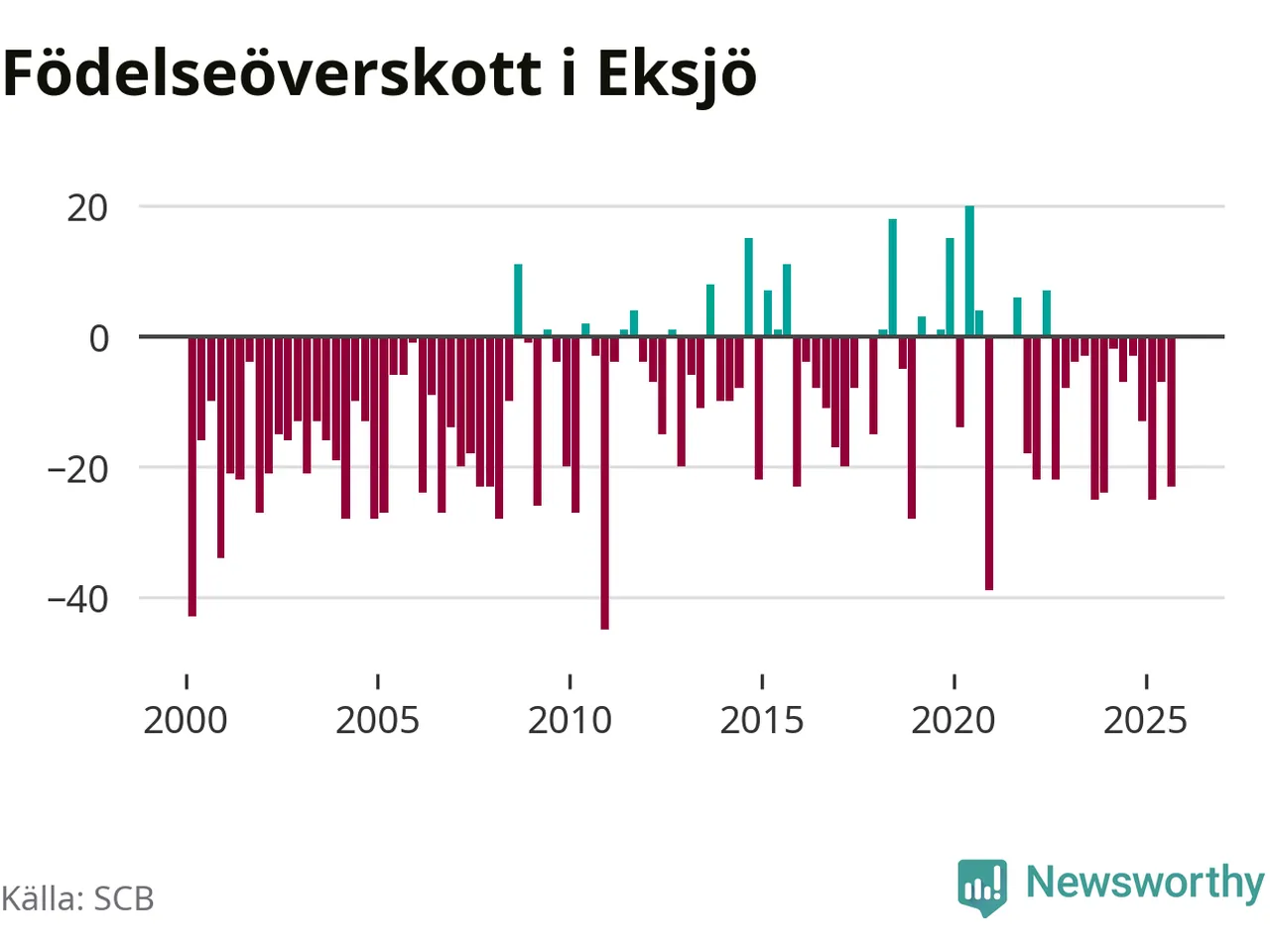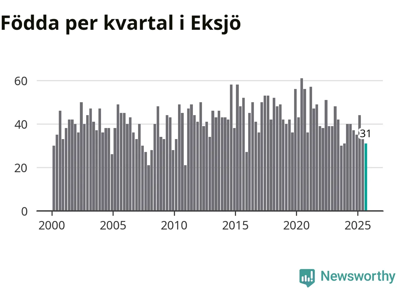 Enligt SCB:s siffror föddes 31 barn i Eksjö under det senaste kvartalet. Samtidigt avled 54 personer. Eksjö hade alltså ett negativt födelsenetto, vilket kommunen historiskt sett oftast har haft.