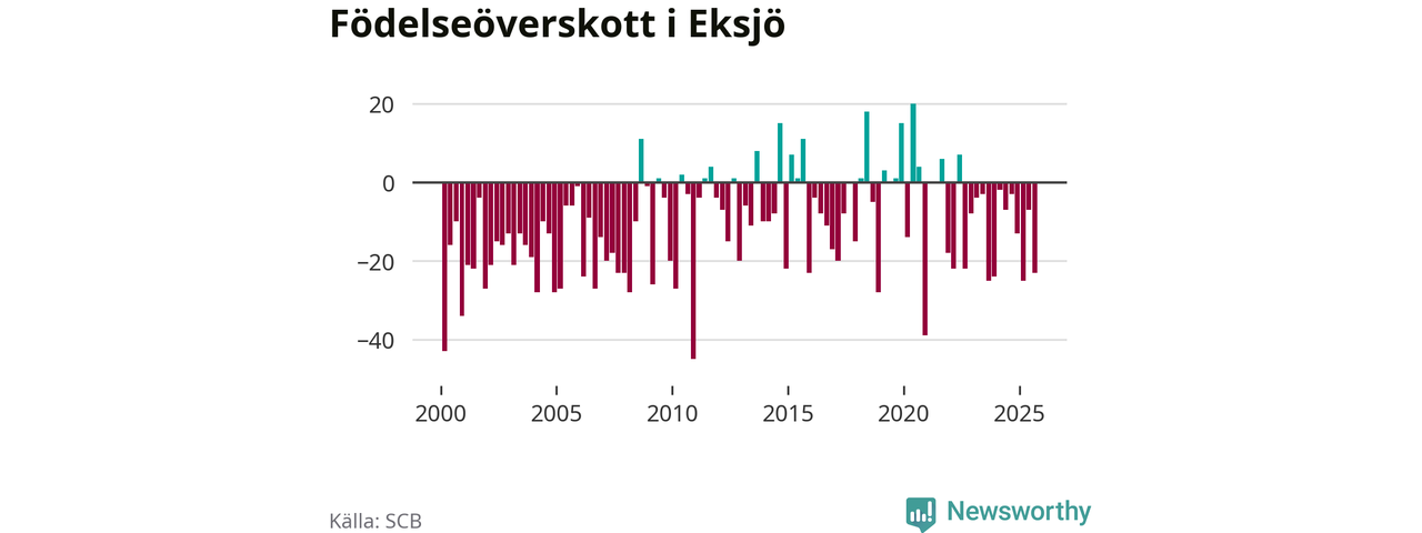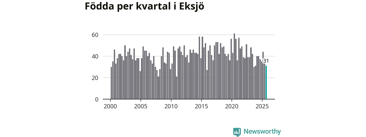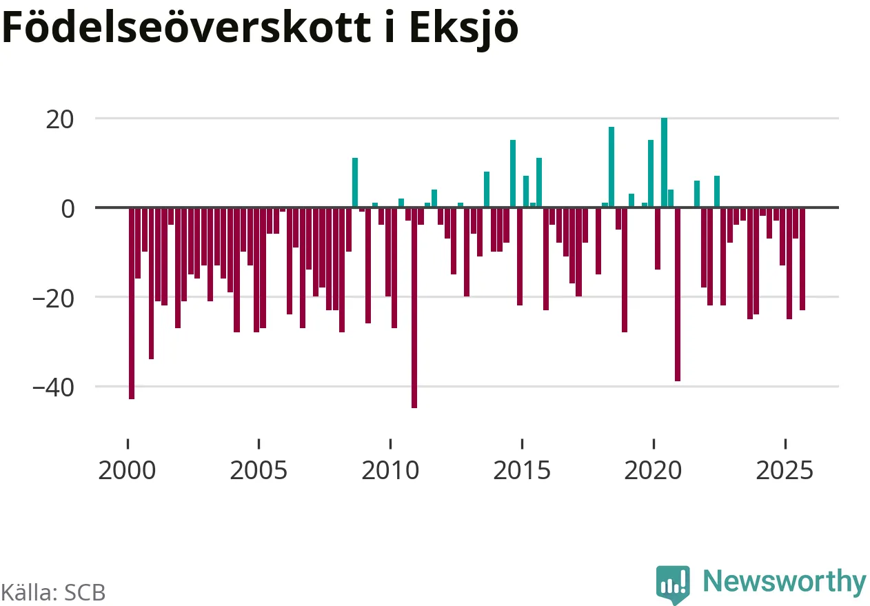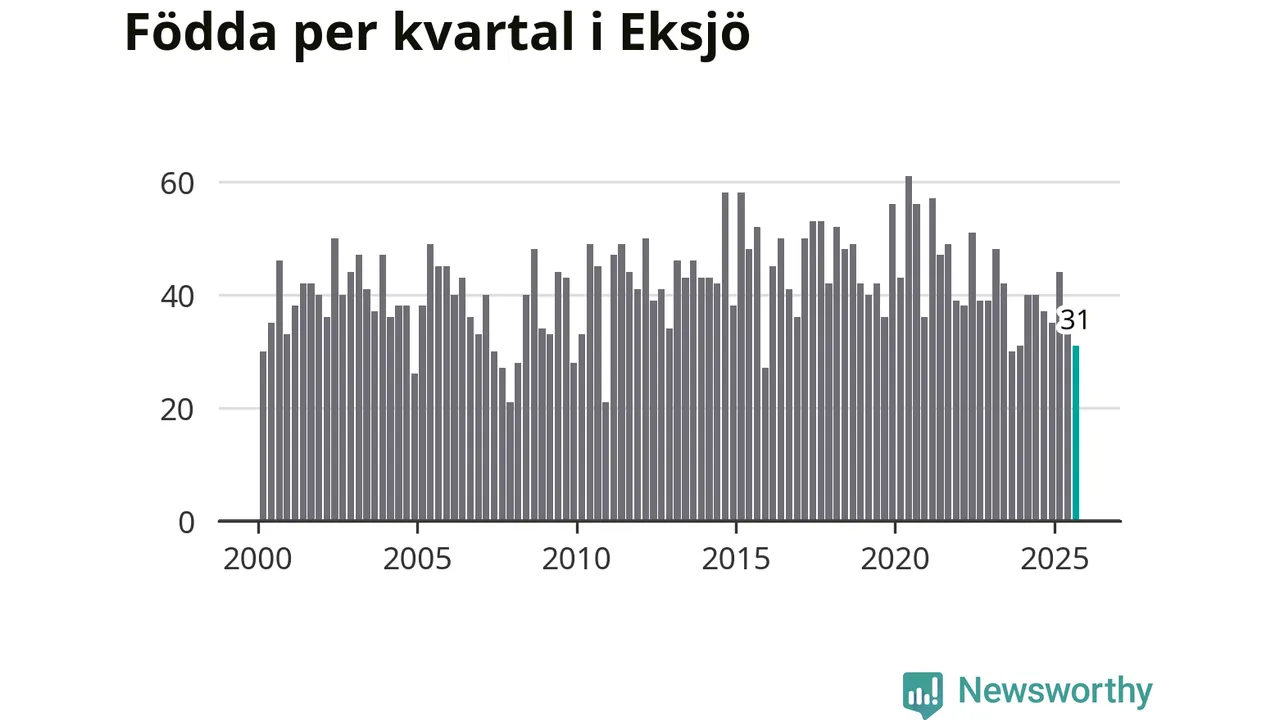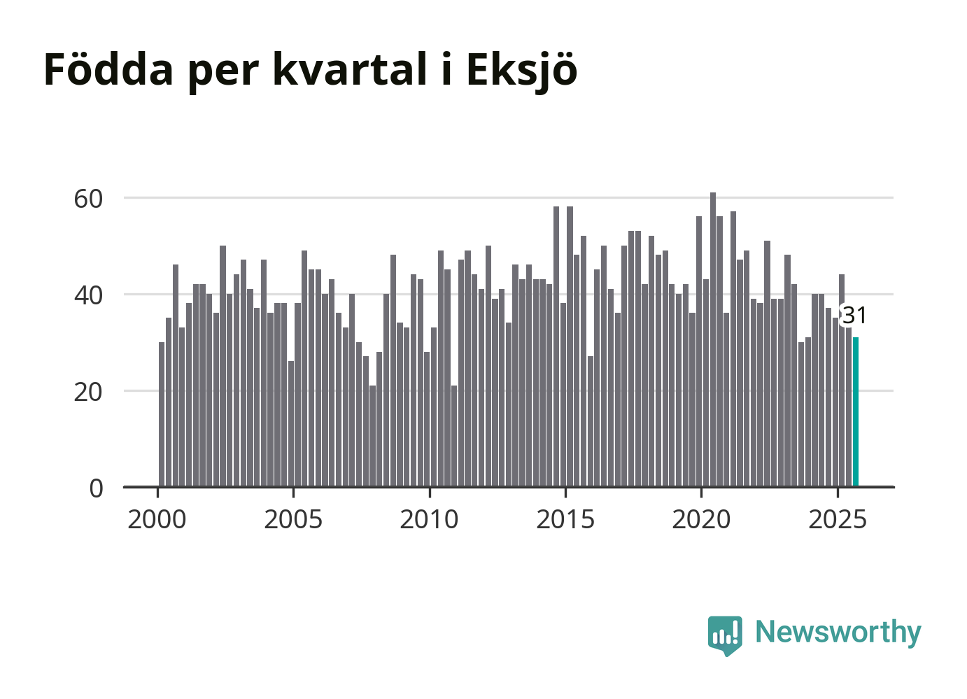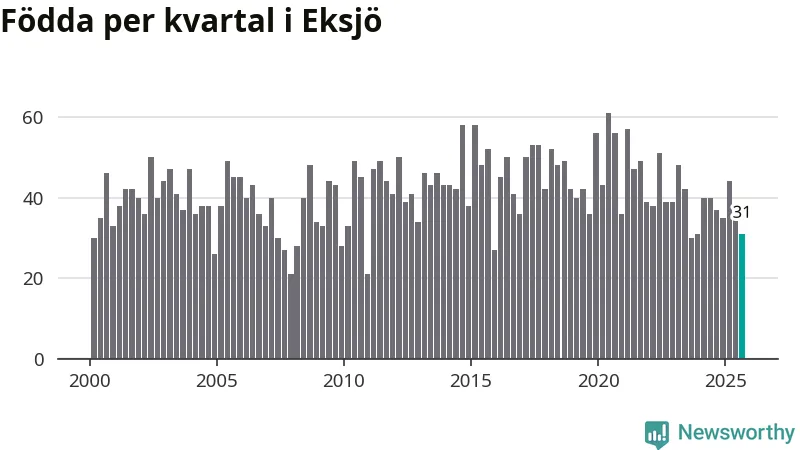 Enligt SCB:s siffror föddes 31 barn i Eksjö under det senaste kvartalet. Samtidigt avled 54 personer. Eksjö hade alltså ett negativt födelsenetto, vilket kommunen historiskt sett oftast har haft.